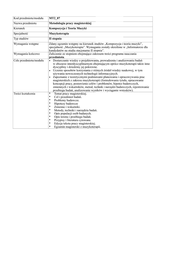 ! Kod przedmiotu/modułu MT2_07 Nazwa przedmiotu Metodologia pracy magisterskiej Kierunek Kompozycja i Teoria Muzyki Specjalność Muzykoterapia Typ studiów II stopnia Wymagania wstępne Zdany egzamin wstępny na kierunek studiów „Kompozycja i teoria muzyki”, specjalność „Muzykoterapia”. Wymagania zostały określone w „Informatorze dla kandydatów na studia stacjonarne II stopnia”. Zaliczenie ze stopniem obejmujące zakresem treści programu nauczania przedmiotu. • Dostarczanie wiedzy o projektowaniu, prowadzeniu i analizowaniu badań w obszarze interdyscyplinarnym obejmującym oprócz muzykoterapii także inne dyscypliny i dziedziny jej pokrewne. • Uczenie sposobów korzystania z różnych źródeł wiedzy naukowej, w tym używania nowoczesnych technologii informacyjnych. • Zapoznanie z teoretycznymi podstawami planowania i opracowywania prac magisterskich z zakresu muzykoterapii (formułowanie tytułu, opracowanie koncepcji pracy, postawienie celów i problemów, hipotez badawczych, zmiennych i wskaźników, metod, technik i narzędzi badawczych, rejestrowanie przebiegu badań, analizowanie wyników i wyciąganie wniosków). • Temat pracy magisterskiej. • Cel i przedmiot badań. • Problemy badawcze. • Hipotezy badawcze • Zmienne i wskaźniki. • Metody, techniki i narzędzia badań. • Opis populacji osób badanych. • Opis terenu i przebiegu badań. • Przypisy i literatura cytowana. • Edycja tekstu pracy magisterskiej. • Egzamin magisterski z muzykoterapii. Wymagania końcowe Cele przedmiotu/modułu Treści kształcenia Zamierzone efekty kształcenia Formy kształcenia (np. wykład/ćwiczenia/ inne) ! Punkty ECTS (nakład pracy studenta niezbędny do osiągnięcia zamierzonych efektów kształcenia) Kryteria oceny i sposoby weryfikacji Student po ukończeniu kursu w zakresie wiedzy: • posiada wiedzę dotyczącą swobodnego korzystania z różnorodnych mediów (książki, nagrania, materiały nutowe, Internet, nagrania archiwalne itp.) oraz umiejętność samodzielnego poszerzania i rozwijania wiedzy dotyczącej muzykoterapii [K2_W05]; • wykazuje się pogłębioną znajomością metodologii pracy naukowej [K2_W08]; w zakresie umiejętności: • potrafi wyszukiwać, analizować, oceniać, selekcjonować i integrować informacje z różnych źródeł oraz formułować na tej podstawie krytyczne sądy [K2_U04]; • posiada pogłębione umiejętności badawcze, obejmujące analizę prac innych autorów, syntezę różnych idei i poglądów, dobór metod i konstruowanie narzędzi badawczych, opracowanie i prezentację wyników, pozwalające na rozwiązywanie także nietypowych zadań oraz problemów związanych z muzykoterapią [K2_U07]; • kształtuje i rozwija indywidualne umiejętności twórcze i analityczne w zakresie muzykoterapii [K2_U09]; • kreuje własne techniki operowania materia muzyczną i potencjałem naukowym, poszerzające zdolności do tworzenia, realizowania i wyrażania własnych koncepcji [K2_U11]; • posiada umiejętność tworzenia metod zapisu oraz terminologii naukowej adekwatnych do przekazania oryginalnych idei oraz założeń koncepcyjnych [K2_U12]; • posiada umiejętność przygotowywania rozbudowanych prac pisemnych dotyczących zagadnień szczegółowych związanych z muzykoterapią, z wykorzystaniem podstawowych ujęć teoretycznych, a także różnych źródeł [K2_U18]; • posiada umiejętność przygotowywania rozbudowanych wystąpień ustnych, z wykorzystaniem technik multimedialnych dotyczących zagadnień szczegółowych związanych z muzykoterapią, z wykorzystaniem podstawowych ujęć teoretycznych, a także różnych źródeł [K2_U19]; w zakresie kompetencji społecznych: • rozumie potrzebę uczenia się przez całe życie i potrafi w sposób twórczy organizować proces kształcenia [K2_K01]; • potrafi inspirować i organizować proces uczenia się innych osób i posiada umiejętność selekcji doświadczeń i ich transformacji na potrzeby pracy własnej i zespołowej w ramach muzykoterapii [K2_K02]; • jest zdolny do samodzielnego integrowania nabytej wiedzy [K2_K05]; • jest zdolny do samodzielnego podejmowania w zorganizowany sposób nowych i kompleksowych działań, także w warunkach ograniczonego dostępu do potrzebnych informacji [K2_K06]; • posiada umiejętność krytycznej oceny prowadzącej do doskonalenia własnych dokonań na gruncie muzykoterapii [K2_K10]; • posiada umiejętność prezentowania w przystępnej formie skomplikowanych zadań muzykoterapeutycznych [K2_K15]. seminarium, zajęcia zbiorowe I Rok Semestr 1 Punkty ECTS 5 Ilość godzin w tygodniu Rodzaj zaliczenia 1 II 2 3 zst Legenda zst – zaliczenie ze stopniem frekwencja, • • aktywność, • egzamin ustny. III 4 5 6 Literatura • Apanowicz J., Metodologia nauk, Dom Organizatora, Toruń 2003. • Apanowicz J., Metodologiczne uwarunkowania pracy naukowej, Centrum doradztwa i Informacji Difin, Warszawa 2005. • Ciczkowski W., Prace promocyjne z pedagogiki. Skrypt uczestników seminariów: Język wykładowy licencjackiego, magisterskiego i doktoranckiego, Wydawnictwo Uniwersytetu Warmińsko-Mazurskiego, Olsztyn 2000. • Dudkiewicz W., Podstawy metodologii badań do pracy magisterskiej, licencjackiej z pedagogiki, wyd. V, Wydawnictwo Stachurski, Kielce 2001. • Gambarelli G., Łucki Z., Jak przygotować pracę dyplomową lub doktorską, Uniwersitas, Kraków 2001. • Łobocki M., Metody i techniki badań pedagogicznych, Oficyna Wydawnicza „Impuls”, Kraków 2000. • Łobocki M., Wprowadzenie do metodologii badań pedagogicznych, Oficyna Wydawnicza „Impuls”, Kraków 2001 • Pilch T., Bauman T., Zasady badań pedagogicznych. Strategie ilościowe i jakościowe, wydanie II, Wydawnictwo Akademickie „Żak”, Warszawa 2001. • Wojcik K., Piszę pracę magisterską. Przewodnik dla autorów akademickich prac promocyjnych (licencjackich, magisterskich, doktorskich), Oficyna Wydawnicza Szkoły Głównej H