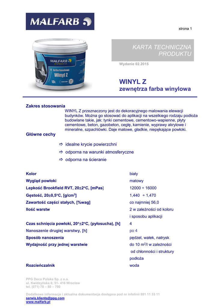 strona 1 KARTA TECHNICZNA PRODUKTU Wydanie 02.2015 WINYL Z zewnętrza farba winylowa Zakres stosowania WINYL Z przeznaczony jest do dekoracyjnego malowania elewacji budynków. Można go stosować do aplikacji na wszelkiego rodzaju podłoża budowlane takie, jak: tynki cementowe, cementowo-wapienne, płyty cementowe, beton, gazobeton, cegłę, kamienie, wyprawy akrylowe i mineralne, szpachlówki. Daje matowe, gładkie, niepękające powłoki. Główne cechy idealne krycie powierzchni odporna na warunki atmosferyczne odporna na ścieranie Kolor biały Wygląd powłoki matowy Lepkość Brookfield RVT, 202C, [mPas] 12000 ÷ 16000 Gęstość, 200,5C, [g/cm3] 1,440 ÷ 1,470 Zawartość części stałych, [%wag] co najmniej 56,0 Ilość warstw 2 w zależności od koloru i sposobu aplikacji Czas schnięcia powłoki, 202C, (pyłosucha), [h] 4 Nanoszenie drugiej warstwy, [h] po 4 Sposób nanoszenia pędzel, wałek, natrysk Wydajność przy jednej warstwie do 10 m2/l w zależności od chłonności i struktury podłoża Rozcieńczalnik woda PPG Deco Polska Sp. z o.o. ul. Kwidzyńska 8; 51- 416 Wrocław tel. (071) 78 – 80 – 700 Dodatkowe informacje i aktualna dokumentacja dostępna pod nr infolinii 801 11 33 11 [email protected] www.malfarb.pl strona 2 Sposób użycia 1.Przygotowanie podłoża Podłoże powinno być suche, oczyszczone z kurzu i brudu oraz tłustych plam. Przed malowaniem należy zagruntować podłoże preparatem gruntującym Reno Grunt, a w przypadku wysokiej chłonności podłoża preparatem Aktiv Grunt. Powierzchnie pomalowane wcześniej farbami klejowymi należy dokładnie oczyścić do odsłonięcia właściwego podłoża, natomiast powierzchnie pokryte farbami emulsyjnymi zmyć wodą z dodatkiem detergentów. Uwaga!: • Tynki oraz wszelkiego typu produkty zawierające cement i wapno wymagają okresu karbonizacji (28 dni). • Pominięcie w wykonawstwie okresu karbonizacji grozi całkowitym zniszczeniem powłoki nakładanej farby. • Malując zbyt słabe podłoże ryzykują Państwo powstawanie pęcherzy i łuszczenie się farby. Zbyt chłonne podłoże drastycznie obniża wydajność, co powoduje zwiększenie kosztów malowania. 2. Malowanie • Przygotowanie produktu: Farbę należy zawsze przed użyciem dokładnie wymieszać (nie stosować szybkoobrotowych mieszadeł). Do malowania pierwszej warstwy można rozcieńczyć farbę wodą (max 5%). Drugą warstwę maluje się farbą nie rozcieńczoną. WINYL Z może być nanoszony wszystkimi rodzajami narzędzi malarskich (pędzel, wałek, natrysk), przy czym do malowania pędzlem należy rozcieńczyć farbę wodą pitną (ok. 0,05-0,10 litra wody na 1 litr farby); w szczególności na powierzchniach o znacznej porowatości. Do osiągnięcia wymaganego efektu dekoracyjnego zazwyczaj potrzebne jest dwukrotne malowanie. Unikać malowania przy mocnym bezpośrednim nasłonecznieniu. W przypadku niekorzystnych warunków atmosferycznych stosować siatki osłonowe. 3. Dodatkowe informacje Po zakończeniu malowania narzędzia umyj wodą. Wyrób nie stanowi części komputerowego systemu kolorowania Malfarb. 4. Wskazówki BHP i PPOŻ Stosować się do zaleceń podanych na opakowaniu. Szczegółowe informacje zamieszczone są w Karcie Charakterystyki. Atesty: Posiada Atest Higieniczny PKWiU: 20.30.11.0 Data ważności: 36 miesięcy od daty produkcji Limit zawartości LZO wg Dyrektywy 2004/42/WE (kat.A/c/FW): 40 g/l (2010). PPG Deco Polska Sp. z o.o. ul. Kwidzyńska 8; 51- 416 Wrocław tel. (071) 78 – 80 – 700 Dodatkowe informacje i aktualna dokumentacja dostępna pod nr infolinii 801 11 33 11 [email protected] www.malfarb.pl strona 3 Produkt zawiera max. 40 g/l. Opakowanie handlowe 1L, 3L, 5L, 10L PPG Deco Polska Sp. z o.o. ul. Kwidzyńska 8; 51- 416 Wrocław tel. (071) 78 – 80 – 700 Dodatkowe informacje i aktualna dokumentacja dostępna pod nr infolinii 801 11 33 11 [email protected] www.malfarb.pl