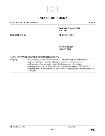 UNIA EUROPEJSKA RADA PARLAMENT EUROPEJSKI Bruksela, 5 marca 2014 r. (OR. en) 2012/0361 (COD) PE-CONS 138/13 AVIATION 257 CODEC 3018 AKTY USTAWODAWCZE I INNE INSTRUMENTY ROZPORZĄDZENIE PARLAMENTU EUROPEJSKIEGO I RADY w Dotyczy: sprawie zgłaszania i analizy zdarzeń w lotnictwie cywilnym oraz podejmowanych w związku z nimi działań następczych, zmiany rozporządzenia (UE) nr 996/2010 oraz uchylenia dyrektywy 2003/42/WE, rozporządzenia Komisji (WE) nr 1321/2007 i rozporządzenia Komisji (WE) nr 1330/2007 PE-CONS 138/13 KAD/akr DGE 2 PL ROZPORZĄDZENIE PARLAMENTU EUROPEJSKIEGO I RADY (UE) nr …/2014 z dnia w sprawie zgłaszania i analizy zdarzeń w lotnictwie cywilnym oraz podejmowanych w związku z nimi działań następczych, zmiany rozporządzenia (UE) nr 996/2010 oraz uchylenia dyrektywy 2003/42/WE, rozporządzenia Komisji (WE) nr 1321/2007 i rozporządzenia Komisji (WE) nr 1330/2007 (Tekst mający znaczenie dla EOG) PARLAMENT EUROPEJSKI I RADA UNII EUROPEJSKIEJ, uwzględniając Traktat o funkcjonowaniu Unii Europejskiej, w szczególności jego art. 100 ust. 2, uwzględniając wniosek Komisji Europejskiej, po przekazaniu projektu aktu ustawodawczego parlamentom narodowym, uwzględniając opinię Europejskiego Komitetu Ekonomiczno-Społecznego 1, po konsultacji z Komitetem Regionów, stanowiąc zgodnie ze zwykłą procedurą ustawodawczą 2, 1 2 Dz.U. C 198 z 10.7.2013, s. 73. Stanowisko Parlamentu Europejskiego z dnia 26 lutego 2014 r. (dotychczas nieopublikowane w Dzienniku Urzędowym) oraz decyzja Rady z dnia … . PE-CONS 138/13 KAD/akr DGE 2 1 PL a także mając na uwadze, co następuje: (1) Należy zapewnić wysoki ogólny poziom bezpieczeństwa w lotnictwie cywilnym w Unii oraz dołożyć wszelkich starań w celu zmniejszenia liczby wypadków i incydentów, z myślą o zapewnieniu publicznego zaufania do transportu lotniczego. (2) Wskaźnik częstości wypadków śmiertelnych w lotnictwie cywilnym nie zmienił się znacząco w ciągu ostatniego dziesięciolecia. Niemniej jednak liczba wypadków mogłaby wzrosnąć w nadchodzących dziesięcioleciach z uwagi na wzrost ruchu powietrznego oraz większą złożoność techniczną statków powietrznych. (3) Celem rozporządzenia Parlamentu Europejskiego i Rady (UE) nr 996/2010 1 jest zapobieganie wypadkom poprzez ułatwienie prowadzenia szybkich, skutecznych i wysokiej jakości badań zdarzeń lotniczych. Niniejsze rozporządzenie nie powinno zakłócać procesu badania wypadków i incydentów zarządzanego przez krajowe organy ds. badania zdarzeń lotniczych, określonego w rozporządzeniu (UE) nr 996/2010. W razie wypadku lub poważnego incydentu, powiadomienie o zdarzeniu podlega także rozporządzeniu (UE) nr 996/2010. 1 Rozporządzenie Parlamentu Europejskiego i Rady (UE) nr 996/2010 z dnia 20 października 2010 r. w sprawie badania wypadków i incydentów w lotnictwie cywilnym oraz zapobiegania im oraz uchylające dyrektywę 94/56/WE (Dz.U. L 295 z 12.11.2010, s. 35). PE-CONS 138/13 KAD/akr DGE 2 2 PL (4) Istniejące unijne akty prawne, w szczególności rozporządzenie Parlamentu Europejskiego i Rady (WE) nr 216/2008 1 oraz przepisy wykonawcze do niego, nakładają na niektóre organizacje obowiązek ustanowienia systemów zgłaszania zdarzeń w kontekście ich systemu zarządzania bezpieczeństwem. Przestrzeganie przepisów rozporządzenia (WE) nr 216/2008 i przepisów wykonawczych do niego nie powinno zwalniać organizacji z obowiązku zapewnienia zgodności z niniejszym rozporządzeniem. Podobnie przestrzeganie przepisów niniejszego rozporządzenia nie powinno zwalniać organizacji z obowiązku zapewnienia zgodności z rozporządzeniem (WE) nr 216/2008 i przepisami wykonawczymi do niego. Jednakże nie powinno to prowadzić do utworzenia dwóch równoległych systemów zgłaszania zdarzeń, a rozporządzenie (WE) nr 216/2008, rozporządzenia wykonawcze do niego oraz niniejsze rozporządzenie należy uważać za uzupełniające się. (5) Doświadczenie pokazuje, że wypadki są często poprzedzone incydentami związanymi z bezpieczeństwem oraz uchybieniami wskazującymi na istnienie zagrożeń dla bezpieczeństwa., Informacje dotyczące bezpieczeństwa są zatem ważnym źródłem wiedzy potrzebnej do wykrywania potencjalnych zagrożeń dla bezpieczeństwa. Ponadto, chociaż zdolność wyciągania wniosków z wypadku ma zasadnicze znaczenie, systemy oparte wyłącznie na reagowaniu uznano za mające ograniczone zastosowanie w zakresie dalszej poprawy bezpieczeństwa. Systemy oparte na reagowaniu powinny w związku z tym zostać uzupełnione systemami proaktywnymi, które wykorzystują inne rodzaje informacji dotyczących bezpieczeństwa, aby dokonać skutecznych usprawnień w obszarze bezpieczeństwa lotniczego. Unia, jej państwa członkowskie, Europejska Agencja Bezpieczeństwa Lotniczego („Agencja”) oraz organizacje powinny przyczyniać się do poprawy bezpieczeństwa lotniczego poprzez wprowadzenie bardziej proaktywnych i opartych na dowodach systemów w zakresie bezpieczeństwa, w których nacisk położony jest na zapobieganiu wypadkom w oparciu o analizę wszystkich stosownych informacji dotyczących bezpieczeństwa, w tym informacji o zdarzeniach w lotnictwie cywilnym. 1 Rozporządzenie Parlamentu Europejskiego i Rady (WE) nr 216/2008 z dnia 20 lutego 2008 r. w sprawie wspólnych zasad w zakresie lotnictwa cywilnego i utworzenia Europejskiej Agencji Bezpieczeństwa Lotniczego oraz uchylające dyrektywę Rady 91/670/EWG, rozporządzenie (WE) nr 1592/2002 i dyrektywę 2004/36/WE (Dz.U. L 79 z 19.3.2008, s. 1). PE-CONS 138/13 KAD/akr DGE 2 3 PL (6) W celu poprawy poziomu bezpieczeństwa lotniczego należy zgłaszać, gromadzić, przechowywać, chronić, wymieniać, udostępniać i analizować stosowne informacje dotyczące bezpieczeństwa lotnictwa cywilnego oraz podejmować odpowiednie działania w zakresie bezpieczeństwa na podstawie zgromadzonych informacji. To proaktywne i oparte na dowodach podejście pow