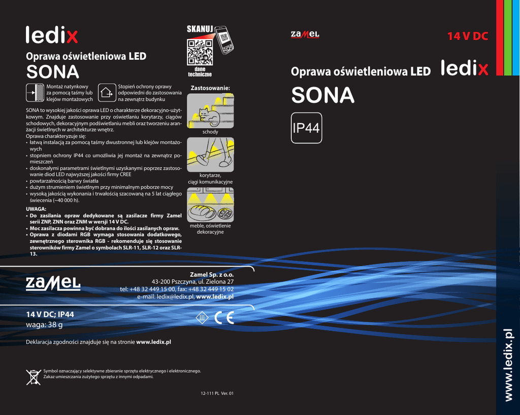 SKANUJ 14 V DC Oprawa oświetleniowa LED SONA Montaż natynkowy za pomocą taśmy lub klejów montażowych dane techniczne Stopień ochrony oprawy odpowiedni do zastosowania na zewnątrz budynku SONA to wysokiej jakości oprawa LED o charakterze dekoracyjno-użytkowym. Znajduje zastosowanie przy oświetlaniu korytarzy, ciągów schodowych, dekoracyjnym podświetlaniu mebli oraz tworzeniu aranżacji świetlnych w architekturze wnętrz. Oprawa charakteryzuje się: • łatwą instalacją za pomocą taśmy dwustronnej lub klejów montażowych • stopniem ochrony IP44 co umożliwia jej montaż na zewnątrz pomieszczeń • doskonałymi parametrami świetlnymi uzyskanymi poprzez zastosowanie diod LED najwyższej jakości firmy CREE • powtarzalnością barwy światła • dużym strumieniem świetlnym przy minimalnym poborze mocy • wysoką jakością wykonania i trwałością szacowaną na 5 lat ciągłego świecenia (~40 000 h). UWAGA: •Do zasilania opraw dedykowane są zasilacze firmy Zamel serii ZNP, ZNN oraz ZNM w wersji 14 V DC. • Moc zasilacza powinna być dobrana do ilości zasilanych opraw. •Oprawa z diodami RGB wymaga stosowania dodatkowego, zewnętrznego sterownika RGB - rekomenduje się stosowanie sterowników firmy Zamel o symbolach SLR-11, SLR-12 oraz SLR13. Zastosowanie: Oprawa oświetleniowa LED SONA schody korytarze, ciągi komunikacyjne meble, oświetlenie dekoracyjne 14 V DC; IP44 waga: 38 g Deklaracja zgodności znajduje się na stronie www.ledix.pl Symbol oznaczający selektywne zbieranie sprzętu elektrycznego i elektronicznego. Zakaz umieszczania zużytego sprzętu z innymi odpadami. 12-111 PL Ver. 01 www.ledix.pl Zamel Sp. z o.o. 43-200 Pszczyna, ul. Zielona 27 tel: +48 32 449 15 00, fax: +48 32 449 15 02 e-mail: [email protected], www.ledix.pl Wbudowany układ stabilizujący prąd diod 230 V AC Rekomendowany zasilacz ZNP-02-14 14 V DC 14 V DC Oprawa SONA – diody RGB 230 V AC 14 V DC MONTAŻ Oprawa SONA przeznaczona jest do montażu za pomocą taśmy samoprzylepnej dwustronnej lub za pomocą klejów montażowych. UWAGA! Podłączenie zasilacza do sieci jednofazowej należy wykonać zgodnie z obowiązującymi normami. Czynności związane z instalacją, podłączeniem i regulacją powinny być wykonane przez wykwalifikowanych elektryków, którzy zapoznali się z instrukcją obsługi i funkcjami urządzenia. 1. Rozłączyć obwód zasilania bezpiecznikiem, wyłącznikiem nadmiarowoprądowym lub rozłącznikiem izolacyjnym przyłączonymi do odpowiedniego obwodu. 2. Sprawdzić odpowiednim przyrządem stan beznapięciowy na przewodach zasilających. 3. Podłączyć zasilacz 14 V DC do instalacji 230 V AC. 4. Przygotować powierzchnię do której ma być montowana oprawa - powierzchnia musi być czysta i sucha. 5. Odpowiednio połączyć przewody wyjściowe zasilacza z przewodami oprawy z zachowaniem właściwej polaryzacji (przewód czerwony oprawy oznacza „+” zasilania). 4 5 6. W przypadku oprawy z diodami RGB przewody wyjściowe zasilacza należy podłączyć do odpowiednich zacisków sterownika RGB. Przewody od oprawy RGB z zachowaniem odpowiedniej kolejności należy połączyć ze sterownikiem RGB. 7. Podczas instalacji należy posłużyć się przykładami pokazanymi na schematach 8 9 1 - 4. 8. Nanieść taśmę samoprzylepną lub klej montażowy na montowaną oprawę. 9. Docisnąć oprawę do powierzchni montażowej. 10. Załączyć obwód zasilania. 11. Sprawdzić prawidłowość działania. 14 V DC Schemat 2. Każda oprawa zasilana oddzielnie. Moc zasilacza dobrana do mocy pojedynczej oprawy. Schemat 3. Każda oprawa połączona z osobnym sterownikiem RGB. Możliwość podłączenia do typowej instalacji 2-przewodowej. Moc zasilacza dobrana do sumarycznej mocy opraw i sterowników Sterownik R G B + Sterownik R G B + Sterownik R G B + czerwony zielony niebieski biały Oprawa współpracuje z ogniwami fotowoltaicznymi Schemat 1. Oprawy połączone równolegle. Moc zasilacza odpowiednio dobrana do ilości opraw. czerwony zielony niebieski biały Źródło światła - cztery diody LED 14 V DC Zasilacz serii ZNP, ZNN lub ZNM w wersji 14 V DC czerwony zielony niebieski biały Stopień ochrony odpowiedni do stosowania na zewnątrz budynków 230 V AC czerwony zielony niebieski biały Współczynnik oddawania barw Ra Temperatura barwowa TC [K] Strumień świetlny Ø [lm] Skuteczność świetlna [lm/W] Oprawa SONA – diody jednokolorowe czerwony zielony niebieski biały Pobór mocy PRZYKŁADY INSTALACJI 14 V DC 0,56 W –barwa biała zimna 0,42 W –barwa biała ciepła 0,28 W –barwa czerwona 0,28 W –barwa zielona 0,28 W –barwa niebieska 0,84 W –oprawa z diodami RGB barwa biała zimna barwa biała ciepła 71 80 5900 3100 23 15 41 36 czerwony zielony niebieski biały PARAMETRY TECHNICZNE Zasilanie 230 V AC Schemat 4. Oprawy dołączone do centralnego sterownika RGB. Wymagane prowadzenie instalacji 4-przewodowej. Moc zasilacza dobrana do sumarycznej mocy opraw i sterownika RGB Sterownik R G B + UWAGI • Do zasilania opraw należy stosować zasilacze 14 V DC z oferty Zamel (seria ZNP, ZNN, ZNM). • Moc zasilacza należy dobrać do ilości zasilanych opraw oraz sposobu instalacji. • Źródło światła w oprawach jest niewymienne – w przypadku uszkodzenia należy wymienić całą oprawę. • W przypadku opraw o standardowych barwach światła przewód czerwony w oprawie oznacza „+” zasilania. • Oprawy z diodami RGB wymagają zastosowania dodatkowego zewnętrznego sterownika RGB (jeden centralny sterownik RGB na kilka opraw lub osobny sterownik dla każdej oprawy). • Jako sterowniki RGB rekomenduje się stosowanie sterowników firmy Zamel o symbolach SLR-11, SLR-12, SLR-13. • Producent nie ponosi odpowiedzialności za uszkodzenia spowodowane nieprawidłowym montażem i stosowaniem wyrobu.
