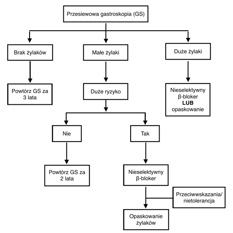 Przesiewowa gastroskopia (GS) Brak żylaków Małe żylaki Duże żylaki Powtórz GS za 3 lata Duże ryzyko Nieselektywny β-bloker$ LUB! opaskowanie$ Nie Tak Powtórz GS za 2 lata Nieselektywny β-bloker Przeciwwskazania/ nietolerancja Opaskowanie żylaków
