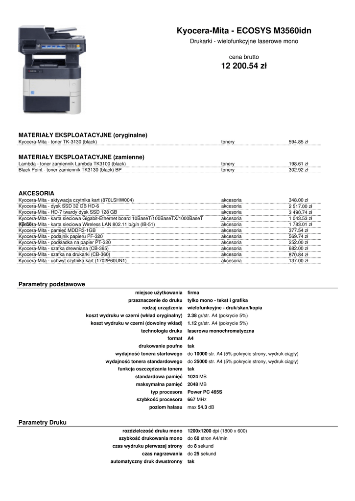 Kyocera-Mita - ECOSYS M3560idn Drukarki - wielofunkcyjne laserowe mono cena brutto 12 200.54 zł MATERIAŁY EKSPLOATACYJNE (oryginalne) Kyocera-Mita - toner TK-3130 (black) MATERIAŁY EKSPLOATACYJNE (zamienne) Lambda - toner zamiennik Lambda TK3100 (black) Black Point - toner zamiennik TK3130 (black) BP AKCESORIA Kyocera-Mita - aktywacja czytnika kart (870LSHW004) Kyocera-Mita - dysk SSD 32 GB HD-6 Kyocera-Mita - HD-7 twardy dysk SSD 128 GB Kyocera-Mita - karta sieciowa Gigabit-Ethernet board 10BaseT/100BaseTX/1000BaseT (IB-50) Kyocera-Mita - karta sieciowa Wireless LAN 802.11 b/g/n (IB-51) Kyocera-Mita - pamięć MDDR3-1GB Kyocera-Mita - podajnik papieru PF-320 Kyocera-Mita - podkładka na papier PT-320 Kyocera-Mita - szafka drewniana (CB-365) Kyocera-Mita - szafka na drukarki (CB-360) Kyocera-Mita - uchwyt czytnika kart (1702P60UN1) tonery 594.85 zł tonery tonery 198.61 zł 302.92 zł akcesoria akcesoria akcesoria akcesoria akcesoria akcesoria akcesoria akcesoria akcesoria akcesoria akcesoria 348.00 zł 2 517.00 zł 3 490.74 zł 1 043.53 zł 1 783.01 zł 377.54 zł 569.74 zł 252.00 zł 682.00 zł 870.84 zł 137.00 zł Parametry podstawowe miejsce użytkowania przeznaczenie do druku rodzaj urządzenia firma tylko mono - tekst i grafika wielofunkcyjne - druk/skan/kopia koszt wydruku w czerni (wkład oryginalny) 2.38 gr/str. A4 (pokrycie 5%) koszt wydruku w czerni (dowolny wkład) 1.12 gr/str. A4 (pokrycie 5%) technologia druku laserowa monochromatyczna format A4 drukowanie poufne tak wydajność tonera startowego do 10000 str. A4 (5% pokrycie strony, wydruk ciągły) wydajność tonera standardowego do 25000 str. A4 (5% pokrycie strony, wydruk ciągły) funkcja oszczędzania tonera tak standardowa pamięć 1024 MB maksymalna pamięć 2048 MB typ procesora szybkość procesora poziom hałasu Power PC 465S 667 MHz max 54.3 dB Parametry Druku rozdzielczość druku mono szybkość drukowania mono czas wydruku pierwszej strony czas nagrzewania automatyczny druk dwustronny 1200x1200 dpi (1800 x 600) do 60 stron A4/min do 8 sekund do 25 sekund tak Parametry Faksu możliwość wysyłania/odbierania faksów modem prędkość faksowania obsługiwana skala szarości kompresja typ lini telefonicznej tak 33.6 kbps ok. 3 s/stronę A4 256 poziomów JBIG MMR MR MH analogowa Parametry Skanera skanowanie w kolorze tak skanowanie dwustronne nie skanowanie do e-maila tak optyczna rozdzielczość skanowania skala szarości skanowanie do plików w formacie skanowanie do chmury inne cechy do 600x600 dpi 256 poziomy PDF (wysoko skompresowany, szyfrowany, PDF/A) JPEG TIFF XPS nie kolorowy skan, zintegrowana książka adresowa, obsługa Active Directory, szyfrowane przesyłanie danych, multi-send (e-mail, fax, SMB/FTP folder, druk) na raz Parametry Kopiowania rozdzielczość kopiowania zakres skalowania ilość kopii na arkuszu, N-up 600x600 dpi min 25 % max 400 % do 4 kopii/arkusz maksymalna liczba kopii 999 automatyczne kopiowanie dwustronne (DADF) tak inne funkcje Skanuj raz - kopiuj wiele, sortowanie elektroniczne, 2na1, 4na1, kopia dowodu tożsamości, rezerwacja pracy, wydruk priorytetowy, program, kopia z automatycznym dupleksem, kopia łączona, skanowanie ciągłe, automatyczny wybór kasety, wybór zaczernienia kopii Obsługa Nośników maksymalna gramatura papieru do 220 g/m² ilość podajników w standardzie 3 automatyczny podajnik dokumentów (ADF) pojemność podajnika automatycznego (ADF) tak 75 arkuszy podajnik na pojedyncze arkusze tak opcjonalny podajnik papieru tak pojemność głównego podajnika papieru maksymalna pojemność podajników pojemność odbiornika papieru podajnik kopert (możliwość drukowania) do 500 arkuszy do 2600 arkuszy do 500 arkuszy nie niestandardowe wymiary nośników (szerokość) min 70 mm max 356 mm niestandardowe wymiary nośników (długość) min 148 mm max 216 mm obsługiwane rodzaje nośników papier zwykły obsługiwane formaty nośników A4 A5 A6 B5 Letter Legal Języki i Emulacje standardowe języki drukarki emulacja czcionki i znaki PRESCRIBE IIe PCL 6 (5c / XL) KPDL 3 (kompatybilny z PostScript 3) Line Printer IBM Proprinter X24E Epson LQ-850 PDF Direct Print 1.7 XPS Direct Print 93 czcionki konturowe (PCL 6, KPDL 3) + 8 (Windows Vista), 1 czcionka bitmapowa, 45 typów jednowymiarowych kodów kreskowych, 1 typ dwuwymiarowego kodu kreskowego (PDF417) Komunikacja ethernet - druk w sieci LAN wireless - druk przez WiFi standardowe rozwiązania komunikacyjne opcjonalne rozwiązania komunikacyjne drukowanie z chmury drukowanie z urządzeń mobilnych tak nie (opcja) USB Ethernet (10BaseT / 100Base-TX / 1000BaseT) 2x USB Host 2.0 Wireless tak tak (AirPrint) Wymiary i Waga wymiary waga produktu (netto) szerokość 475 mm głębokość 455 mm wysokość 590 mm ok. 23.3 kg Zasilanie rodzaj zasilania sieciowe AC (220-240V) zużycie energii średnio 803 W tryb zmniejszonego poboru mocy tak Energy Star tak Wymagania Systemowe Windows Mac OS UNIX Windows XP/VISTA/7/8/Server 2003/Server 2008/Serwer 2008R2/Serwer 2012 MAC OS 10.5 lub wyższa Unix, Linux Inne IPP 1.0 dysk twardy (HDD) drukowanie znaków wodnych tak nie (opcja) nie Gwarancja service Powered by TCPDF (www.tcpdf.org) 12 miesięcy - w serwisie