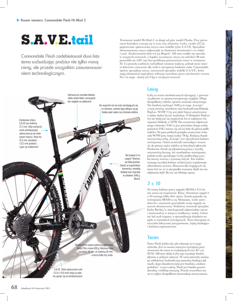 Rower numeru: Cannondale Flash Hi-Mod 2 S.A.V.E.tail Cannondale Flash zadebiutował dwa lata temu wzbudzając podziw nie tylko masą ramy, ale przede wszystkim zaawansowaniem technologicznym. Testowany model Hi-Mod 2, to drugi od góry model Flasha. Przy pierwszym kontakcie rzucają się w oczy trzy elementy: Lefty, cienka (27,2), poprzecznie spłaszczona sztyca oraz widełki tylne S.A.V.E. Specjalnie skonstruowana sztyca odpowiada za tłumienie nierówności i to widać i czuć. Zaskoczeniem była też jej długość. 420 mm rzadko się spotyka w seryjnych rowerach, a legalne wysunięcie sztycy na zaledwie 90 mm pozwoliło mi (187 cm) bez problemu przetestować rower w rozmiarze M. Co prawda osobiście wybrałbym rozmiar większy, jednak może mieć to kluczowe znaczenie dla osób o nietypowej budowie ciała. Cannondale, oprócz specjalnej sztycy, zastosował specjalne widełki S.A.V.E., które mają eliminować największe wibracje wywołane przez nierówności terenu. No i ta waga - mniej niż 9 kg w seryjnym rowerze! Lewy Hydrauliczna manetka blokady skoku działa lekko i precyzyjnie bez względu na zabłocenie Ten wspornik nie ma śrub zaciskających się na sterówce, zamiast tego odkręca się go tulejką spod spodu rury sterowej widelca Carbonowa sztyca S.A.V.E.ma średnicę 27,2 mm. Żeby wzmocnić cechy amortyzacyjne, spłaszczono ją we wskazanym miejscu. Owal ma 32,5 mm szerokości i 22,5 mm grubości. I gnie się znakomicie! Nie brakuje Ci tu czegoś? Powinno, ale tylko gramów. Całość ze wspornikiem kierownicy, manetką blokady oraz osią koła to zaledwie 1640 g. Mistrz! Lefty to temat nieskończonych dywagacji, z pewnością głównie za sprawą nietypowego wyglądu. Długi, dwupółkowy widelec sprawia wrażenie masywnego. Nic bardziej mylnego! 1640 g to waga „Lewego” z rurą sterową, mostkiem oraz hydrauliczną blokadą PopLoc. WOW! Czy jest jakiś lżejszy amortyzator o takim skoku? Ja nie znalazłem. O blokadzie PopLoc też nie będę już się rozpisywał, bo to najlepsze rozwiązanie blokady w MTB. Do ustawienia odpowiedniego ciśnienia i SAG-u jest potrzebna druga osoba, ponieważ SAG mierzy się od osi koła do górnej półki widelca. Po paru próbach pompka ostatecznie wskazała 90 PSI przy mojej wadze 78 kg. Kolejną charakterystyczną cechą „Lewego” jest specyficzna budowa wewnętrzna. Goleń na kształt czworokąta i wsuwa sie do górnej części widelca na łożyskach igłowych. Producent chwali się płynniejszą pracą i wysoką sztywnością boczną, niż standardowe rozwiązania, jednak osoby ujeżdżające Lefty podkreślają wysokie koszty serwisu i wymiany łożysk. Ten widelec wymaga wysokiej kultury technicznej i regularnego odwiedzania serwisu. Bonusem dla ścigających się może być to, że w przypadku wymiany dętki nie ma odpinania koła! Bo nic nie blokuje opony. 2 x 10 Na temat kultury pracy napędu SRAM-a X.0 nie ma sensu się rozpisywać. Klasa. Natomiast napęd 2 x 10 wymaga kilku słów opisu. Zanim pojawiły się rozwiązania SRAM-a czy Shimnano, wielu zawodowców i amatorów przerabiało swoje napędy na system dwutarczowy. Niektórzy stosowali specjalne korby Ritchey’a, inni kupowali odpowiednie tarcze i montowali je w miejscu środkowej i małej. Celem nie był zysk wagowy, a optymalizacja działania napędu w warunkach wyścigowych. Teraz dostajemy to wszystko fabrycznie przygotowane, lepiej działające i bardziej ergonomiczne. Teren Współczynnik szpanu podnoszą carbonowe korby FSA o masie 690 g. Ramiona mają wysokość 46 mm, oś średnicą 30 mm, a tarcze tylko trzy śruby. S.A.V.E. Silnie spłaszczone rurki (13,4 x 19,6 mm) mają za zadanie uginać się na nierównościach 68 bi keB oar d #4 k w i eci eń 2011 Nowy Flash jeździ tak, jak wskazuje na to jego sylwetka. Jest to rasowa maszyna wyścigowa przystosowana do coraz to trudniejszych tras XC czy XCM. 100 mm skoku Lefty’ego uzyskuje bardzo płynnie w pełnym zakresie. W razie potrzeby można go zablokować hydrauliczną manetką chodząca jak masło. Jego charakterystyka jest bardziej „enduropodobna”, co jest zaletą. Flash jest bardzo przewidywalną i stabilną maszyną. Przede wszystkim ma na to wpływ dwupółkowa konstrukcja amortyzatora, b i keB o a r d # 4 kwi ec i eń 2 011 69 Foto: Jacek Wejster, jedzie: Jarek Hałas powiększająca bazę kół. Sylwetkę przyjmujemy typowo wyścigową, zwartą, z ciężarem ciała skierowanym w kierunku przedniej osi. Po przeczytaniu testu w październikowym numerze bB, byłem ciekaw, czy europejska wersja Flasha będzie również wyposażona w szeroką, aż 720-milimetrową kierownicę! Na szczęście moje obawy się nie sprawdziły i kierownica testowanej wersji C’dale’a jest euroklasyczna: 620 mm. Co prawda, może to nie odpowiadać wszystkim ścigantom, jednak to optymalna szerokość, jeśli nie chcemy montować rogów. Test wykazał, że Flash bardzo dobrze podjeżdża, przednie koło w każdej sytuacji jest przyklejone do ziemi, a w przypadku mniej technicznych podjazdów blokada spisuje się tak jak powinna. Na zjazdach Lefty pracuje płynnie i bardzo aktywnie - rower jest stabilny i skrętny za razem. Powiem szczerze, że już prawie w 100% przekonałem się do szerszych kierownic w tego typu rowerach. Momentami brakuje rogów, ale prowadzenie na zjazdach jest dużo łatwiejsze. Cannondale utwierdził mnie w przekonaniu, że hardtaile będą jeszcze długo rządzić na większości tras. Na pewno wśród zawodowców. Dlaczego? Ponieważ już teraz producenci potrafią bardzo umiejętnie wykorzystać możliwości, jakie daje włókno węglowe. Widełki S.A.V.E. oraz specjalnie zaprojektowana sztyca, to jedno z najlepiej tłumiących tego typu rozwiązań, jakie miałem możliwość testować. To naprawdę działa! Parę lat temu, jeździłem na stosunkowo niedrogiej, w pełni carbonowej ramie. Każda mała zmarszczka terenu katapultowała mnie z siodełka na kilka centymetrów w powietrze. Na Fl