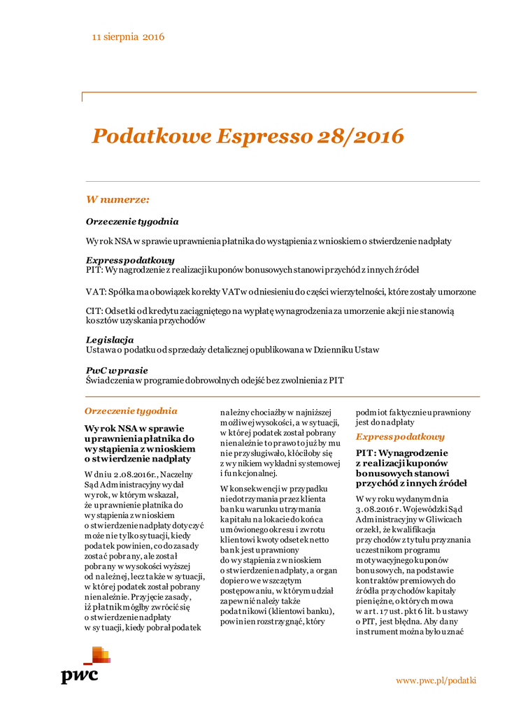 11 sierpnia 2016 Podatkowe Espresso 28/2016 W numerze: Orzeczenie tygodnia Wy rok NSA w sprawie uprawnienia płatnika do wystąpienia z wnioskiem o stwierdzenie nadpłaty Express podatkowy PIT: Wy nagrodzenie z realizacji kuponów bonusowych stanowi przychód z innych źródeł V AT: Spółka ma obowiązek korekty VAT w odniesieniu do części wierzytelności, które zostały umorzone CIT: Odsetki od kredytu zaciągniętego na wypłatę wynagrodzenia za umorzenie akcji nie stanowią kosztów uzyskania przychodów Legislacja Ustawa o podatku od sprzedaży detalicznej opublikowana w Dzienniku Ustaw PwC w prasie Świadczenia w programie dobrowolnych odejść bez zwolnienia z PIT Orzeczenie tygodnia Wy rok NSA w sprawie uprawnienia płatnika do wy stąpienia z wnioskiem o stwierdzenie nadpłaty W dniu 2 .08.2016r., Naczelny Sąd Adm inistracyjny wy dał wyrok, w którym wskazał, że uprawnienie płatnika do wy stąpienia z wnioskiem o stwierdzenie nadpłaty dotyczyć m oże nie tylko sytuacji, kiedy podatek powinien, co do zasady zostać pobrany, ale został pobrany w wysokości wyższej od należnej, lecz także w sytuacji, w której podatek został pobrany nienależnie. Przyjęcie zasady, iż płatnik m ógłby zwrócić się o stwierdzenie nadpłaty w sy tuacji, kiedy pobrał podatek należny chociażby w najniższej m ożliwej wysokości, a w sytuacji, w której podatek został pobrany nienależnie to prawo to już by mu nie przysługiwało, kłóciłoby się z wy nikiem wykładni systemowej i funkcjonalnej. W konsekwencji w przypadku niedotrzymania przez klienta banku warunku utrzymania kapitału na lokacie do końca um ówionego okresu i zwrotu klientowi kwoty odsetek netto bank jest uprawniony do wy stąpienia z wnioskiem o stwierdzenie nadpłaty, a organ dopiero we wszczętym postępowaniu, w którym udział zapewnić należy także podatnikowi (klientowi banku), powinien rozstrzygnąć, który podm iot faktycznie uprawniony jest do nadpłaty Express podatkowy PIT: Wynagrodzenie z realizacji kuponów bonusowych stanowi przychód z innych źródeł W wy roku wydanym dnia 3 .08.2016 r. Wojewódzki Sąd Adm inistracyjny w Gliwicach orzekł, że kwalifikacja przy chodów z tytułu przyznania uczestnikom programu m otywacyjnego kuponów bonusowych, na podstawie kontraktów premiowych do źródła przychodów kapitały pieniężne, o których m owa w art. 17 ust. pkt 6 lit. b ustawy o PIT, jest błędna. Aby dany instrument można było uznać www.pwc.pl/podatki Podatkowe espresso 28/2016 za papier wartościowy musi on spełniać warunki przewidziane w art. 3 pkt 1 ustawy o obrocie instrumentami finansowymi. Kupony bonusowe nie posiadają jednak niezbędnej cechy, jaką jest ich zbywalność, nie są więc zby walnym papierem wartościowym w świetle tego przepisu. W konsekwencji w m om encie realizacji praw wy nikających z kuponów bonusowych w drodze rozliczenia pieniężnego u uczestników programu powstaje przychód z „innych źródeł”, o którym m owa w art. 2 0 ust. 1 ustawy o PIT. VAT: Spółka ma obowiązek korekty VAT w odniesieniu do części wierzytelności, które zostały umorzone W dniu 3 .08.2016r., Wojewódzki Sąd Adm inistracyjny w Poznaniu wy dał wyrok, w którym wskazał, że w odniesieniu do części należności nieściągalnych, które zostały przez wierzycieli, na podstawie zawartego układu um orzone, nie m ożna m ieć wątpliwości, że wierzyciele na m ocy art. 89a ust. 1 ustawy o VAT m ają prawo do korekty podstawy opodatkowania oraz podatku należnego. Umorzenie wierzytelności nie jest bowiem równoznaczne z ich uregulowaniem. Ty m samym spółka (dłużnik) w odniesieniu do części wierzytelności, które zostały um orzone zgodnie z art. 89b ustawy o VAT ma obowiązek korekty odliczonej kwoty podatku w części przypadającej na nieuregulowaną (umorzoną) należność. CIT: Odsetki od kredytu zaciągniętego na wypłatę wynagrodzenia za umorzenie akcji nie stanowią kosztów uzyskania przychodów W wy roku wydanym dnia 4 .08.2016 r. Naczelny Sąd Adm inistracyjny orzekł, że do kosztów uzyskania przy chodów nie można zaliczyć odsetek od kredytu zaciągniętego w celu sfinansowania wypłaty wy nagrodzenia na rzecz akcjonariusza z tytułu dobrowolnego umorzenia akcji. W wy niku umorzenia akcji spółka nie uzyskuje bowiem żadnego przy sporzenia m ajątkowego, ponieważ nabyte przez nią akcje zostaną następnie umorzone, a więc przestaną istnieć. Trudno również doszukać się związku wskazanych wydatków z zachowaniem i zabezpieczeniem źródła przy chodów. Przewiduje się kwotę wolną od podatku w wysokości 17 mln zł m iesięcznie. Zakłada się wprowadzenie skali progresywnej obejm ującej 2 stawki i progi podatkowe: 0,8% od podstawy opodatkowania pom iędzy kwotą 1 7 mln zł i 170 mln zł oraz 1 ,4% od nadwyżki podstawy opodatkowania ponad kwotę 170 m ln zł. Ustawa wejdzie w życie z dniem 1 września 2016 r. Zdaniem sądu nie m ożna uznać, iż wystarczającą przyczyną zaliczenia ich do kosztów uzy skania przychodów jest ogólnikowe wskazanie przez spółkę na potrzebę zabezpieczenia źródła przy chodów oraz konieczność zaciągnięcia kredytu z uwagi na zapewnienie płynności finansowej. się, że funkcją i celem odszkodowania wypłacanego w ramach programu dobrowolnych odejść jest złagodzenie ekonomicznych i społecznych skutków utraty zatrudnienia, a nie naprawienie szkody . Legislacja Ustawa o podatku od sprzedaży detalicznej opublikowana w Dzienniku Ustaw W dniu 1 .08.2016 r. w Dzienniku Ustaw opublikowano ustawę o podatku od sprzedaży detalicznej. Przedm iotem opodatkowania będzie przychód ze sprzedaży detalicznej, czyli sprzedaży dokony wanej na rzecz konsumentów. W podstawie opodatkowania nie będzie uwzględniana sprzedaż na rzecz przedsiębiorców. Ustawa nie przew iduje opodatkowania sprzedaży dokonywanej przez internet. Ustawa w ejdzie w życie z dniem 1 września 2 016 r. PwC w pra