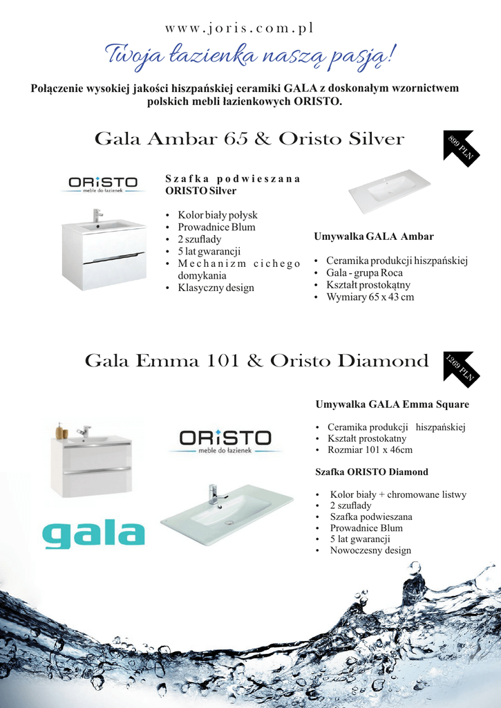 www.joris.com.pl Twoja łazienka naszą pasją! Połączenie wysokiej jakości hiszpańskiej ceramiki GALA z doskonałym wzornictwem polskich mebli łazienkowych ORISTO. Gala Ambar 65 & Oristo Silver 89 9 PL N Szafka podwieszana ORISTO Silver Kolor biały połysk Prowadnice Blum 2 szuflady 5 lat gwarancji Mechanizm cichego domykania ź Klasyczny design ź ź ź ź ź Umywalka GALA Ambar ź ź ź ź Ceramika produkcji hiszpańskiej Gala - grupa Roca Kształt prostokątny Wymiary 65 x 43 cm Gala Emma 101 & Oristo Diamond 12 69 PL N Umywalka GALA Emma Square ź Ceramika produkcji hiszpańskiej ź Kształt prostokatny ź Rozmiar 101 x 46cm Szafka ORISTO Diamond ź ź ź ź ź ź Kolor biały + chromowane listwy 2 szuflady Szafka podwieszana Prowadnice Blum 5 lat gwarancji Nowoczesny design