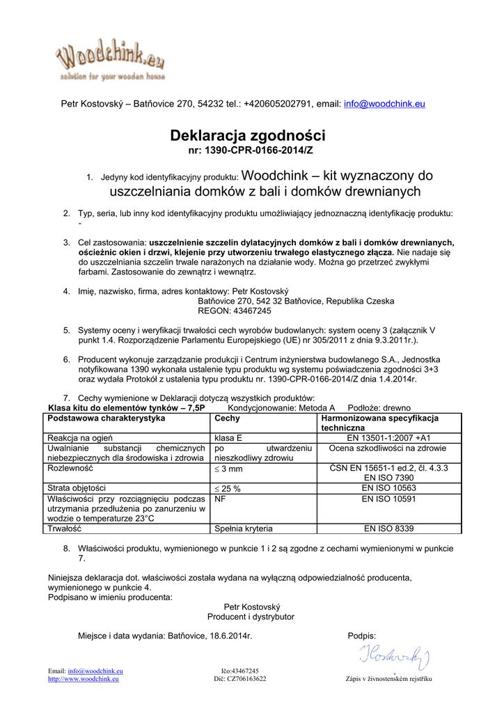 Petr Kostovský – Batňovice 270, 54232 tel.: +420605202791, email: [email protected] Deklaracja zgodności nr: 1390-CPR-0166-2014/Z Woodchink – kit wyznaczony do uszczelniania domków z bali i domków drewnianych 1. Jedyny kod identyfikacyjny produktu: 2. Typ, seria, lub inny kod identyfikacyjny produktu umożliwiający jednoznaczną identyfikację produktu: 3. Cel zastosowania: uszczelnienie szczelin dylatacyjnych domków z bali i domków drewnianych, ościeżnic okien i drzwi, klejenie przy utworzeniu trwałego elastycznego złącza. Nie nadaje się do uszczelniania szczelin trwale narażonych na działanie wody. Można go przetrzeć zwykłymi farbami. Zastosowanie do zewnątrz i wewnątrz. 4. Imię, nazwisko, firma, adres kontaktowy: Petr Kostovský Batňovice 270, 542 32 Batňovice, Republika Czeska REGON: 43467245 5. Systemy oceny i weryfikacji trwałości cech wyrobów budowlanych: system oceny 3 (załącznik V punkt 1.4. Rozporządzenie Parlamentu Europejskiego (UE) nr 305/2011 z dnia 9.3.2011r.). 6. Producent wykonuje zarządzanie produkcji i Centrum inżynierstwa budowlanego S.A., Jednostka notyfikowana 1390 wykonała ustalenie typu produktu wg systemu poświadczenia zgodności 3+3 oraz wydała Protokół z ustalenia typu produktu nr. 1390-CPR-0166-2014/Z dnia 1.4.2014r. 7. Cechy wymienione w Deklaracji dotyczą wszystkich produktów: Klasa kitu do elementów tynków – 7,5P Kondycjonowanie: Metoda A Podłoże: drewno Podstawowa charakterystyka Cechy Harmonizowana specyfikacja techniczna Reakcja na ogień klasa E EN 13501-1:2007 +A1 Uwalnianie substancji chemicznych po utwardzeniu Ocena szkodliwości na zdrowie niebezpiecznych dla środowiska i zdrowia nieszkodliwy zdrowiu Rozlewność ČSN EN 15651-1 ed.2, čl. 4.3.3 3 mm EN ISO 7390 Strata objętości EN ISO 10563 25 % Właściwości przy rozciągnięciu podczas NF EN ISO 10591 utrzymania przedłużenia po zanurzeniu w wodzie o temperaturze 23°C Trwałość Spełnia kryteria EN ISO 8339 8. Właściwości produktu, wymienionego w punkcie 1 i 2 są zgodne z cechami wymienionymi w punkcie 7. Niniejsza deklaracja dot. właściwości została wydana na wyłączną odpowiedzialność producenta, wymienionego w punkcie 4. Podpisano w imieniu producenta: Petr Kostovský Producent i dystrybutor Miejsce i data wydania: Batňovice, 18.6.2014r. Email: [email protected] http://www.woodchink.eu Ičo:43467245 Dič: CZ706163622 Podpis: spisová značka Zápis v živnostenském rejstříku Informacje towarzyszące oznaczenie CE: Petr Kostovský, Batňovice 270, 54232 Batňovice, RCZ REGON 43467245 14 CPR EN 15651-1:2013 Jednoskładnikowy kit akrylowy na bazie wody, w różnych odcieniach kolorów Niekonstrukcyjny kit do uszczelnienia szczelin, domków z bali i domków drewnianych (elementy tynków) - Typ: F 7,5 EXT - INT - Kondycjonowanie: Metoda A Podłoże: drewno Reakcja na ogień: Zwolnienie substancji chemicznych niebezpiecznych dla środowiska i zdrowia Wodoszczelność i hermetyczność - rozlewność - strata objętości - Właściwości przy rozciągnięciu - podczas utrzymania przedłużenia po zanurzeniu w wodzie o temperaturze 23°C Trwałość klasa E Oceniono 3 mm 25 % NF - odpowiada Odpowiada Oznaczenie CE na opakowaniu: 14 Petr Kostovský, Batňovice 27, 542 32 Batňovice EN 15651-1 F EXT - INT Email: [email protected] http://www.woodchink.eu Ičo:43467245 Dič: CZ706163622 spisová značka Zápis v živnostenském rejstříku
