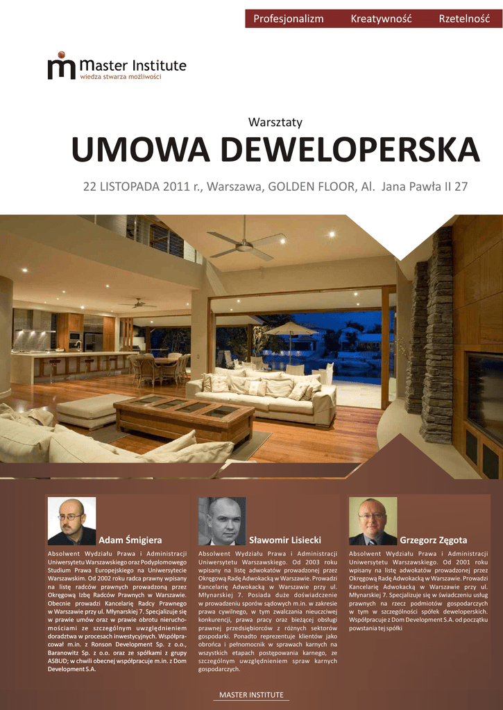 Profesjonalizm Kreatywnoœæ Rzetelnoœæ wiedza stwarza mo¿liwoœci Warsztaty UMOWA DEWELOPERSKA 22 LISTOPADA 2011 r., Warszawa, GOLDEN FLOOR, Al. Jana Paw³a II 27 Adam Œmigiera Absolwent Wydzia³u Prawa i Administracji Uniwersytetu Warszawskiego oraz Podyplomowego Studium Prawa Europejskiego na Uniwersytecie Warszawskim. Od 2002 roku radca prawny wpisany na listê radców prawnych prowadzon¹ przez Okrêgow¹ Izbê Radców Prawnych w Warszawie. Obecnie prowadzi Kancelariê Radcy Prawnego w Warszawie przy ul. M³ynarskiej 7. Specjalizuje siê w prawie umów oraz w prawie obrotu nieruchomoœciami ze szczególnym uwzglêdnieniem doradztwa w procesach inwestycyjnych. Wspó³pracowa³ m.in. z Ronson Development Sp. z o.o., Baranowitz Sp. z o.o. oraz ze spó³kami z grupy ASBUD; w chwili obecnej wspó³pracuje m.in. z Dom Development S.A. S³awomir Lisiecki Absolwent Wydzia³u Prawa i Administracji Uniwersytetu Warszawskiego. Od 2003 roku wpisany na listê adwokatów prowadzonej przez Okrêgow¹ Radê Adwokack¹ w Warszawie. Prowadzi Kancelariê Adwokack¹ w Warszawie przy ul. M³ynarskiej 7. Posiada du¿e doœwiadczenie w prowadzeniu sporów s¹dowych m.in. w zakresie prawa cywilnego, w tym zwalczania nieuczciwej konkurencji, prawa pracy oraz bie¿¹cej obs³ugi prawnej przedsiêbiorców z ró¿nych sektorów gospodarki. Ponadto reprezentuje klientów jako obroñca i pe³nomocnik w sprawach karnych na wszystkich etapach postêpowania karnego, ze szczególnym uwzglêdnieniem spraw karnych gospodarczych. MASTER INSTITUTE Grzegorz Zêgota Absolwent Wydzia³u Prawa i Administracji Uniwersytetu Warszawskiego. Od 2001 roku wpisany na listê adwokatów prowadzonej przez Okrêgow¹ Radê Adwokack¹ w Warszawie. Prowadzi Kancelariê Adwokack¹ w Warszawie przy ul. M³ynarskiej 7. Specjalizuje siê w œwiadczeniu us³ug prawnych na rzecz podmiotów gospodarczych w tym w szczególnoœci spó³ek deweloperskich. Wspó³pracuje z Dom Development S.A. od pocz¹tku powstania tej spó³ki 22 listopada 2011 r., wtorek 9:30-10:00 rejestracja uczestników, kawa powitalna 10:00-11:00 UMOWA DEWELOPERSKA JAKO NOWY TYP UMOWY NAZWANEJ § zasady i tryb zawierania umowy deweloperskiej § prawa i obowi¹zki stron umowy deweloperskiej ze szczególnym uwzglêdnieniem prawa odst¹pienia; § umowa deweloperska a umowa zawierana w trybie art. 9 ustawy o w³asnoœci lokali oraz inne umowy zawierane przez deweloperów Prelegent: radca prawny Adam Œmigiera 11:00-12:00 ŒRODKI OCHRONY WP£AT DOKONYWANYCH PRZEZ NABYWCÓW LOKALI § zamkniêty mieszkaniowy rachunek powierniczy § otwarty mieszkaniowy rachunek powierniczy § gwarancja bankowa § gwarancja ubezpieczeniowa Prelegent: adwokat Grzegorz Zêgota 12:00-12:20 przerwa na kawê 13:30-14:30 lunch 14:30-15:30 SYTUACJA PRAWNA NABYWCÓW LOKALI W RAZIE OG£OSZENIA UPAD£OŒCI DEWELOPERA § sytuacja prawna nabywców lokali w œwietle obecnie obowi¹zuj¹cych przepisów ustawy Prawo upad³oœciowe i naprawcze § sytuacja prawna nabywców lokali w œwietle zmian do ustawy Prawo upad³oœciowe i naprawcze wprowadzonych ustaw¹ o ochronie praw nabywcy lokalu mieszkalnego lub domu jednorodzinnego Prelegent: adwokat S³awomir Lisiecki 15:30 – 16:30 ROLA BANKU W PRZEDSIÊWZIÊCIU DEWELOPERSKIM § rola banku w œwietle obecnie obowi¹zuj¹cych przepisów i praktyki § prowadzenie 12:20-13:30 OBOWI¥ZKI DEWELOPERA W RAMACH PRZEDSIÊWZIÊCIA DEWELOPERSKIEGO § pojêcie dewelopera § pojêcie przedsiêwziêcia inwestycyjnego § obowi¹zki dewelopera wynikaj¹ce z przepisów prawa budowlanego § obowi¹zki przed zawarciem umowy deweloperskiej ze szczególnym uwzglêdnieniem kwestii prospektu informacyjnego § obowi¹zki dewelopera w œwietle przepisów przejœciowych ustawy o ochronie praw nabywcy lokalu mieszkalnego lub domu jednorodzinnego § sankcje karne za niewykonywanie obowi¹zków na³o¿onych przez przepisy ustawy o ochronie praw nabywcy lokalu mieszkalnego lub domu jednorodzinnego Prelegent: adwokat Grzegorz Zêgota mieszkaniowych rachunków powierniczych i wyp³aty z tego rachunku § kontrola i ocena przebiegu przedsiêwziêcia deweloperskiego § udzielanie gwarancji bankowych Prelegent: radca prawny Adam Œmigiera 16:30 zakoñczenie warsztatów, wrêczenie certyfikatów