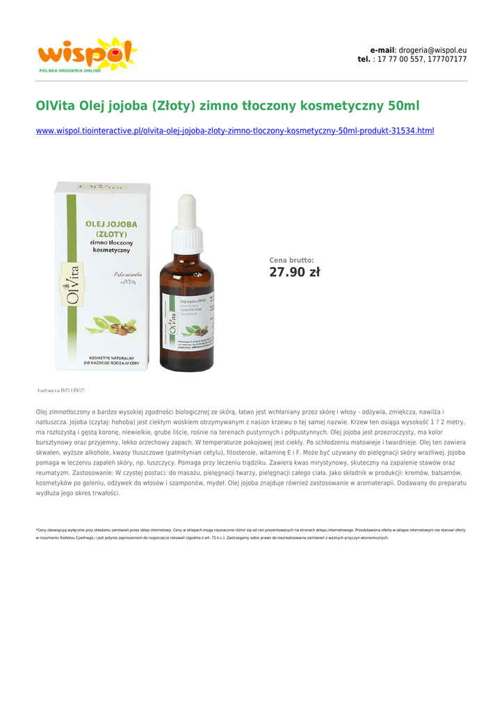 e-mail: [email protected] tel. : 17 77 00 557, 177707177 OlVita Olej jojoba (Złoty) zimno tłoczony kosmetyczny 50ml www.wispol.tiointeractive.pl/olvita-olej-jojoba-zloty-zimno-tloczony-kosmetyczny-50ml-produkt-31534.html Cena brutto: 27.90 zł Olej zimnotłoczony o bardzo wysokiej zgodności biologicznej ze skórą, łatwo jest wchłaniany przez skórę i włosy - odżywia, zmiękcza, nawilża i natłuszcza. Jojoba (czytaj: hohoba) jest ciekłym woskiem otrzymywanym z nasion krzewu o tej samej nazwie. Krzew ten osiąga wysokość 1 ? 2 metry, ma rozłożystą i gęstą koronę, niewielkie, grube liście, rośnie na terenach pustynnych i półpustynnych. Olej jojoba jest przezroczysty, ma kolor bursztynowy oraz przyjemny, lekko orzechowy zapach. W temperaturze pokojowej jest ciekły. Po schłodzeniu matowieje i twardnieje. Olej ten zawiera skwalen, wyższe alkohole, kwasy tłuszczowe (palmitynian cetylu), fitosterole, witaminę E i F. Może być używany do pielęgnacji skóry wrażliwej. Jojoba pomaga w leczeniu zapaleń skóry, np. łuszczycy. Pomaga przy leczeniu trądziku. Zawiera kwas mirystynowy, skuteczny na zapalenie stawów oraz reumatyzm. Zastosowanie: W czystej postaci: do masażu, pielęgnacji twarzy, pielęgnacji całego ciała. Jako składnik w produkcji: kremów, balsamów, kosmetyków po goleniu, odżywek do włosów i szamponów, mydeł. Olej jojoba znajduje również zastosowanie w aromaterapii. Dodawany do preparatu wydłuża jego okres trwałości. *Ceny obowiązują wyłącznie przy składaniu zamówień przez sklep internetowy. Ceny w sklepach mogą nieznacznie różnić się od cen prezentowanych na stronach sklepu internetowego. Przedstawiona oferta w sklepie internetowym nie stanowi oferty w rozumieniu Kodeksu Cywilnego, i jest jedynie zaproszeniem do rozpoczęcia rokowań (zgodnie z art. 71 k.c.). Zastrzegamy sobie prawo do niezrealizowania zamówień z ważnych przyczyn ekonomicznych.