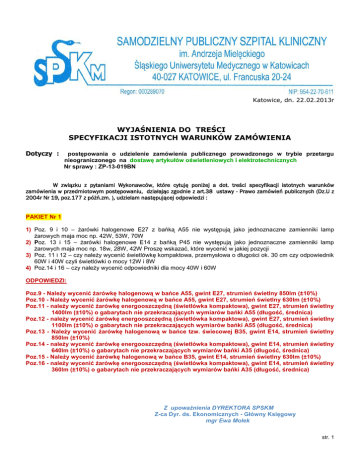Katowice, dn. 22.02.2013r WYJAŚNIENIA DO TREŚCI SPECYFIKACJI ISTOTNYCH WARUNKÓW ZAMÓWIENIA Dotyczy : postępowania o udzielenie zamówienia publicznego prowadzonego w trybie przetargu nieograniczonego na dostawę artykułów oświetleniowych i elektrotechnicznych Nr sprawy : ZP-13-019BN W związku z pytaniami Wykonawców, które cytuję poniżej a dot. treści specyfikacji istotnych warunków zamówienia w przedmiotowym postępowaniu, działając zgodnie z art.38 ustawy - Prawo zamówień publicznych (Dz.U z 2004r Nr 19, poz.177 z póżń.zm. ), udzielam następującej odpowiedzi : PAKIET Nr 1 1) Poz. 9 i 10 – żarówki halogenowe E27 z bańką A55 nie występują jako jednoznaczne zamienniki lamp żarowych maja moc np. 42W, 53W, 70W 2) Poz. 13 i 15 – żarówki halogenowe E14 z bańką P45 nie występują jako jednoznaczne zamienniki lamp żarowych maja moc np. 18w, 28W, 42W Proszę wskazać, które wycenić w jakiej pozycji 3) Poz. 11 i 12 – czy należy wycenić świetlówkę kompaktowa, przemysłowa o długości ok. 30 cm czy odpowiednik 60W i 40W czyli świetlówki o mocy 12W i 8W 4) Poz.14 i 16 – czy należy wycenić odpowiedniki dla mocy 40W i 60W ODPOWIEDZI: Poz.9 - Należy wycenić żarówkę halogenową w bańce A55, gwint E27, strumień świetlny 850lm (±10%) Poz.10 - Należy wycenić żarówkę halogenową w bańce A55, gwint E27, strumień świetlny 630lm (±10%) Poz.11 - należy wycenić żarówkę energooszczędną (świetlówka kompaktowa), gwint E27, strumień świetlny 1400lm (±10%) o gabarytach nie przekraczających wymiarów bańki A55 (długość, średnica) Poz.12 - należy wycenić żarówkę energooszczędną (świetlówka kompaktowa), gwint E27, strumień świetlny 1100lm (±10%) o gabarytach nie przekraczających wymiarów bańki A55 (długość, średnica) Poz.13 - Należy wycenić żarówkę halogenową w bańce tzw. świecowej B35, gwint E14, strumień świetlny 850lm (±10%) Poz.14 - należy wycenić żarówkę energooszczędną (świetlówka kompaktowa), gwint E14, strumień świetlny 640lm (±10%) o gabarytach nie przekraczających wymiarów bańki A35 (długość, średnica) Poz.15 - Należy wycenić żarówkę halogenową w bańce B35, gwint E14, strumień świetlny 630lm (±10%) Poz.16 - należy wycenić żarówkę energooszczędną (świetlówka kompaktowa), gwint E14, strumień świetlny 360lm (±10%) o gabarytach nie przekraczających wymiarów bańki A35 (długość, średnica) Z upoważnienia DYREKTORA SPSKM Z-ca Dyr. ds. Ekonomicznych - Główny Księgowy mgr Ewa Mołek str. 1