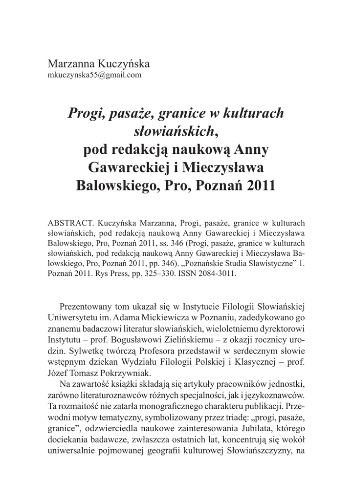 325 Marzanna Kuczyńska [email protected] Progi, pasaże, granice w kulturach słowiańskich, pod redakcją naukową Anny Gawareckiej i Mieczysława Balowskiego, Pro, Poznań 2011 ABSTRACT. Kuczyńska Marzanna, Progi, pasaże, granice w kulturach słowiańskich, pod redakcją naukową Anny Gawareckiej i Mieczysława Balowskiego, Pro, Poznań 2011, ss. 346 (Progi, pasaże, granice w kulturach słowiańskich, pod redakcją naukową Anny Gawareckiej i Mieczysława Balowskiego, Pro, Poznań 2011, pp. 346). „Poznańskie Studia Slawistyczne” 1. Poznań 2011. Rys Press, pp. 325–330. ISSN 2084-3011. Prezentowany tom ukazał się w Instytucie Filologii Słowiańskiej Uniwersytetu im. Adama Mickiewicza w Poznaniu, zadedykowano go znanemu badaczowi literatur słowiańskich, wieloletniemu dyrektorowi Instytutu – prof. Bogusławowi Zielińskiemu – z okazji rocznicy urodzin. Sylwetkę twórczą Profesora przedstawił w serdecznym słowie wstępnym dziekan Wydziału Filologii Polskiej i Klasycznej – prof. Józef Tomasz Pokrzywniak. Na zawartość książki składają się artykuły pracowników jednostki, zarówno literaturoznawców różnych specjalności, jak i językoznawców. Ta rozmaitość nie zatarła monograficznego charakteru publikacji. Przewodni motyw tematyczny, symbolizowany przez triadę: „progi, pasaże, granice”, odzwierciedla naukowe zainteresowania Jubilata, którego dociekania badawcze, zwłaszcza ostatnich lat, koncentrują się wokół uniwersalnie pojmowanej geografii kulturowej Słowiańszczyzny, na 326 Marzanna Kuczyńska obszarach której dochodzi do styku, wzajemnego oddziaływania i/lub przenikania narodowych kultur i literatur w całym ich historycznym zróżnicowaniu. Ale jest to równocześnie terytorium, gdzie manifestacyjnie dają o sobie znać procesy separatystyczne, postawa odgradzania się od dawnych sąsiadów, współobywateli, współuczestników jednej (wspólnej) kultury. Niegdysiejsze miejsca wspólne w najbardziej jaskrawy sposób zaczynają w nowych konfiguracjach uobecniać toposy odrębnie stematyzowane, wyrażać wzajemną obojętność czy wręcz niechęć. Autorzy prac zebranych w tomie Progi, pasaże, granice podejmują wysiłek rejestracji i analizy omawianych zjawisk na przestrzeni dziejów. Materiał treściowy podzielony jest na cztery niezależne części, porządkowane według kryterium chronologiczno-tematycznego: 1. Sacrum i profanum; 2. Meandry tożsamości; 3. Postmodernistyczne pasaże; 4. Progi i granice w mowie i piśmie. Część pierwsza obejmuje teksty związane z epoką bałkańskiego średniowiecza oraz epickim piśmiennictwem folkloru. Paweł Dziadul przedstawia serbskie koncepcje ideologiczne, oparte na biblijnej zasadzie wybraństwa, jakie uformowały się pod wpływem nastrojów eschatologicznych odczuwanych w regionie w okresie tureckiego podboju Bałkanów (Na granicy „tego wieku” i „przyszłego wieku”. Atmosfera „końca czasów” w „Żywocie Stefana Lazarevicia” Konstantyna Filozofa Kosteneckiego). Izabela Lis-Wielgosz bada rolę pamięci jako swoistego „narzędzia” przechowywania i środka przekazywania centralnych serbskich wartości państwowo-religijno-kulturowych (Pamięć jako granica o(d)porności kultury). Obszar Serbii pozostaje w polu zainteresowania Marioli Walczak-Mikołajczakowej, Przestrzenie i granice w „Żywocie świętego męczennika spośród carów”, Stefana Serbskiego z Deczan. Autorka omawia pod kątem funkcjonalnym sfery sacrum i profanum wyróżniane przez bułgarskiego hagiografa Grzegorza Cambłaka, w świętej biografii serbskiego władcy. Wojciech Jóźwiak skupia się na artystycznej interpretacji początków narodowej historii, proponowanej przez bułgarskich prozaików, którzy przeprowadzają radykalną często konfrontację między pogańską a chrześcijańską tradycją najstarszej epoki funkcjonowania państwa, dowodząc nadrzędności pierwszej wobec drugiej – lub odwrotnie (Chrzest Bułgarii – próba Progi, pasaże, granice w kulturach słowiańskich... 327 bilansu korzyści i strat na podstawie bułgarskiej prozy historycznej). Tekst Moniki Obojskiej dotyczy kwestii mentalnej granicy wolności i zniewolenia w sytuacji wielopoziomowego zróżnicowania etniczno‑religijnego społeczeństwa imperium osmańskiego (Z niewolnictwa do wolności i odwrotnie. Dychotomiczny obraz jednostki zniewolonej na przykładzie wybranych bohaterskich pieśni epickich bośniackich muzułmanów). Druga część książki poświęcona jest zagadnieniom tożsamości narodowej. Trzy artykuły – pióra Anny Gawareckiej, Urszuli Kowalskiej i Jana Pešiny – dotyczą problematyki czeskiej. Autorzy prezentują sylwetki osobowe, postawy świadomościowe, strategie ideologiczne, zbieżne lub odmienne formy działania, obecne zarówno w życiu, jak i w sztuce czeskiej w momentach historycznych przełomów – epoki odrodzenia narodowego (Intryga czy miłość, czyli jak (nie)zostać budzicielem (wokół powieści Vladimíra Macury „Informátor”), czasu zrywów lat 1968 i 1989 (Pokolenie 68-89. Pokolenie dwóch przełomów, pokolenie dwóch dat, pokolenie graniczne) oraz polityczno-kulturowych przesileń zachodzących na przestrzeni całej historii Czech (Od tradycji duchowej do tradycji świeckiej. Historyczne metamorfozy czeskiego dziedzictwa świętowacławskiego). Lech Miodyński wskazuje znaczenie realnych oraz metaforycznych dróg, czy może lepiej – „przejść”, dla świadomości pewnego rodzaju strefy „zamkniętej”, jaką jest tu współczesna Macedonia, rozczłonkowana geograficznie i okrojona terytorialnie (Symboliczny korytarz międzystrefowy macedońskiej geosfery). Artykuł Krystyny Pieniążek-Marković nie zostawia złudzeń, iż wyjście poza własną, oswojoną przestrzeń narzuca konieczność weryfikacji, przyjmowanych zwykle a priori, idealistycznych wyobrażeń o „innym”, zwłaszcza gdy traktuje się je jak „swoje”, niezależnie od kons
