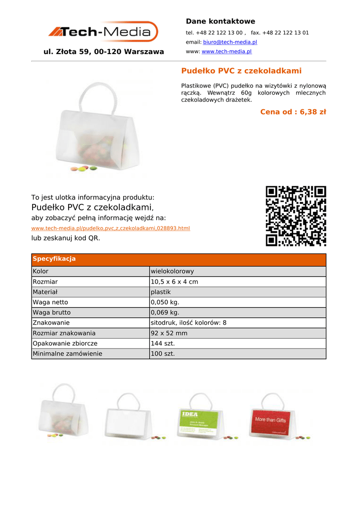 Dane kontaktowe tel. +48 22 122 13 00 , fax. +48 22 122 13 01 email: [email protected] ul. Złota 59, 00-120 Warszawa www: www.tech-media.pl Pudełko PVC z czekoladkami Plastikowe (PVC) pudełko na wizytówki z nylonową rączką. Wewnątrz 60g kolorowych mlecznych czekoladowych drażetek. Cena od : 6,38 zł To jest ulotka informacyjna produktu: Pudełko PVC z czekoladkami, aby zobaczyć pełną informację wejdź na: www.tech-media.pl/pudelko,pvc,z,czekoladkami,028893.html lub zeskanuj kod QR. Specyfikacja Kolor wielokolorowy Rozmiar 10,5 x 6 x 4 cm Materiał plastik Waga netto 0,050 kg. Waga brutto 0,069 kg. Znakowanie sitodruk, ilość kolorów: 8 Rozmiar znakowania 92 x 52 mm Opakowanie zbiorcze 144 szt. Minimalne zamówienie 100 szt.
