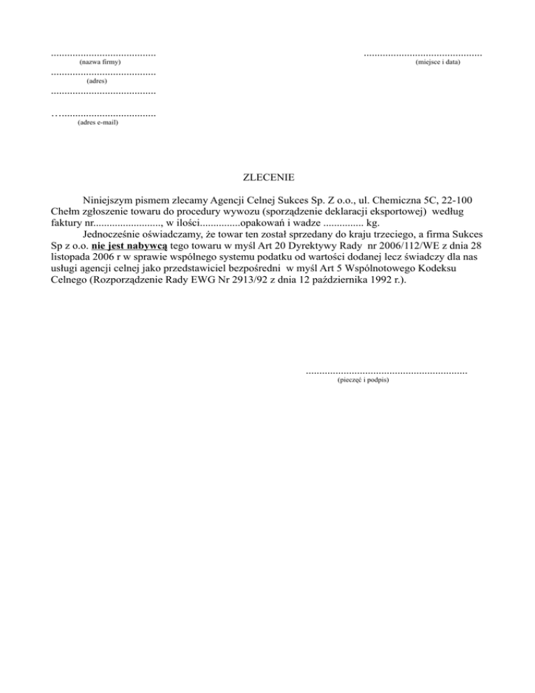 ....................................... ............................................ (nazwa firmy) (miejsce i data) ....................................... (adres) ....................................... …................................... (adres e-mail) ZLECENIE Niniejszym pismem zlecamy Agencji Celnej Sukces Sp. Z o.o., ul. Chemiczna 5C, 22-100 Chełm zgłoszenie towaru do procedury wywozu (sporządzenie deklaracji eksportowej) według faktury nr........................., w ilości...............opakowań i wadze ............... kg. Jednocześnie oświadczamy, że towar ten został sprzedany do kraju trzeciego, a firma Sukces Sp z o.o. nie jest nabywcą tego towaru w myśl Art 20 Dyrektywy Rady nr 2006/112/WE z dnia 28 listopada 2006 r w sprawie wspólnego systemu podatku od wartości dodanej lecz świadczy dla nas usługi agencji celnej jako przedstawiciel bezpośredni w myśl Art 5 Wspólnotowego Kodeksu Celnego (Rozporządzenie Rady EWG Nr 2913/92 z dnia 12 października 1992 r.). ............................................................ (pieczęć i podpis)