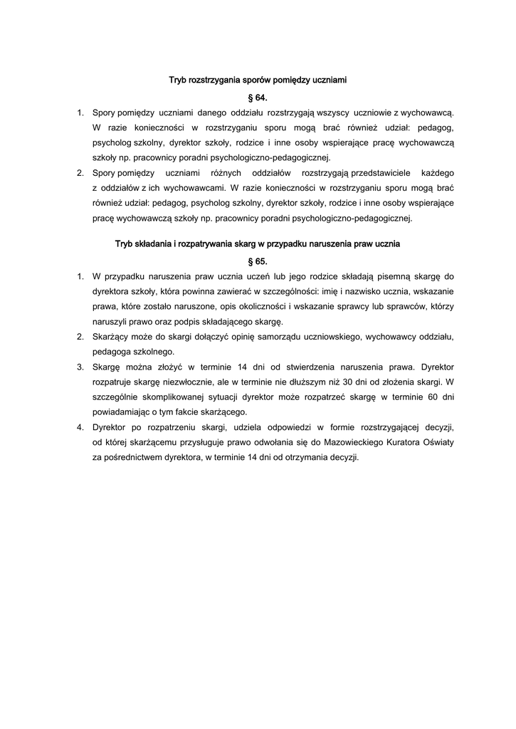Tryb rozstrzygania sporów pomiędzy uczniami § 64. 1. Spory pomiędzy uczniami danego oddziału rozstrzygają wszyscy uczniowie z wychowawcą. W razie konieczności w rozstrzyganiu sporu mogą brać również udział: pedagog, psycholog szkolny, dyrektor szkoły, rodzice i inne osoby wspierające pracę wychowawczą szkoły np. pracownicy poradni psychologiczno-pedagogicznej. 2. Spory pomiędzy uczniami różnych oddziałów rozstrzygają przedstawiciele każdego z oddziałów z ich wychowawcami. W razie konieczności w rozstrzyganiu sporu mogą brać również udział: pedagog, psycholog szkolny, dyrektor szkoły, rodzice i inne osoby wspierające pracę wychowawczą szkoły np. pracownicy poradni psychologiczno-pedagogicznej. Tryb składania i rozpatrywania skarg w przypadku naruszenia praw ucznia § 65. 1. W przypadku naruszenia praw ucznia uczeń lub jego rodzice składają pisemną skargę do dyrektora szkoły, która powinna zawierać w szczególności: imię i nazwisko ucznia, wskazanie prawa, które zostało naruszone, opis okoliczności i wskazanie sprawcy lub sprawców, którzy naruszyli prawo oraz podpis składającego skargę. 2. Skarżący może do skargi dołączyć opinię samorządu uczniowskiego, wychowawcy oddziału, pedagoga szkolnego. 3. Skargę można złożyć w terminie 14 dni od stwierdzenia naruszenia prawa. Dyrektor rozpatruje skargę niezwłocznie, ale w terminie nie dłuższym niż 30 dni od złożenia skargi. W szczególnie skomplikowanej sytuacji dyrektor może rozpatrzeć skargę w terminie 60 dni powiadamiając o tym fakcie skarżącego. 4. Dyrektor po rozpatrzeniu skargi, udziela odpowiedzi w formie rozstrzygającej decyzji, od której skarżącemu przysługuje prawo odwołania się do Mazowieckiego Kuratora Oświaty za pośrednictwem dyrektora, w terminie 14 dni od otrzymania decyzji.
