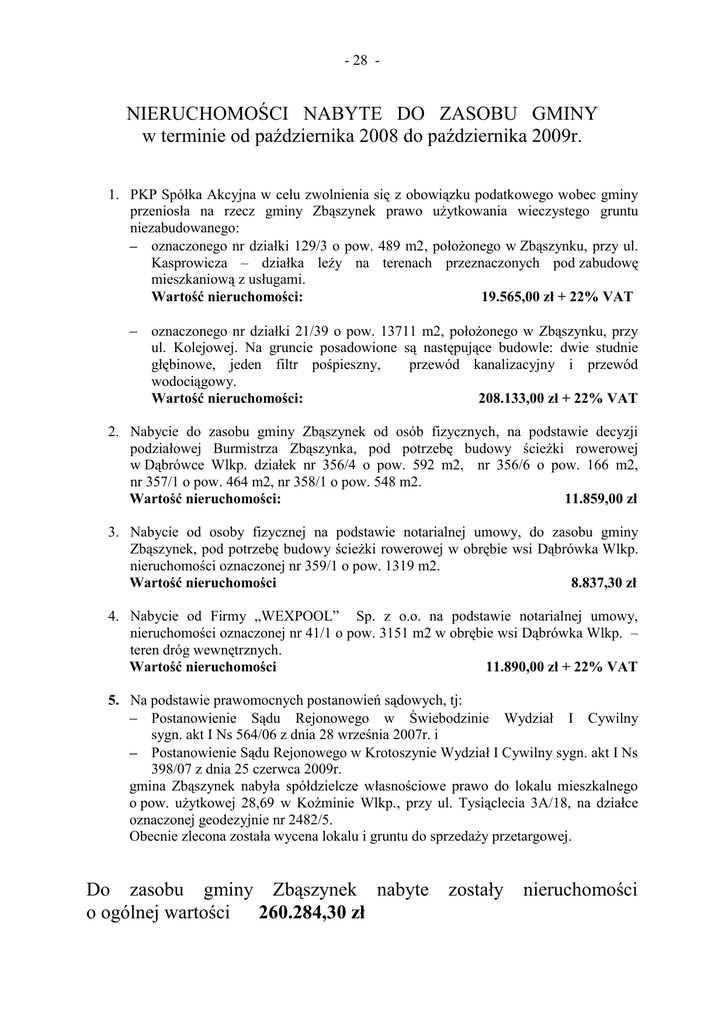 - 28 - NIERUCHOMOŚCI NABYTE DO ZASOBU GMINY w terminie od października 2008 do października 2009r. 1. PKP Spółka Akcyjna w celu zwolnienia się z obowiązku podatkowego wobec gminy przeniosła na rzecz gminy Zbąszynek prawo użytkowania wieczystego gruntu niezabudowanego: oznaczonego nr działki 129/3 o pow. 489 m2, położonego w Zbąszynku, przy ul. Kasprowicza – działka leży na terenach przeznaczonych pod zabudowę mieszkaniową z usługami. Wartość nieruchomości: 19.565,00 zł + 22% VAT oznaczonego nr działki 21/39 o pow. 13711 m2, położonego w Zbąszynku, przy ul. Kolejowej. Na gruncie posadowione są następujące budowle: dwie studnie głębinowe, jeden filtr pośpieszny, przewód kanalizacyjny i przewód wodociągowy. Wartość nieruchomości: 208.133,00 zł + 22% VAT 2. Nabycie do zasobu gminy Zbąszynek od osób fizycznych, na podstawie decyzji podziałowej Burmistrza Zbąszynka, pod potrzebę budowy ścieżki rowerowej w Dąbrówce Wlkp. działek nr 356/4 o pow. 592 m2, nr 356/6 o pow. 166 m2, nr 357/1 o pow. 464 m2, nr 358/1 o pow. 548 m2. Wartość nieruchomości: 11.859,00 zł 3. Nabycie od osoby fizycznej na podstawie notarialnej umowy, do zasobu gminy Zbąszynek, pod potrzebę budowy ścieżki rowerowej w obrębie wsi Dąbrówka Wlkp. nieruchomości oznaczonej nr 359/1 o pow. 1319 m2. Wartość nieruchomości 8.837,30 zł 4. Nabycie od Firmy „WEXPOOL” Sp. z o.o. na podstawie notarialnej umowy, nieruchomości oznaczonej nr 41/1 o pow. 3151 m2 w obrębie wsi Dąbrówka Wlkp. – teren dróg wewnętrznych. Wartość nieruchomości 11.890,00 zł + 22% VAT 5. Na podstawie prawomocnych postanowień sądowych, tj: Postanowienie Sądu Rejonowego w Świebodzinie Wydział I Cywilny sygn. akt I Ns 564/06 z dnia 28 września 2007r. i Postanowienie Sądu Rejonowego w Krotoszynie Wydział I Cywilny sygn. akt I Ns 398/07 z dnia 25 czerwca 2009r. gmina Zbąszynek nabyła spółdzielcze własnościowe prawo do lokalu mieszkalnego o pow. użytkowej 28,69 w Koźminie Wlkp., przy ul. Tysiąclecia 3A/18, na działce oznaczonej geodezyjnie nr 2482/5. Obecnie zlecona została wycena lokalu i gruntu do sprzedaży przetargowej. Do zasobu gminy Zbąszynek nabyte o ogólnej wartości 260.284,30 zł zostały nieruchomości - 29 - SPRZEDAŻ MIENIA KOMUNALNEGO w terminie od października 2008 do października 2009r. I. Sprzedaż w trybie bezprzetargowym 1. Na poprawienie warunków zagospodarowania nieruchomości przyległej - sprzedaż nieruchomości położonej w Zbąszynku, przy ul. Szerokiej oznaczonej nr działki 210/4 o pow. 95 m2, za cenę 5.067,88 zł w tym 22% VAT 2. Sprzedaż nieruchomości położonej w strefie upraw rolniczych, na poprawienie warunków zagospodarowania nieruchomości przyległej. Nieruchomość nie może zostać zagospodarowana jako odrębna nieruchomość budowlana, położona w obrębie wsi Dąbrówka Wlkp., oznaczona nr działki 1233/2 o pow. 700 m2, za cenę 900,00 zł (bez podatku VAT) 3. Oddanie w użytkowanie wieczyste nieruchomości położonej w Zbąszynku, przy ul. Poznańskiej, oznaczonej geodezyjnie nr 666/16 o pow. 235 m2 – na poprawienie warunków zagospodarowania nieruchomości przyległej. Pierwsza wpłata w wysokości 25% wartości nieruchomości tj. 3.333,65 zł w tym 22% VAT 4. Notarialna umowa zamiany sporządzona między gminą Zbąszynek, a osobą fizyczną, w wyniku której osoba fizyczna sprzedała gminie działkę pod ścieżkę rowerową, a gmina Zbąszynek bezprzetargowo na rzecz osoby fizycznej sprzedała działkę w Dąbrówce Wlkp. oznaczoną nr 153/12 o pow. 1319 m2, pod zabudowę mieszkaniową, za cenę 21.434,18 zł w tym 22% VAT 5. Notarialna umowa zamiany sporządzona między gminą Zbąszynek, a firmą „Wexpool” Sp. z o.o., w wyniku której nastąpiła zamiana działek pod drogi dojazdowe do firmy i gruntowe dla rolników. Gmina Zbąszynek bezprzetargowo sprzedała działkę w Dąbrówce Wlkp. oznaczoną nr 1228/1 o pow. 973 m2 i działkę nr 1228/3 o pow. 631 m2, za cenę 14.505,80 zł w tym 22% VAT 6. Sprzedaż bezprzetargowa lokalu mieszkalnego o pow. użytkowej 95,50 m2 na rzecz najemcy przy uwzględnieniu 43% bonifikaty. Lokal mieszkalny w Zbąszynku przy ul. Kilińskiego nr 92, wraz z udziałem 266/1000 części w gruncie - na działce oznaczonej geodezyjnie nr 222/2, za cenę 69.296,00 zł (bez podatku VAT) 7. Nieruchomości zabudowane budynkami garażowymi stanowiącymi odrębny od gruntu przedmiot własności osób fizycznych. Garaże wybudowane zostały na gruncie gminnym na podstawie pozwolenia na budowę z lokalizacją stałą. Podstawową przesłanką był fakt, że osoby fizyczne władały nieruchomością w dniu 5 grudnia 1990r., a także w dniu 1 stycznia 1998r. Sprzedaż bezprzetargowa w zgodności z ustawą o gospodarce nieruchomościami. Sprzedaż prawa wieczystego użytkowania gruntu położonego w obrębie miasta Zbąszynka, przy ul. Długiej: działka nr 500/5 o pow. 20 m2. Pierwsza wpłata w wysokości 25% wartości nieruchomości tj. 847,50 zł (bez podatku VAT) działka nr 500/6 o pow. 21 m2. Pierwsza wpłata w wysokości 25% wartości nieruchomości tj. 882,50 zł (bez podatku VAT) - 30 – I. Sprzedaż w drodze przetargu 1. Sprzedaż lokalu mieszkalnego o pow. użytkowej 22,66 m2 w Zbąszynku przy ul. Wojska Polskiego, na działce oznaczonej geodezyjnie nr 230/12 o pow. 135 m2, za cenę 53.000,00 zł (bez podatku VAT) 2. Nieruchomości zabudowanych budynkami gospodarczymi przewidzianymi do rozbiórki, położonymi w Zbąszynku przy ul. Wojska Polskiego oznaczonymi nr działek: 858//7 o pow. 29 m2, za cenę 4.650,00 zł (bez podatku VAT) 858/4 o pow. 24 m2, za cenę 4.040,00 zł (bez podatku VAT) 858/2 o pow. 30 m2, za cenę 4.850,00 zł (bez podatku VAT) 858/3 o pow. 24 m2, za cenę 4.040,00 zł (bez podatku VAT) Nieruchomości położone w strefie istniejącej zabudowy mieszkaniowo-usługowohandlowej, z możliwością zabudowy gospodarczo-rekreacyjnej. 3. Sprzedaż nieruchomości grunt