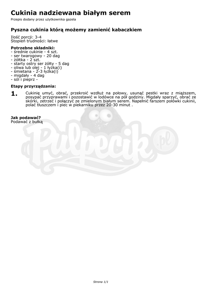 Cukinia nadziewana białym serem Przepis dodany przez użytkownika gazela Pyszna cukinia którą możemy zamienić kabaczkiem Ilość porcji: 3-4 Stopień trudności: łatwe Potrzebne składniki: - średnie cukinie - 4 szt. - ser twarogowy - 20 dag - żółtka - 2 szt. - starty ostry ser żółty - 5 dag - oliwa lub olej - 1 łyżka(i) - śmietana - 2-3 łyżka(i) - migdały - 4 dag - sól i pieprz Etapy przyrządzania: 1. Cukinię umyć, obrać, przekroić wzdłuż na połowy, usunąć pestki wraz z miąższem, posypać przyprawami i pozostawić w lodówce na pół godziny. Migdały sparzyć, obrać ze skórki, zetrzeć i połączyć ze zmielonym białym serem. Napełnić farszem połówki cukinii, polać tłuszczem i piec w piekarniku przez 20-30 minut . Jak podawać? Podawać z bułką Strona 1/1