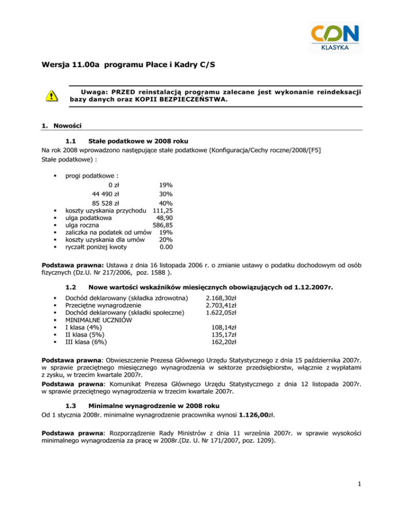 Wersja 11.00a programu Płace i Kadry C/S Uwaga: PRZED reinstalacją programu zalecane jest wykonanie reindeksacji bazy danych oraz KOPII BEZPIECZEŃSTWA. 1. Nowości 1.1 Stałe podatkowe w 2008 roku Na rok 2008 wprowadzono następujące stałe podatkowe (Konfiguracja/Cechy roczne/2008/[F5] Stałe podatkowe) : progi podatkowe : 0 zł 19% 44 490 zł 30% 85 528 zł 40% koszty uzyskania przychodu 111,25 ulga podatkowa 48,90 ulga roczna 586,85 zaliczka na podatek od umów 19% koszty uzyskania dla umów 20% ryczałt poniŜej kwoty 0.00 Podstawa prawna: Ustawa z dnia 16 listopada 2006 r. o zmianie ustawy o podatku dochodowym od osób fizycznych (Dz.U. Nr 217/2006, poz. 1588 ). 1.2 Nowe wartości wskaźników miesięcznych obowiązujących od 1.12.2007r. Dochód deklarowany (składka zdrowotna) Przeciętne wynagrodzenie Dochód deklarowany (składki społeczne) MINIMALNE UCZNIÓW I klasa (4%) II klasa (5%) III klasa (6%) 2.168,30zł 2.703,41zł 1.622,05zł 108,14zł 135,17zł 162,20zł Podstawa prawna: Obwieszczenie Prezesa Głównego Urzędu Statystycznego z dnia 15 października 2007r. w sprawie przeciętnego miesięcznego wynagrodzenia w sektorze przedsiębiorstw, włącznie z wypłatami z zysku, w trzecim kwartale 2007r. Podstawa prawna: Komunikat Prezesa Głównego Urzędu Statystycznego z dnia 12 listopada 2007r. w sprawie przeciętnego wynagrodzenia w trzecim kwartale 2007r. 1.3 Minimalne wynagrodzenie w 2008 roku Od 1 stycznia 2008r. minimalne wynagrodzenie pracownika wynosi 1.126,00zł. Podstawa prawna: Rozporządzenie Rady Ministrów z dnia 11 września 2007r. w sprawie wysokości minimalnego wynagrodzenia za pracę w 2008r.(Dz. U. Nr 171/2007, poz. 1209). 1 1.4 Wskaźnik waloryzacji świadczenia rehabilitacyjnego w I kwartale 2008 roku. Wskaźnik waloryzacji w I kwartale 2008 - wynosi 99,8%. Oznacza to, Ŝe podstawa świadczenia rehabilitacyjnego nie zostanie zwaloryzowana. Podstawa prawna: Obwieszczenie Prezesa Zakładu Ubezpieczeń Społecznych z dnia 20 listopada 2007r. w sprawie wskaźnika waloryzacji podstawy wymiaru zasiłku chorobowego przyjętej do obliczenia świadczenia rehabilitacyjnego w I kwartale 2008r. 1.5 Zmiana składki rentowej w 2008 roku. Od 1 stycznia 2008r. obowiązuje nowy procent składki rentowej: Ubezpieczony – 1,5% Płatnik – 4,5%. 1.6 Roczna podstawa składek emerytalno-rentowych w 2008 roku W momencie udostępniania wersji PIK 11.00a nie zostało opublikowane Obwieszczenie Ministra Pracy i Polityki Społecznej w sprawie rocznej wartości 30-krotności przeciętnego miesięcznego wynagrodzenia. Po jej opublikowaniu wartość będzie moŜna: Samodzielnie uzupełnić, Zaimportować z poziomu Cech roczne (Konfiguracja – Cechy roczne – F10 Pobierz z Internetu). 1.7 Konfiguracja / Kalendarze / Dni wolne / Świąteczne Dodano święta ruchome występujące w 2008r. Są to: 23 marca 2008 – Wielkanoc 24 marca 2008 - Poniedziałek Wielkanocny 22 maja 2008 - BoŜe Ciało 1.8 Nazwa skrócona a system SOD OffLine Dla firm generujących deklaracje do systemu SOD OffLine wprowadzono moŜliwość wpisanie nazwy skróconej firmy. Nazwa ta wykazywana jest na deklaracji infd (PFRON). W związku z tym, w Konfiguracji / Firma / Nazwa i adres dodano pole Nazwa skrócona SOD. Odpowiada jej nowa zmienna lokalna FIR:SKRSOD. Jeśli pole Nazwa skrócona SOD jest: puste – odczytuje wartość z cechy FIR:SKROCONA (działanie jak dotychczas), wypełnione – nazwa skrócona pobierana jest na deklarację z tego pola. 1.9 Pobieranie wskaźników z Internetu UmoŜliwiono pobieranie wskaźników z Internetu. Funkcja dostępna jest z poziomu Konfiguracja \ Cechy roczne lub Cechy miesięczne \ F10\ Pobierz z Internetu. Funkcjonalność dostępna jest tylko dla UŜytkowników posiadających aktualną gwarancję (asystę CDN). W przypadku pobierania z Internetu cech rocznych program dokonuje importu następujących wartości: Stałe podatkowe (progi, procent podatku, koszty uzyskania, ulgę podatkową, roczne koszty uzyskania, zaliczkę podatku od umów), Wskaźniki (roczna postawa składek emerytalno-rentowych). W przypadku pobierania z Internetu cech miesięcznych program dokonuje importu następujących wartości: 2 Wskaźniki (przeciętne wynagrodzenie, dochód deklarowany (skł. społeczne), dochód deklarowany (skł. zdrowotne), minimalne wynagrodzenie pracownika, uczniów I, II, III klasy, podstawa emerytalno-rentowa dla wychowawczych, wskaźnik waloryzacji podstawy zas. chorobowych), Składki ZUS (emerytalne, rentowa firmy i pracownika, chorobowa, FP, FGŚP, składka zdrowotna pobrana i odliczona). Import dokonywany jest dla wybranego miesiąca. Polega na nadpisaniu istniejących wartości. W celu rozpropagowania tych wartości na kolejne miesiące moŜna: Wykonać import dla kolejnych, wybranych miesięcy (F3 wybierz miesiąc i rok – F10 Pobierz z Internetu), Skopiować zaimportowaną wartość na kolejne miesiące (stojąc na danej wartości – F5 skopiuj) 1.10 Informacje o programie - www strona Klienta W aktualnej wersji programu PIK 11.00a wprowadzono moŜliwość automatycznego logowania się do Indywidualnej strony UŜytkownika systemu. Funkcjonalność ta dostępna jest z poziomu Informacji o programie (Menu główne – Ctrl+F1 – F10). Wywołana strona zawiera: Informacje o zainstalowanym programie (nazwa programu, numer seryjny, dane właściciela programu, termin waŜności), Dane teleadresowe Partnera, Informacje o działalności firmy Comarch, Formularza zgłoszenia sugestii do programu, WaŜne linki do stron www. W związku z moŜliwością logowania się do indywidualnej strony Klienta rozszerzono blokady do programu. Na liście Ogólnych praw do programu pojawia się nowa pozycja: Strona www Klienta. Standardowo wszyscy UŜytkownicy mają ustawiony zakaz do logowania się do strony www. Przyznanie prawa do logowania się do strony moŜe dokonać Operator mający status administratora i pełne prawa do programu. Uwaga: Przy wywoływaniu strony www progr