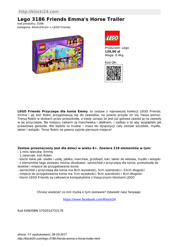 http://klocki24.com Lego 3186 Friends Emma's Horse Trailer kod produktu: 3186 kategoria: Klocki24com > LEGO Friends Producent: Lego 129,90 zł Waga: 0.4kg Kod QR: LEGO Friends Przyczepa dla konia Emmy to zestaw z najnowszej kolekcji LEGO Friends. Emma i jej koń Robin przygotowują się do zawodów, na pewno przyda im się Twoja pomoc. Trenuj Robin w skokach przez przeszkodę, a kiedy uznasz że jest już gotowa zawieź ją na zawody w jej przyczepie. Na miejscu nakarm ją marchewką i jabłkiem, i zadbaj o to aby wyglądała jak prawdziwa gwiazda. Nie będzie to trudne – masz do dyspozycji cały zestaw szczotek, mydło, lakier i wstążki. Teraz Robin na pewno zajmie pierwsze miejsce! Zestaw przeznaczony jest dla dzieci w wieku 6+. Zawiera 218 elementów w tym: - 1 mini laleczkę: Emmę - 1 zwierzak: koń Robin - klocki takie jak: siodło i uzdę, jabłko, marchew, grzebień, łuki, lakier do włosów, mydło i wstążki - z elementów tego zestawu można zbudować: samochód z przyczepą dla konia, przeszkodę do skoków i miejsce do przygotowania konia - samochód z przyczepą dla konia ma 8cm wysokości, 5cm szerokości i 22cm długości - miejsce do przygotowania konia ma 7cm wysokości, 9cm szerokości i 4cm długości - klocki LEGO Friends są całkowicie kompatybilne z klasycznymi klockami LEGO Chcesz wiedzieć co inni myślą o tym zestawie? Odwiedź nasz fanpage: https://www.facebook.com/Klocki24 Kod EAN/ISBN 5702014733176 strona: 1/1 wydrukowano: 08-03-2017 http://klocki24.com/lego-3186-friends-emma-s-horse-trailer.html
