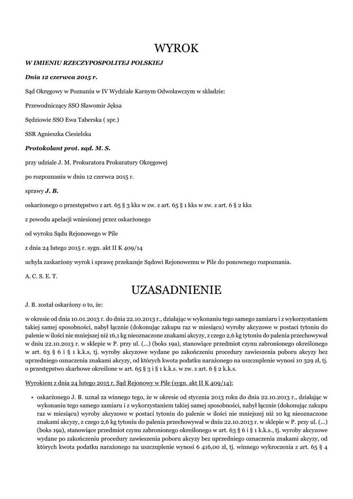 WYROK W IMIENIU RZECZYPOSPOLITEJ POLSKIEJ Dnia 12 czerwca 2015 r. Sąd Okręgowy w Poznaniu w IV Wydziale Karnym Odwoławczym w składzie: Przewodniczący SSO Sławomir Jęksa Sędziowie SSO Ewa Taberska ( spr.) SSR Agnieszka Ciesielska Protokolant prot. sąd. M. S. przy udziale J. M. Prokuratora Prokuratury Okręgowej po rozpoznaniu w dniu 12 czerwca 2015 r. sprawy J. B. oskarżonego o przestępstwo z art. 65 § 3 kks w zw. z art. 65 § 1 kks w zw. z art. 6 § 2 kks z powodu apelacji wniesionej przez oskarżonego od wyroku Sądu Rejonowego w Pile z dnia 24 lutego 2015 r. sygn. akt II K 409/14 uchyla zaskarżony wyrok i sprawę przekazuje Sądowi Rejonowemu w Pile do ponownego rozpoznania. A. C. S. E. T. UZASADNIENIE J. B. został oskarżony o to, że: w okresie od dnia 10.01.2013 r. do dnia 22.10.2013 r., działając w wykonaniu tego samego zamiaru i z wykorzystaniem takiej samej sposobności, nabył łącznie (dokonując zakupu raz w miesiącu) wyroby akcyzowe w postaci tytoniu do palenie w ilości nie mniejszej niż 16,1 kg nieoznaczone znakami akcyzy, z czego 2,6 kg tytoniu do palenia przechowywał w dniu 22.10.2013 r. w sklepie w P. przy ul. (...) (boks 19a), stanowiące przedmiot czynu zabronionego określonego w art. 63 § 6 i § 1 k.k.s, tj. wyroby akcyzowe wydane po zakończeniu procedury zawieszenia poboru akcyzy bez uprzedniego oznaczenia znakami akcyzy, od których kwota podatku narażonego na uszczuplenie wynosi 10 329 zł, tj. o przestępstwo skarbowe określone w art. 65 § 3 i § 1 k.k.s. w zw. z art. 6 § 2 k.k.s. Wyrokiem z dnia 24 lutego 2015 r. Sąd Rejonowy w Pile (sygn. akt II K 409/14): • oskarżonego J. B. uznał za winnego tego, że w okresie od stycznia 2013 roku do dnia 22.10.2013 r., działając w wykonaniu tego samego zamiaru i z wykorzystaniem takiej samej sposobności, nabył łącznie (dokonując zakupu raz w miesiącu) wyroby akcyzowe w postaci tytoniu do palenie w ilości nie mniejszej niż 10 kg nieoznaczone znakami akcyzy, z czego 2,6 kg tytoniu do palenia przechowywał w dniu 22.10.2013 r. w sklepie w P. przy ul. (...) (boks 19a), stanowiące przedmiot czynu zabronionego określonego w art. 63 § 6 i § 1 k.k.s., tj. wyroby akcyzowe wydane po zakończeniu procedury zawieszenia poboru akcyzy bez uprzedniego oznaczenia znakami akcyzy, od których kwota podatku narażonego na uszczuplenie wynosi 6 416,00 zł, tj. winnego wykroczenia z art. 65 § 4 k.k.s. w zw. z art. 65 § 1 k.k.s. w zw. z art. 6 § 2 k.k.s. i za to na podstawie art. 65 § 4 k.k.s. wymierzy mu karę grzywny w wysokości 2 000 złotych, • na podstawie art. 49 § 3 k.k.s. orzekł przepadek na rzecz Skarbu Państwa zabezpieczonych w sprawie dowodów rzeczowych w postaci tytoniu do palenia i nakazał jego zniszczenie, • na podstawie art. 113 § 1 k.k.s. w zw. z art. 627 k.p.k. zasądził od oskarżonego na rzecz Skarbu Państwa koszty sądowe w wysokości 1 067 złotych. Powyższy wyrok został zaskarżony w całości przez oskarżonego, który zarzucił rozstrzygnięciu: 1. mające istotny wpływ na treść orzeczenia naruszenie przepisów postępowania, w tym: a. art. 2 § 1 pkt 2 k.p.k. w zw. z art. 193 § 1 k.p.k. w zw. z art. 8 k.p.w. i art. 42 k.p.w. poprzez niezasięgnięcie opinii biegłego pomimo faktu, iż dla rozstrzygnięcia sprawy potrzebne były wiadomości specjalne, b. art. 5 § 2 k.p.k. w zw. z art. 8 k.p.w. poprzez rozstrzygnięcie niedających się usunąć wątpliwości na niekorzyść oskarżonego i przyjęcie, że nieujawniony w sklepie tytoń, o którego zakupie oskarżony rozmawiał z K. R. był zakupiony przez oskarżonego bez polskich znaków akcyzy, 2. błąd w ustaleniach faktycznych mający wpływ na treść orzeczenia poprzez przyjęcie, że w okresie od stycznia do 22 października 2013 r. oskarżony zakupił nie mniej niż 10 kilogramów tytoniu, nieoznaczonego znakami akcyzy. Oskarżony wniósł o zmianę zaskarżonego wyroku i uniewinnienie go od zarzucanego mu czynu ewentualnie o uchylenie zaskarżonego wyroku i przekazanie sprawy sądowi I instancji do ponownego rozpoznania. Sąd Okręgowy zważył co następuje: Apelacja oskarżonego okazała się zasadna, choć jej wniosek końcowy o zmianę zaskarżonego wyroku i uniewinnienie oskarżonego od stawianego mu zarzutu okazał się przedwczesny. Na wstępie wskazać należy, iż zgodnie ze wskazaniami wynikającymi z art. 2 § 1 pkt 1 i § 2 k.p.k., art. 4 k.p.k., art. 5 § 2 k.p.k., art. 7 k.p.k. i art. 410 k.p.k., stosowanymi odpowiednio w sprawach o przestępstwa i wykroczenia skarbowe (art. 113 § 1 k.k.s.). to na sądzie orzekającym spoczywa obowiązek oparcia ustaleń faktycznych na całokształcie materiału dowodowego ujawnionego w toku rozprawy głównej, przy czym ten Sąd ma mieć na względzie wszystkie okoliczności istotne dla sprawy i dążyć do ich całkowitego wyjaśnienia i w związku z tym w taki sposób prowadzić postępowanie oraz – zgodnie z wymogiem art. 424 § 1 k.p.k. – na Sądzie orzekającym spoczywa obowiązek dokonania – zgodnie z zasadą swobodnej oceny dowodów – pełnej analizy i oceny zgromadzonego i przeprowadzonego materiału dowodowego, która winna być zgodna z zasadami wiedzy i doświadczenia życiowego oraz nie zawierać błędów faktycznych ani logicznych, a przede wszystkim wynikać z kompleksowej, wnikliwej i krytycznej analizy ujawnionego materiału dowodowego. Jednym z podstawowych obowiązków Sądu orzekającego, od którego zależy prawidłowość rozstrzygnięcia sprawy jest zatem przeprowadzenie tego postępowania nie tylko zgodnie z przepisami proceduralnymi ale również do przeprowadzenia z urzędu wszelkich dowodów potrzebnych do ustalenia okoliczności istotnych dla rozstrzygnięcia o winie osoby oskarżonej. Drugi obowiązek sprowadza się natomiast do prawidłowej oceny całokształtu okoliczności ujawnionych w toku rozprawy głównej, a więc poza zasięgiem rozważań Sądu nie mogą pozostać dowody istotne dla rozstrzygnięcia k
