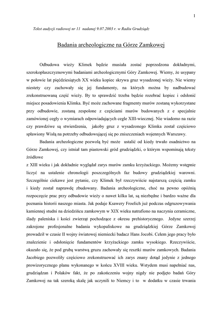 1 Tekst audycji radiowej nr 11 nadanej 9.07.2003 r. w Radiu Grudziądz Badania archeologiczne na Górze Zamkowej Odbudowa wieży Klimek będzie musiała zostać poprzedzona dokładnymi, szerokopłaszczyznowymi badaniami archeologicznymi Góry Zamkowej. Wiemy, że usypany w połowie lat pięćdziesiątych XX wieku kopiec skrywa gruz wysadzonej wieży. Nie wiemy niestety czy zachowały się jej fundamenty, na których można by nadbudować zrekonstruowaną część wieży. By to sprawdzić trzeba będzie rozebrać kopiec i odsłonić miejsce posadowienia Klimka. Być może zachowane fragmenty murów zostaną wykorzystane przy odbudowie, zostaną zespolone z częściami murów budowanych z e specjalnie zamówionej cegły o wymiarach odpowiadających cegle XIII-wiecznej. Nie wiadomo na razie czy prawdziwe są stwierdzenia, jakoby gruz z wysadzonego Klimka został częściowo spławiony Wisłą na potrzeby odbudowującej się po zniszczeniach wojennych Warszawy. Badania archeologiczne pozwolą być może ustalić od kiedy trwało osadnictwo na Górze Zamkowej, czy istniał tam piastowski gród grudziądzki, o którym wspominają teksty źródłowe z XIII wieku i jak dokładnie wyglądał zarys murów zamku krzyżackiego. Możemy wstępnie liczyć na ustalenie chronologii poszczególnych faz budowy grudziądzkiej warowni. Szczególnie ciekawe jest pytanie, czy Klimek był rzeczywiście najstarszą częścią zamku i kiedy został naprawdę zbudowany. Badania archeologiczne, choć na pewno opóźnią rozpoczęcie prac przy odbudowie wieży o nawet kilka lat, są niezbędne i bardzo ważne dla poznania historii naszego miasta. Jak podaje Ksawery Froelich już podczas odgruzowywania kamiennej studni na dziedzińcu zamkowym w XIX wieku natrafiono na naczynia ceramiczne, ślady paleniska i kości zwierząt pochodzące z okresu prehistorycznego. Jedyne szerzej zakrojone profesjonalne badania wykopaliskowe na grudziądzkiej Górze Zamkowej prowadził w czasie II wojny światowej niemiecki badacz Hans Jocobi. Celem jego pracy było znalezienie i odsłonięcie fundamentów krzyżackiego zamku wysokiego. Rzeczywiście, okazało się, że pod grubą warstwą gruzu zachowały się resztki murów zamkowych. Badania Jacobiego pozwoliły częściowo zrekonstruować ich zarys znany dotąd jedynie z jednego prowizorycznego planu wykonanego w końcu XVIII wieku. Wstydem musi napełniać nas, grudziądzan i Polaków fakt, że po zakończeniu wojny nigdy nie podjęto badań Góry Zamkowej na tak szeroką skalę jak uczynili to Niemcy i to w dodatku w czasie trwania 2 wojny! Jedyne badania, które podjęto miały charakter wiertniczy lub sondażowoweryfikacyjny. Ich celem było poszukiwanie śladów przedkrzyżackiego polskiego osadnictwa, a zwłaszcza śladów grodu drewnianego. W roku 1962 oraz 1972 przeprowadzono wiercenia archeologiczne, zaś latem 1992 roku pod kierownictwem profesora Andrzeja Koli z Uniwersytetu Mikołaja Kopernika w Toruniu wykonano wykop o wymiarach 2 i pół na 8 metrów we wschodniej części Góry Zamkowej. Badania powyższe, choć wykazały ślady osadnictwa słowiańskiego co najmniej od X wieku, nie udowodniły istnienia na Górze Zamkowej grodu polskiego. Jedynie szerokopłaszczyznowe wykopaliska mogą rozstrzygnąć problem lokalizacji grudziądzkiego grodu. Wspomniane badania unaoczniły nam jednak skalę problemu, z jakim przyjdzie się zmierzyć w czasie spodziewanych prac badawczych poprzedzających odbudowę Klimka. Chodzi mianowicie o to, że szczyt Góry Zamkowej pokrywa warstwa gruzu ceglanego pochodząca z prac rozbiórkowych prowadzonych na przełomie XVIII i XIX wieku. Warstwa ta dochodzi w niektórych miejscach nawet do 3 metrów grubości. Chcąc dotrzeć do fundamentów zamkowych murów trzeba będzie zwieźć z Góry Zamkowej dziesiątki ton ziemi i gruzu. Spowoduje to być może pewne obniżenie Góry, ale z drugiej zwiększy bezpieczeństwo budowlane rekonstruowanego Klimka. Oprac. Paweł Grochowski