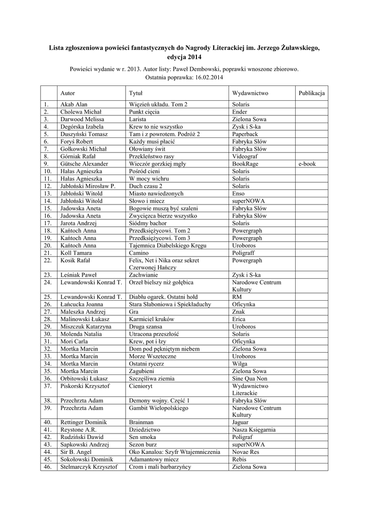 Lista zgłoszeniowa powieści fantastycznych do Nagrody Literackiej im. Jerzego Żuławskiego, edycja 2014 Powieści wydanie w r. 2013. Autor listy: Paweł Dembowski, poprawki wnoszone zbiorowo. Ostatnia poprawka: 16.02.2014 Autor Tytuł Wydawnictwo 1. 2. 3. 4. 5. 6. 7. 8. 9. 10. 11. 12. 13. 14. 15. 16. 17. 18. 19. 20. 21. 22. Akab Alan Cholewa Michał Darwood Melissa Degórska Izabela Duszyński Tomasz Foryś Robert Gołkowski Michał Górniak Rafał Gütsche Alexander Hałas Agnieszka Hałas Agnieszka Jabłoński Mirosław P. Jabłoński Witold Jabłoński Witold Jadowska Aneta Jadowska Aneta Jarota Andrzej Kańtoch Anna Kańtoch Anna Kańtoch Anna Koll Tamara Kosik Rafał Solaris Ender Zielona Sowa Zysk i S-ka Paperback Fabryka Słów Fabryka Słów Videograf BookRage Solaris Solaris Solaris Enso superNOWA Fabryka Słów Fabryka Słów Solaris Powergraph Powergraph Uroboros Poligraff Powergraph 23. 24. Leśniak Paweł Lewandowski Konrad T. Więzień układu. Tom 2 Punkt cięcia Larista Krew to nie wszystko Tam i z powrotem. Podróż 2 Każdy musi płacić Ołowiany świt Przekleństwo rasy Wieczór gorzkiej mgły Pośród cieni W mocy wichru Duch czasu 2 Miasto nawiedzonych Słowo i miecz Bogowie muszą być szaleni Zwycięzca bierze wszystko Siódmy bachor Przedksiężycowi. Tom 2 Przedksiężycowi. Tom 3 Tajemnica Diabelskiego Kręgu Camino Felix, Net i Nika oraz sekret Czerwonej Hańczy Zachwianie Orzeł bielszy niż gołębica 25. 26. 27. 28. 29. 30. 31. 32. 33. 34. 35. 36. 37. Lewandowski Konrad T. Łańcucka Joanna Maleszka Andrzej Malinowski Łukasz Miszczuk Katarzyna Molenda Natalia Mori Carla Mortka Marcin Mortka Marcin Mortka Marcin Mortka Marcin Orbitowski Łukasz Piskorski Krzysztof Diabłu ogarek. Ostatni hołd Stara Słaboniowa i Spiekładuchy Gra Karmiciel kruków Druga szansa Utracona przeszłość Krew, pot i łzy Dom pod pękniętym niebem Morze Wszeteczne Ostatni rycerz Zagubieni Szczęśliwa ziemia Cienioryt 38. 39. Przechrzta Adam Przechrzta Adam Demony wojny. Część 1 Gambit Wielopolskiego 40. 41. 42. 43. 44. 45. 46. Rettinger Dominik Reystone A.R. Rudziński Dawid Sapkowski Andrzej Sir B. Angel Sokołowski Dominik Stelmarczyk Krzysztof Brainman Dziedzictwo Sen smoka Sezon burz Oko Kanaloa: Szyfr Wtajemniczenia Adamantowy miecz Crom i mali barbarzyńcy Zysk i S-ka Narodowe Centrum Kultury RM Oficynka Znak Erica Uroboros Solaris Oficynka Zielona Sowa Uroboros Wilga Zielona Sowa Sine Qua Non Wydawnictwo Literackie Fabryka Słów Narodowe Centrum Kultury Jaguar Nasza Księgarnia Poligraf superNOWA Novae Res Rebis Zielona Sowa Publikacja e-book 47. 48. 49. 50. 51. 52. 53. 54. Szelenbaum Katarzyna Szelenbaum Katarzyna Szelenbaum Katarzyna Szelenbaum Katarzyna Wojdowicz Agnieszka Wolski Marcin Zbierzchowski Cezary Ziemiański Andrzej Wielki Północny Ocean. Bóg Wielki Północny Ocean. Kosmos Wielki Północny Ocean. Los Wielki Północny Ocean. Morze Korona Mandalich Prezydent von Dyzma Holocaust F Pomnik cesarzowej Achai. Tom 2 G+J G+J G+J G+J Nasza Księgarnia Zysk i S-ka Powergraph Fabryka Słów