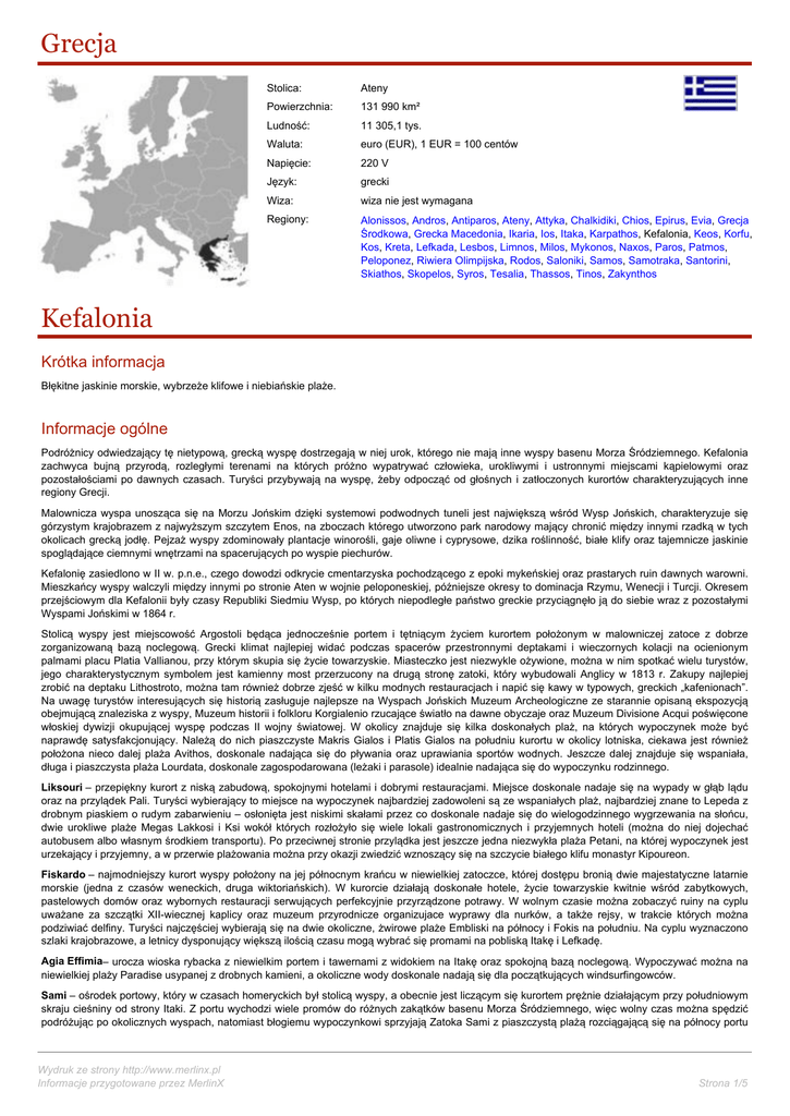 Grecja Stolica: Ateny Powierzchnia: 131 990 km² Ludność: 11 305,1 tys. Waluta: euro (EUR), 1 EUR = 100 centów Napięcie: 220 V Język: grecki Wiza: wiza nie jest wymagana Regiony: Alonissos, Andros, Antiparos, Ateny, Attyka, Chalkidiki, Chios, Epirus, Evia, Grecja Środkowa, Grecka Macedonia, Ikaria, Ios, Itaka, Karpathos, Kefalonia, Keos, Korfu, Kos, Kreta, Lefkada, Lesbos, Limnos, Milos, Mykonos, Naxos, Paros, Patmos, Peloponez, Riwiera Olimpijska, Rodos, Saloniki, Samos, Samotraka, Santorini, Skiathos, Skopelos, Syros, Tesalia, Thassos, Tinos, Zakynthos Kefalonia Krótka informacja Błękitne jaskinie morskie, wybrzeże klifowe i niebiańskie plaże. Informacje ogólne Podróżnicy odwiedzający tę nietypową, grecką wyspę dostrzegają w niej urok, którego nie mają inne wyspy basenu Morza Śródziemnego. Kefalonia zachwyca bujną przyrodą, rozległymi terenami na których próżno wypatrywać człowieka, urokliwymi i ustronnymi miejscami kąpielowymi oraz pozostałościami po dawnych czasach. Turyści przybywają na wyspę, żeby odpocząć od głośnych i zatłoczonych kurortów charakteryzujących inne regiony Grecji. Malownicza wyspa unosząca się na Morzu Jońskim dzięki systemowi podwodnych tuneli jest największą wśród Wysp Jońskich, charakteryzuje się górzystym krajobrazem z najwyższym szczytem Enos, na zboczach którego utworzono park narodowy mający chronić między innymi rzadką w tych okolicach grecką jodłę. Pejzaż wyspy zdominowały plantacje winorośli, gaje oliwne i cyprysowe, dzika roślinność, białe klify oraz tajemnicze jaskinie spoglądające ciemnymi wnętrzami na spacerujących po wyspie piechurów. Kefalonię zasiedlono w II w. p.n.e., czego dowodzi odkrycie cmentarzyska pochodzącego z epoki mykeńskiej oraz prastarych ruin dawnych warowni. Mieszkańcy wyspy walczyli między innymi po stronie Aten w wojnie peloponeskiej, późniejsze okresy to dominacja Rzymu, Wenecji i Turcji. Okresem przejściowym dla Kefalonii były czasy Republiki Siedmiu Wysp, po których niepodległe państwo greckie przyciągnęło ją do siebie wraz z pozostałymi Wyspami Jońskimi w 1864 r. Stolicą wyspy jest miejscowość Argostoli będąca jednocześnie portem i tętniącym życiem kurortem położonym w malowniczej zatoce z dobrze zorganizowaną bazą noclegową. Grecki klimat najlepiej widać podczas spacerów przestronnymi deptakami i wieczornych kolacji na ocienionym palmami placu Platia Vallianou, przy którym skupia się życie towarzyskie. Miasteczko jest niezwykle ożywione, można w nim spotkać wielu turystów, jego charakterystycznym symbolem jest kamienny most przerzucony na drugą stronę zatoki, który wybudowali Anglicy w 1813 r. Zakupy najlepiej zrobić na deptaku Lithostroto, można tam również dobrze zjeść w kilku modnych restauracjach i napić się kawy w typowych, greckich „kafenionach”. Na uwagę turystów interesujących się historią zasługuje najlepsze na Wyspach Jońskich Muzeum Archeologiczne ze starannie opisaną ekspozycją obejmującą znaleziska z wyspy, Muzeum historii i folkloru Korgialenio rzucające światło na dawne obyczaje oraz Muzeum Divisione Acqui poświęcone włoskiej dywizji okupującej wyspę podczas II wojny światowej. W okolicy znajduje się kilka doskonałych plaż, na których wypoczynek może być naprawdę satysfakcjonujący. Należą do nich piaszczyste Makris Gialos i Platis Gialos na południu kurortu w okolicy lotniska, ciekawa jest również położona nieco dalej plaża Avithos, doskonale nadająca się do pływania oraz uprawiania sportów wodnych. Jeszcze dalej znajduje się wspaniała, długa i piaszczysta plaża Lourdata, doskonale zagospodarowana (leżaki i parasole) idealnie nadająca się do wypoczynku rodzinnego. Liksouri – przepiękny kurort z niską zabudową, spokojnymi hotelami i dobrymi restauracjami. Miejsce doskonale nadaje się na wypady w głąb lądu oraz na przylądek Pali. Turyści wybierający to miejsce na wypoczynek najbardziej zadowoleni są ze wspaniałych plaż, najbardziej znane to Lepeda z drobnym piaskiem o rudym zabarwieniu – osłonięta jest niskimi skałami przez co doskonale nadaje się do wielogodzinnego wygrzewania na słońcu, dwie urokliwe plaże Megas Lakkosi i Ksi wokół których rozłożyło się wiele lokali gastronomicznych i przyjemnych hoteli (można do niej dojechać autobusem albo własnym środkiem transportu). Po przeciwnej stronie przylądka jest jeszcze jedna niezwykła plaża Petani, na której wypoczynek jest urzekający i przyjemny, a w przerwie plażowania można przy okazji zwiedzić wznoszący się na szczycie białego klifu monastyr Kipoureon. Fiskardo – najmodniejszy kurort wyspy położony na jej północnym krańcu w niewielkiej zatoczce, której dostępu bronią dwie majestatyczne latarnie morskie (jedna z czasów weneckich, druga wiktoriańskich). W kurorcie działają doskonałe hotele, życie towarzyskie kwitnie wśród zabytkowych, pastelowych domów oraz wybornych restauracji serwujących perfekcyjnie przyrządzone potrawy. W wolnym czasie można zobaczyć ruiny na cyplu uważane za szczątki XII-wiecznej kaplicy oraz muzeum przyrodnicze organizujace wyprawy dla nurków, a także rejsy, w trakcie których można podziwiać delfiny. Turyści najczęściej wybierają się na dwie okoliczne, żwirowe plaże Embliski na północy i Fokis na południu. Na cyplu wyznaczono szlaki krajobrazowe, a letnicy dysponujący większą ilością czasu mogą wybrać się promami na pobliską Itakę i Lefkadę. Agia Effimia– urocza wioska rybacka z niewielkim portem i tawernami z widokiem na Itakę oraz spokojną bazą noclegową. Wypoczywać można na niewielkiej plaży Paradise usypanej z drobnych kamieni, a okoliczne wody doskonale nadają się dla początkujących windsurfingowców. Sami – ośrodek portowy, który w czasach homeryckich był stolicą wyspy, a obecnie jest liczącym się kurortem prężnie działającym przy połu