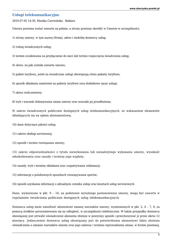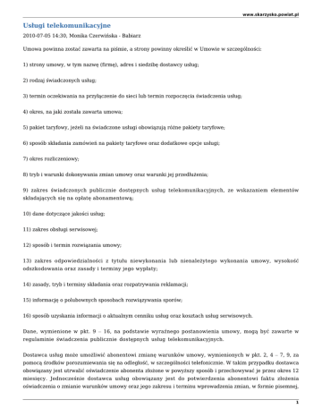www.skarzysko.powiat.pl Usługi telekomunikacyjne 2010-07-05 14:30, Monika Czerwińska - Babiarz Umowa powinna zostać zawarta na piśmie, a strony powinny określić w Umowie w szczególności: 1) strony umowy, w tym nazwę (firmę), adres i siedzibę dostawcy usług; 2) rodzaj świadczonych usług; 3) termin oczekiwania na przyłączenie do sieci lub termin rozpoczęcia świadczenia usług; 4) okres, na jaki została zawarta umowa; 5) pakiet taryfowy, jeżeli na świadczone usługi obowiązują różne pakiety taryfowe; 6) sposób składania zamówień na pakiety taryfowe oraz dodatkowe opcje usługi; 7) okres rozliczeniowy; 8) tryb i warunki dokonywania zmian umowy oraz warunki jej przedłużenia; 9) zakres świadczonych publicznie dostępnych usług telekomunikacyjnych, ze wskazaniem elementów składających się na opłatę abonamentową; 10) dane dotyczące jakości usług; 11) zakres obsługi serwisowej; 12) sposób i termin rozwiązania umowy; 13) zakres odpowiedzialności z tytułu niewykonania lub nienależytego wykonania umowy, wysokość odszkodowania oraz zasady i terminy jego wypłaty; 14) zasady, tryb i terminy składania oraz rozpatrywania reklamacji; 15) informację o polubownych sposobach rozwiązywania sporów; 16) sposób uzyskania informacji o aktualnym cenniku usług oraz kosztach usług serwisowych. Dane, wymienione w pkt. 9 – 16, na podstawie wyraźnego postanowienia umowy, mogą być zawarte w regulaminie świadczenia publicznie dostępnych usług telekomunikacyjnych. Dostawca usług może umożliwić abonentowi zmianę warunków umowy, wymienionych w pkt. 2, 4 – 7, 9, za pomocą środków porozumiewania się na odległość, w szczególności telefonicznie. W takim przypadku dostawca obowiązany jest utrwalić oświadczenie abonenta złożone w powyższy sposób i przechowywać je przez okres 12 miesięcy. Jednocześnie dostawca usług obowiązany jest do potwierdzenia abonentowi faktu złożenia oświadczenia o zmianie warunków umowy oraz jego zakresu i terminu wprowadzenia zmian, w formie pisemnej, 1 www.skarzysko.powiat.pl w terminie 14 dni od dnia jego złożenia. Abonentowi przysługuje prawo odstąpienia od dokonanej zmiany warunków umowy, bez podania przyczyn, poprzez złożenie stosownego oświadczenia w formie pisemnej w terminie 10 dni od dnia otrzymania pisemnego potwierdzenia. Do zachowania tego terminu wystarczy wysłanie oświadczenia przed jego upływem. Powyższe prawo nie przysługuje abonentowi jeżeli dostawca usług rozpoczął świadczenie usług zgodnie ze zmienionymi warunkami umowy za zgodą abonenta. Bardzo ważnymi elementami Umowy o świadczenie usług telekomunikacyjnych są: Regulamin, Regulamin Promocji – jeżeli Umowa zawarta jest na warunkach promocyjnych oraz Cennik. W Regulaminie, podobnie jak w Umowie, powinny w szczególności znaleźć się następujące zapisy: 1) nazwę (firmę), adres i siedzibę dostawcy usług; 2) zakres świadczonych publicznie dostępnych usług telekomunikacyjnych, ze wskazaniem elementów składających się na opłatę za świadczenie usług; 3) standardowe warunki umowy, w tym wskazanie minimalnego czasu trwania umowy, jeżeli taki został określony; 4) zakres obsługi serwisowej; 5) zakres odpowiedzialności z tytułu niewykonania lub nienależytego wykonania umowy, wysokość odszkodowania oraz zasady i terminy jego wypłaty; 6) zasady, tryb i terminy składania oraz rozpatrywania reklamacji; 7) sposób uzyskania informacji o aktualnym cenniku usług oraz kosztach usług serwisowych. Przez cały czas trwania umowy zarówno przedsiębiorca jak i konsument mają obowiązek wykonywać umowę zgodnie z jej warunkami. WAŻNE! W czasie trwania umowy o świadczenie usług telekomunikacyjnych Operator telekomunikacyjny ma prawo dokonać zmian w Regulaminie Świadczenia Usług. O każdej zmianie konsument powinien być poinformowany, przepisy mówią o podaniu informacji do wiadomości publicznej, nie jest ściśle określone w jakiej formie. W przypadku wprowadzenia zmian do Regulaminu Świadczenia Usług konsument ma prawo wyboru, może albo przyjąć proponowane warunki albo odstąpić od umowy bez ponoszenia żadnych kar umownych. Zmiana, która weszła w życie 06.07.2009 r. Art. 60a. 1. Dostawca publicznie dostępnych usług telekomunikacyjnych: (219) 1) doręcza abonentowi na piśmie treść każdej proponowanej zmiany warunków umowy, w szczególności, o której mowa w art. 56 ust. 3, 2) doręcza abonentowi na piśmie oraz podaje do publicznej wiadomości treść każdej proponowanej zmiany warunków umowy określonych w regulaminie, o którym mowa w art. 59 ust. 1, oraz 2 www.skarzysko.powiat.pl 3) podaje do publicznej wiadomości treść każdej proponowanej zmiany warunków umowy określonych w regulaminie, o którym mowa w art. 60 - z wyprzedzeniem co najmniej jednego okresu rozliczeniowego przed wprowadzeniem tych zmian w życie. Jednocześnie abonent powinien zostać poinformowany o prawie wypowiedzenia umowy w przypadku braku akceptacji tych zmian. 2. W razie skorzystania z prawa wypowiedzenia umowy, o którym mowa w ust. 1, dostawcy publicznie dostępnych usług telekomunikacyjnych nie przysługuje roszczenie odszkodowawcze, a także zwrot ulgi, o której mowa w art. 57 ust. 6, o czym abonent powinien zostać także poinformowany. 3. Przepisu ust. 2 nie stosuje się, jeżeli konieczność wprowadzenia zmian, o których mowa w ust. 1, wynika bezpośrednio ze zmiany przepisów prawa, w tym również usunięcia niedozwolonych postanowień umownych. 4. Dostawca publicznie dostępnych usług telekomunikacyjnych niezwłocznie informuje abonentów na piśmie o zmianie nazwy (firmy), adresu lub siedziby dostawcy usług. Informacja o powyższych zmianach nie stanowi zmiany warunków umowy. 5. Dostawca publicznie dostępnych usług telekomunikacyjnych dla użytkowników końcowych usługi przedpłaconej świadczonej w ruchomej publicznej sieci telefonicznej niezwłocznie podaje do publicz