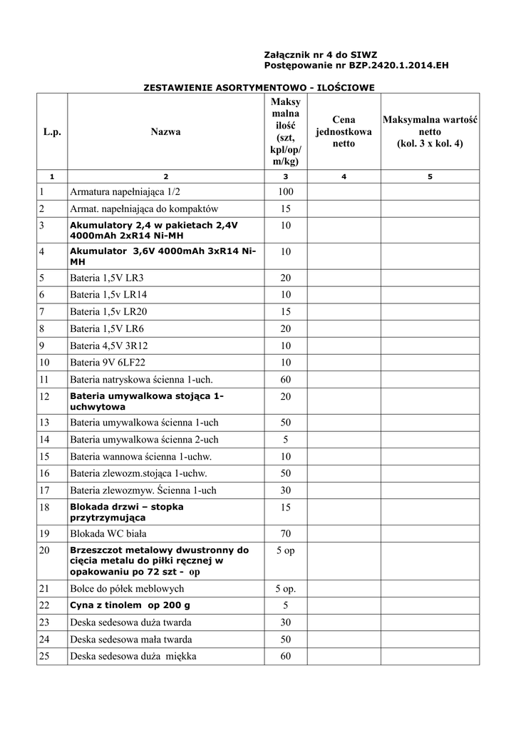 Załącznik nr 4 do SIWZ Postępowanie nr BZP.2420.1.2014.EH ZESTAWIENIE ASORTYMENTOWO - ILOŚCIOWE L.p. Nazwa Maksy malna ilość (szt, kpl/op/ m/kg) 1 2 3 1 Armatura napełniająca 1/2 100 2 Armat. napełniająca do kompaktów 15 3 Akumulatory 2,4 w pakietach 2,4V 4000mAh 2xR14 Ni-MH 10 4 Akumulator 3,6V 4000mAh 3xR14 NiMH 10 5 Bateria 1,5V LR3 20 6 Bateria 1,5v LR14 10 7 Bateria 1,5v LR20 15 8 Bateria 1,5V LR6 20 9 Bateria 4,5V 3R12 10 10 Bateria 9V 6LF22 10 11 Bateria natryskowa ścienna 1-uch. 60 12 Bateria umywalkowa stojąca 1uchwytowa 20 13 Bateria umywalkowa ścienna 1-uch 50 14 Bateria umywalkowa ścienna 2-uch 5 15 Bateria wannowa ścienna 1-uchw. 10 16 Bateria zlewozm.stojąca 1-uchw. 50 17 Bateria zlewozmyw. Ścienna 1-uch 30 18 Blokada drzwi – stopka przytrzymująca 15 19 Blokada WC biała 70 20 Brzeszczot metalowy dwustronny do cięcia metalu do piłki ręcznej w opakowaniu po 72 szt - op 5 op 21 Bolce do półek meblowych 5 op. 22 Cyna z tinolem op 200 g 5 23 Deska sedesowa duŜa twarda 30 24 Deska sedesowa mała twarda 50 25 Deska sedesowa duŜa miękka 60 Cena jednostkowa netto Maksymalna wartość netto (kol. 3 x kol. 4) 4 5 26 Deska sedesowa mała miękka 60 27 Deska strug 35x200x3000 5 28 Dolnopłuk typu zoom do kompaktu Madalena 5 29 Dolnopłuk z wkładem styropianowym 20 30 Dolnopłuk 350x350x140 100 31 Drzwiczki rewizyjne 200x250 20 32 Emalia na trudne plamy 1op. 10 l 10 33 Farba akrylowa biała wewnętrzna w opakowaniach o pojemności 0,9l. 10 34 Farba emulsyjna 10 l op 5 35 Farba przeciw rdzy 0,9 l 5 36 Farba nitro 0,9 l 5 37 Farba olejna biała 1 l 10 38 Zamawiający wykreśla poz. 38 39 Farba spray 0,4 l 10 40 Gips szpachlowy po 2 kg 10 41 Glazura 42 Gips budowlany /po 2kg/ 10 43 Gładź szpachlowa /2kg op/ 10 44 Głowice baterii 1/2 100 45 Głowice baterii 1-uchw. 10 46 Głowica termostatyczna danfoss RTS2600 do zaworu prostego z nastawą ½” 20 47 Głowica termostatyczna schlosser do zaworu prostego ½” 20 48 Gniazdo p/t pojed. 100 49 Gniazdo p/tpodw. 200 50 Gniazdo n/t pojed. 20 51 Gniazdo n/t podwójne 100 52 Gniazdo . n/t poj. herm. 50 53 Gniazdo n/t podwójne herm. 50 54 Gwoździe 3x70 kg-3x80 kg 10 55 Gwoździe tapicerskie 2x20 kg 1 56 Gwoździe pierścieniowe kg 2 57 Kantówka o wymiarach 50x50 o długości 2500mm. 10 58 Kantówka o wymiarach 40x60 o długości 2500mm 20 3mkw 59 Kaseta zwijacza taśmy Ŝaluzji standardowa do pomieszczeń mieszkalnych szerokości 14-15mm 60 Kit szklarski /1kg/i op 5 61 Kit szpachlowy do drewna opak. 5 62 Klamka balkonowa 10 63 Klamka biała, okienna 20 64 Klamka 72 z szyldem 10 65 Klamka 90 z szyldem 200 66 Klamka dwustronna z szyldem 10 67 Klamka do drzwi alum. 6 68 Klamka okienna 40 69 Kalafonia/50/ 10 70 Klej polimerowy 0,2 10 71 Klej do drewna 0,4 10 72 Klej do płytek /5kg/ op 2 73 Klej montaŜowy op 10 74 Kształtki gold system/20 25 75 Klej poxipol 15 76 Klej butapren /0,5 l/ 10 77 Króciec PCV /32,40,50/ giętki 30 78 Klucz meblowy 100 79 Kłódka 60 10 80 Kłódka 40 mm z kluczem 10 81 Kłódka 50mm 10 82 Kolano cz15 15 83 Kolano nastawne 110 PCV 15 84 Kolano OC 15 20 85 Kolano OC 15-7 20 86 Kolano PVC 110/90 20 87 Kołek rozpor. 8x160 100 88 Kołek rozporowy z hakiem /8/ 100 89 Kołek rozporowy 10 500 90 Kołek rozporowy 6,8 zwykłe op po/100/ 100szt 5op 91 Kołki rozporowe 8 /op 110szt/ 92 Kołpak palnika do kuchenek Mastercook: duŜy 10szt., średni 20szt., 10 5 40 mały 10szt. 93 Konfirmaty /100/ 100 94 Korek techniczny mkw - 0,7x 1000x1000mm mkw. 95 Korytka instalacyjne 50 96 Koszulka termokurczliwa 12,7/6,4 50 97 Korki stalowe o średnicy: 1/2cala – 20szt, 3/4cala – 5szt, 1cal – 5szt. 30 98 Kratka wentylacyjna 25x20 50 99 Kratka wentylacyjna 14x14 100 100 Lampka kontrolna typu S 1- Serii E210 LED 115-250V AC 101 Lampka zawieszkowa otwarta z matowym kloszem, oprawka E27W moc 60W 102 Lejek dolnopłuka 50 103 Listwa zaciskowa 4mm2 10 104 Łącznik p/t podw. 50 105 Łącznik n/t podwójny 30 106 Łącznik p/t pojed 100 107 Łącznik n/t pojed. 50 108 Łącznik dzwonek/światło 30 109 Miska ustępowa kompatybilna z systemem 50 110 MontaŜ syfonu umywalki 100 111 MontaŜ syfonu zlewu 20 112 Mufa cz. 15 30 113 Mufa OC 15 15 114 Membrana zaworu nap. 115 Nakrętka M10 - 50szt., M8 - 100szt., M6 - 50szt, 116 Nakrywka palnika do kuchenek Mastercook: duŜy 10szt., średni 20szt., mały 10szt 40 117 Napowietrzacz PCV o średnicy Ø 50 10 118 Nasuwka 110 10 119 Nypel CZ 15 30 120 Nypel 1/2x3/8 mosięŜny redukcyjny 10 121 Nypel OC 15 20 122 Oczyszczacz płyn /100g/ 3 123 Odbojnik gumowy 15 10m2 30 100 1000 200 124 Odpowietrznik automat. 15 25 125 Wywiewka / rura wywiewna PCV Ø160 126 Oprawa awaryjna 8W 1-ZAD. 127 Oprawa awaryjna 2x18W 2-zad. 128 Oprawa halogenowa z czujnikiem ruchu o mocy 100W 10 129 Oprawa OKN 236 50 130 Oprawa świetlówkowa 11W prostokątna 100 131 Oprawa świetl. 2x18 W kwadratowa 30 132 Ostrza 18mm /10szt/ 20 133 Opaski kablowe/ op.100/ 10 134 ObrzeŜe meblowe op.5mb 20 135 Obejmy naprawcze 1,5 cala 3 136 Pakuły /100g/ op 5 137 Papier ścierny pl 20x20. ark 300 138 Pasta poślizgowa 0,3 l 10 139 Pasta uszczelniająca multipak 0,125 l 20 140 Palniki do kuchenek Mastercook: duŜy 5szt, średni 10szt., mały 5szt. 20 141 Perlatory baterii 142 Pianka montaŜowa 0,5 l 5 143 Pasta lutownicza /op/100/ 3 144 Płyta pilśniowa 5 145 Podkładka M10- M-6 kg 146 Przyłącze gazowe z zaworem L=1200mm 147 Pokrywa dolnopłuka 30 148 Pokrętło baterii 30 149 Pręt M10x1000 4 150 Pręt M6x1000 4 151 PrzedłuŜka mos.S 1/2 20 152 Przewód DY4 100 153 Przewód OMYP 2x0,5 mm - 154 Przewód OMY 3x0,75 mb 155 Przewód OMY 2x0,5 mm - mb 156 Przewód LGYśO 3x1,5 mb 100 157 Przewód LGYśO 3x2,5 mb 100 158 Przewód YDYZO 3x2,5 mb 200 29mb 10 2 120 60mkw 5 kg mb mb 5 100mb 100 100mb 159 Przewód YDY śO 3x1,5 mb 160 PrzedłuŜacze z listwą przepięciową cztery gniazda L=5mb 161 Przytrzymywacz drzwi 10 162 Puszka n/t pojed. Elektryczna 4mm kw 50 163 Pokrywa puszki uniwersalnej 200 164 Puszka 60, 70, 80 el