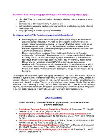 Szanowni Rodzice, pedagog szkolny jest do Waszej dyspozycji, gdy: niepokoi Was zachowanie dziecka, nie wiecie, do kogo możecie zwrócić się o pomoc; zauważacie u dziecka problemy w uczeniu się; potrzebujecie wsparcia, czujecie się bezradni i nie znajdujecie wyjścia z jakiejś trudnej sytuacji; znajdujecie się w trudnej sytuacji materialnej. Co możemy zrobić? Co Państwo mogą zrobić jako rodzice? Najsilniejszym czynnikiem chroniącym przed ryzykownymi zachowaniami jest więź dzieci i rodziców. Wyraża się ona w jednoczesnym stawianiu granic i dawaniu wsparcia „kochaj i wymagaj”. Państwa dzieci, choć są na progu dorosłości, nadal potrzebują środowiska wychowawczego, które Państwo zapewniacie. Umiejętne podtrzymywanie relacji rodzice-dzieci jest warunkiem skutecznej ochrony. Dzieci zawsze biorą z nas przykład. Jeśli sami działamy ryzykownieupijamy się , palimy tytoń, bierzemy narkotyki czy nadmierne ilości leków, to możemy sądzić, że nasze dzieci przejmą te zachowania. Czasami warto rozważyć zmianę własnego sposobu bycia, aby nie cierpiały nasze dzieci. Dzieci powinny wiedzieć jaka jest Państwa opinia o zachowaniach ryzykownych. Dajmy do zrozumienia naszym im, że nie akceptujemy takich zachowań , warto wtedy podkreślić, że motywem Państwa stanowiska jest troska o ich dobro. Przy dzisiejszym zabieganiu mogą nie zauważyć, że są kochane. Dzisiejsze okoliczności życia sprzyjają odsuwaniu się ludzi od siebie. Bycie w kontakcie, bycie razem, tworzenie wspólnoty może wymagać wysiłku, który bardzo się opłaca. Chociaż Państwa dzieci są już niemal dorosłe, to nadal najważniejszym azylem jest dla nich rodzina. Tam mogą się schronić przed burzami życia. Ważne, aby Państwa dzieci widziały i czuły, że ich dom rodzinny jest zawsze takim cennym azylem, pewnym schronieniem, miejscem pozbawionym przemocy i ryzyka. Miejscem, w którym każdy czuje się w pełni akceptowany w swoim człowieczeństwie. WAŻNE ADRESY Wykaz instytucji i placówek świadczących pomoc rodzinie na terenie powiatu oleckiego Powiatowe Centrum Pomocy Rodzinie w Olecku, ul. Gołdapska 23, 19-400 Olecko, pn.-pt. 7.30-15.30, (87) 520 34 302 Specjalistyczny Ośrodek Wsparcia dla Ofiar Przemocy w Rodzinie przy PCPR w Olecku, ul. Gołdapska 23, 19-400 Olecko, pn.-pt. 7.30-15.30, (87) 520 34 302 Ośrodek Interwencji Kryzysowej przy PCPR w Olecku, ul. Gołdapska 23, 19400 Olecko, pn.-pt. 7.30-15.30, (87) 520 34 302 Młodzieżowy Klub Integracji Społecznej przy PCPR w Olecku, ul. Gołdapska 23, 19-400 Olecko, pn.-pt. 7.30-15.30, (87) 520 34 302 Poradnia Psychologiczno-Pedagogiczna w Olecku, ul. Zamkowa 2, 19-400 Olecko, (87) 523 93 38 Niepubliczna Poradnia Psychologiczno-Pedagogiczna przy ŚDS w Olecku, ul. Armii Krajowej 26, 19-400 Olecko, (87) 520 33 85 Miejski Ośrodek Pomocy Społecznej w Olecku, ul. Kolejowa 31, 19-400 Olecko, (87) 520 42 33 Gminny Ośrodek Pomocy Społecznej w Kowalach Oleckich, ul. Kościuszki 44, 19-420 Kowale Oleckie, (87) 523 82 48 Gminny Ośrodek Pomocy Społecznej w Świętajnie, Świętajno 104, 19-411 Świętajno, (87) 521 54 18 Punkt Konsultacyjny dla Osób Uzależnionych w Świętajnie, 19-411 Świętajno, (87) 521 54 20 Gminny Ośrodek Pomocy Społecznej w Wieliczkach, ul. Lipowa 16, 19-404,Wieliczki, (87) 521 42 37 Środowiskowy Dom Samopomocy w Olecku, ul. Armii Krajowej 26, 19-400 Olecko, (87) 520 33 85 Środowiskowy Dom Samopomocy we Wronkach, Wronki 36, 19-411 Świętajno, dni robocze w godz. 7.30 – 15.30, (87) 520 14 92 Środowiskowy Dom Samopomocy w Kowalach Oleckich, ul. Kościuszki 29, 19 -420 Kowale Oleckie, (87) 610 01 69 NZOZ Poradnia Terapii Uzależnienia od Alkoholu, Narkotyków i Współuzależnienia w Olecku, ul. Nocznickiego 15, 19-400 Olecko, (87) 520 45 91 Punkt konsultacyjno-informacyjny dla Ofiar Przemocy w Rodzinie w Olecku, ul. Nocznickiego 15, 19-400 Olecko, (87) 520 15 03, 520 45 91 Środowiskowe Ognisko wychowawcze ,,Puchatek” TPD W Olecku, 19-400 Olecko, (87) 520 33 95 Poradnia Zdrowia Psychicznego w Olecku, ul. 11 Listopada 23, 507 125 845 Szanowni Państwo! Sięganie przez młodzież po substancje psychoaktywne, w tym dopalacze, to palący problem współczesności. Warto w związku z tym wiedzieć, gdzie poszukiwać pomocy w sytuacjach zagrożenia zdrowia dzieci i młodzieży spowodowanych zażyciem dopalaczy. 800 060 800 – bezpłatna, całodobowa infolinia Głównego Inspektora Sanitarnego. Znajdziecie tu Państwo informacje na temat negatywnych skutków zażywania dopalaczy, możliwości leczenia. 800 100 100 , [email protected] – bezpłatna, anonimowa pomoc telefoniczna oraz online dla rodziców i nauczycieli w sprawach bezpieczeństwa dzieci. Otrzymacie tu Państwo wsparcie w sytuacjach związanych między innymi z zagrożeniem nowymi technologiami, cyberprzemocą, kontaktem z substancjami psychoaktywnymi, uzależnieniem, zaburzeniami odżywiania, depresją. Telefon prowadzi Fundacja: Dzieci Niczyje, linia dostępna od poniedziałku do piątku w godzinach: 12.00 – 18.00. 801 199 990 – Ogólnopolski Telefon Zaufania Narkotyki – Narkomania. Pod tym numerem specjaliści udzielają wsparcia w sytuacjach trudnych, informują na temat ryzyka używania narkotyków i dopalaczy. Telefon jest prowadzony przez Krajowe Biuro ds. Przeciwdziałania Narkomanii i czynny jest codziennie w godzinach: 16.00 – 21.00. Poradnia internetowa www.narkomania.org.pl – anonimowa pomoc online lekarza psychiatry, psychologa i prawnika. Poradnia prowadzona na zlecenie Krajowego Biura ds. Przeciwdziałania Narkomanii. Stop dopalaczom Krajowe Biuro Do Spraw Przeciwdziałania Narkomanii, w ramach Kampanii Ministerstwa Zdrowia i Krajowego Biura ds. Przeciwdziałania Narkomanii, umieściło na swojej stronie internetowej ulotkę dla rodziców - Nasze dzieci i zagrożenia Dopalacze - wypalacze. Zachęcamy wszystkich rodziców do zapoznania się z jej treścią.