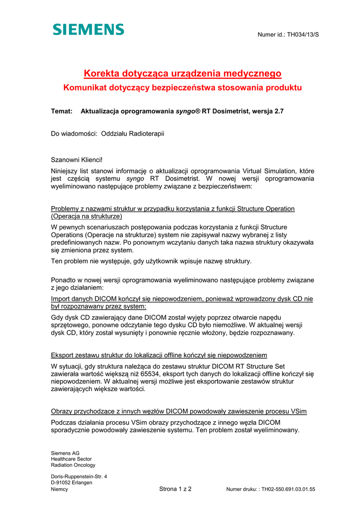 Numer id.: TH034/13/S Korekta dotycząca urządzenia medycznego Komunikat dotyczący bezpieczeństwa stosowania produktu Temat: Aktualizacja oprogramowania syngo® RT Dosimetrist, wersja 2.7 Do wiadomości: Oddziału Radioterapii Szanowni Klienci! Niniejszy list stanowi informację o aktualizacji oprogramowania Virtual Simulation, które jest częścią systemu syngo RT Dosimetrist. W nowej wersji oprogramowania wyeliminowano następujące problemy związane z bezpieczeństwem: Problemy z nazwami struktur w przypadku korzystania z funkcji Structure Operation (Operacja na strukturze) W pewnych scenariuszach postępowania podczas korzystania z funkcji Structure Operations (Operacje na strukturze) system nie zapisywał nazwy wybranej z listy predefiniowanych nazw. Po ponownym wczytaniu danych taka nazwa struktury okazywała się zmieniona przez system. Ten problem nie występuje, gdy użytkownik wpisuje nazwę struktury. Ponadto w nowej wersji oprogramowania wyeliminowano następujące problemy związane z jego działaniem: Import danych DICOM kończył się niepowodzeniem, ponieważ wprowadzony dysk CD nie był rozpoznawany przez system: Gdy dysk CD zawierający dane DICOM został wyjęty poprzez otwarcie napędu sprzętowego, ponowne odczytanie tego dysku CD było niemożliwe. W aktualnej wersji dysk CD, który został wysunięty i ponownie ręcznie włożony, będzie rozpoznawany. Eksport zestawu struktur do lokalizacji offline kończył się niepowodzeniem W sytuacji, gdy struktura należąca do zestawu struktur DICOM RT Structure Set zawierała wartość większą niż 65534, eksport tych danych do lokalizacji offline kończył się niepowodzeniem. W aktualnej wersji możliwe jest eksportowanie zestawów struktur zawierających większe wartości. Obrazy przychodzące z innych węzłów DICOM powodowały zawieszenie procesu VSim Podczas działania procesu VSim obrazy przychodzące z innego węzła DICOM sporadycznie powodowały zawieszenie systemu. Ten problem został wyeliminowany. Siemens AG Healthcare Sector Radiation Oncology Doris-Ruppenstein-Str. 4 D-91052 Erlangen Niemcy Strona 1 z 2 Numer druku: : TH02-550.691.03.01.55 Numer id.: TH034/13/S Odczytywanie z dysku CD danych zawierających znak specjalny kończyło się niepowodzeniem W sytuacji, gdy etykieta dysku CD zawierała znak specjalny, zaimportowanie zawartości dysku CD do przeglądarki pacjentów w systemie było niemożliwe. Ten problem został wyeliminowany. Niniejszy komunikat dotyczący bezpieczeństwa stosowania produktu należy dołączyć do rozdziału „Listy z poradami dotyczącymi bezpieczeństwa” w podręczniku użytkownika systemu syngo RT Dosimetrist. O opisywanej aktualizacji zostanie powiadomiony odpowiedni urząd. Przepraszamy za wszelkie niedogodności wynikające z tego problemu i z góry dziękujemy za zrozumienie. Z poważaniem, podpisano: Gabriel Haras Dyrektor Generalny, Radiation Oncology podpisano: René Lennert Naczelnik działu QM&RA, Radiation Oncology Niniejszy dokument jest ważny bez oryginalnego podpisu. Siemens AG Healthcare Sector Radiation Oncology Doris-Ruppenstein-Str. 4 D-91052 Erlangen Niemcy Strona 2 z 2 Numer druku: TH02-550.691.03.01.55