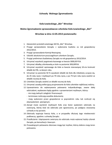 Uchwały Walnego Zgromadzenia Koła Łowieckiego „Bór” Wrocław Walne Zgromadzenie sprawozdawcze członków Koła Łowieckiego „Bór” Wrocław w dniu 12.05.2013 postanowiło: 1. Zatwierdzić protokół ostatniego WZ KŁ „Bór” Wrocław. 2. Przyjąć sprawozdanie Zarządu z wykonania budżetu za rok gospodarczy 2012/2013. 3. Przyjąć sprawozdanie Komisji Rewizyjnej. 4. Udzielić absolutorium poszczególnym członkom Zarządu. 5. Przyjąć preliminarz budżetowy Zarządu na rok gospodarczy 2013/2014. 6. Utrzymać wysokość pogotowia kasowego w kwocie 3000,00 PLN. 7. Utrzymać składkę członkowską w kole na poziomie 300,00PLN. 8. Utrzymać wysokość wpisowego do Koła w kwocie stanowiącej 10-cio krotność składki do PZŁ, w danym roku. 9. Utrzymać na poziomie 50 % wysokość składki do Koła dla młodzieży uczącej się, do 25 roku życia i myśliwych po 70 roku życia, a po 75-tym roku życia zwolnić ze składki rocznej do Koła. 10. Członków Zarządu zwolnić ze składki rocznej do Koła. 11. Utrzymać zasadę preferującą przyjmowanie do Koła członków najbliższej rodziny. 12. Upoważnienia do wykonywania polowania indywidualnego, zwane dalej odstrzałami, wydawane będą zgodnie z uprawnieniami myśliwym, którzy: - nie mają żadnych zaległości finansowych - terminowo rozliczają wszelkie dokumenty - mają wykonane prace gospodarcze w poprzednim roku lub rozliczyli się ekwiwalentem pieniężnym. 13. Zarząd może wyróżnić myśliwych Koła oraz Gości wydaniem odstrzału na zwierzynę, której ilość do odstrzału jest ograniczona, po podjęciu stosownej uchwały w tej sprawie. 14. Odstrzały wypisuje łowczy Koła, a w przypadku dłuższej Jego nieobecności podłowczy, zgodnie z uchwałą Zarządu. 15. Przedłużenie i dopisywanie zwierzyny do odstrzału może wykonać każdy członek Zarządu, po konsultacji z łowczym . 16. Prowadzącymi polowania zbiorowe mogą być myśliwi, którzy dobrze znają teren polowania. 17. Od 1-go kwietnia do zbioru kukurydzy, pozyskanie dzików poza uprawami rolnymi jest dopuszczalne tylko w porze dziennej. 18. Członkowie Koła mogą zapraszać Gości na polowania zbiorowe po wyrażeniu zgody przez prowadzącego polowanie. Na polowania uroczyste i z ambon zaprasza prezes Koła. Maksymalna liczba Gości wynosi 5 osób. 19. Zaproszony na polowanie indywidualne Gość poluje tylko w obecności myśliwego-opiekuna (członka KŁ „Bór” Wrocław) i w tym samym rejonie. Myśliwy-opiekun występujący o odstrzał dla Gościa jest odpowiedzialny za rozliczenie pozyskanej zwierzyny pod względem obiegu dokumentów, rozliczeń finansowych i zwrotu nieważnych odstrzałów, w ustalonych terminach z łowczym Koła. 20. Myśliwy Gość może otrzymać odstrzał na 1 miesiąc i przedłużyć na miesiąc następny za odpłatnością 100 PLN, ewentualnie za wykonanie konkretnych, określonych prac. 21. Pracownicy ALP oraz myśliwi –rolnicy właściciele dużych upraw rolnych na danym obwodzie, nie będący członkami naszego Koła, mogą polować bez opiekuna. Myśliwi-rolnicy są zobowiązani do powiadomienia opiekuna o terminie polowania. 22. Zobowiązuje się członków Koła do spokojnego zachowywania się w łowisku, a w przypadku poruszania się samochodem po terenach leśnych należy w widocznym miejscu, za szybą, wyłożyć indywidualny identyfikator myśliwego. 23. Do „Książki ewidencji pobytu myśliwych w łowisku” należy wpisywać się tylko osobiście. Nie ma wyznaczonej osoby upoważnionej do dokonywania wpisów za innego myśliwego. Można wypisywać się w następujący sposób; - w porze dziennej, na dwa sąsiadujące ze sobą rejony, - w porze nocnej, na jedną ambonę lub zwyżkę. 24. Polowanie indywidualne, w przeddzień zaplanowanego polowania zbiorowego na danym obwodzie, może być realizowane tylko z urządzeń łowieckich do godz. 24.00. Na drugim obwodzie obowiązuje zakaz polowania w godz. 8.00-14.00 w dniu polowania zbiorowego. 25. Duże dziki ( wycinki i odyńce ) , w ilości 10 % planu rocznego, wolno strzelać od 15 sierpnia do końca roku łowiecko-gospodarczego. 26. Pozyskanie każdej sztuki zwierzyny grubej musi być zgłoszone łowczemu Koła w ciągu 24 godzin. 27. Wykonane i nieważne odstrzały, dokumenty PZ oraz protokoły pobrania tusz na użytek własny, muszą być rozliczone z łowczym lub osobą Jego zastępującą w terminie 14 dni od daty dokonania odstrzału lub utraty ważności. 28. Wszystkie faktury z zakupów na rzecz Koła, wystawione na Koło Łowieckie „Bór” Wrocław, muszą być rozliczone ze skarbnikiem Koła w terminie 14 dni od daty wystawienia. 29. Zobowiązuje się skarbnika do bezwzględnego egzekwowania na bieżąco, wszelkich należności od członków Koła oraz Gości , wzywając ich pisemnie do uregulowania zadłużeń. 30. Wszelkie prace gospodarcze w łowiskach muszą być uzgodnione z łowczym ze względu na istotne informacje posiadane przez Zarząd Koła i obowiązujące zasady zagospodarowania łowisk polnych i leśnych. Rozliczenie indywidualnych prac gospodarczych musi być dostarczone łowczemu do połowy miesiąca, po zakończeniu kwartału. 31. Trofeum zwierzyny pozyskanej zgodnie z zasadami selekcji i wykonywania polowania oraz etyką łowiecką, przekazuje się myśliwemu, który daną zwierzynę pozyskał, jako formę rekompensaty za poniesione koszty preparacji. 32. Trofeum zwierzyny pozyskanej niezgodnie z udzielonym odstrzałem na polowaniu indywidualnym lub zasadami selekcji osobniczej na polowaniu zbiorowym, pozostaje własnością Koła Łowieckiego „Bór” Wrocław. 33. Zwierzynę drobną pozyskaną zgodnie z posiadanym odstrzałem na polowaniu indywidualnym lub zasadami gospodarki populacjami zwierząt łownych na polowaniu zbiorowym przekazuje się myśliwemu, który tę zwierzynę pozyskał, po zapłaceniu ekwiwalentu w wysokości 50 PLN. Należność płatna jest do końca roku gospodarczo-łowieckiego, tj. do 31.03. 3