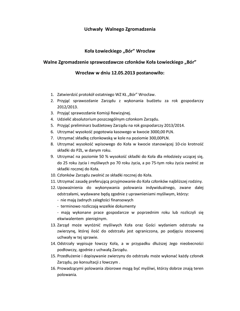 Uchwały Walnego Zgromadzenia Koła Łowieckiego „Bór” Wrocław