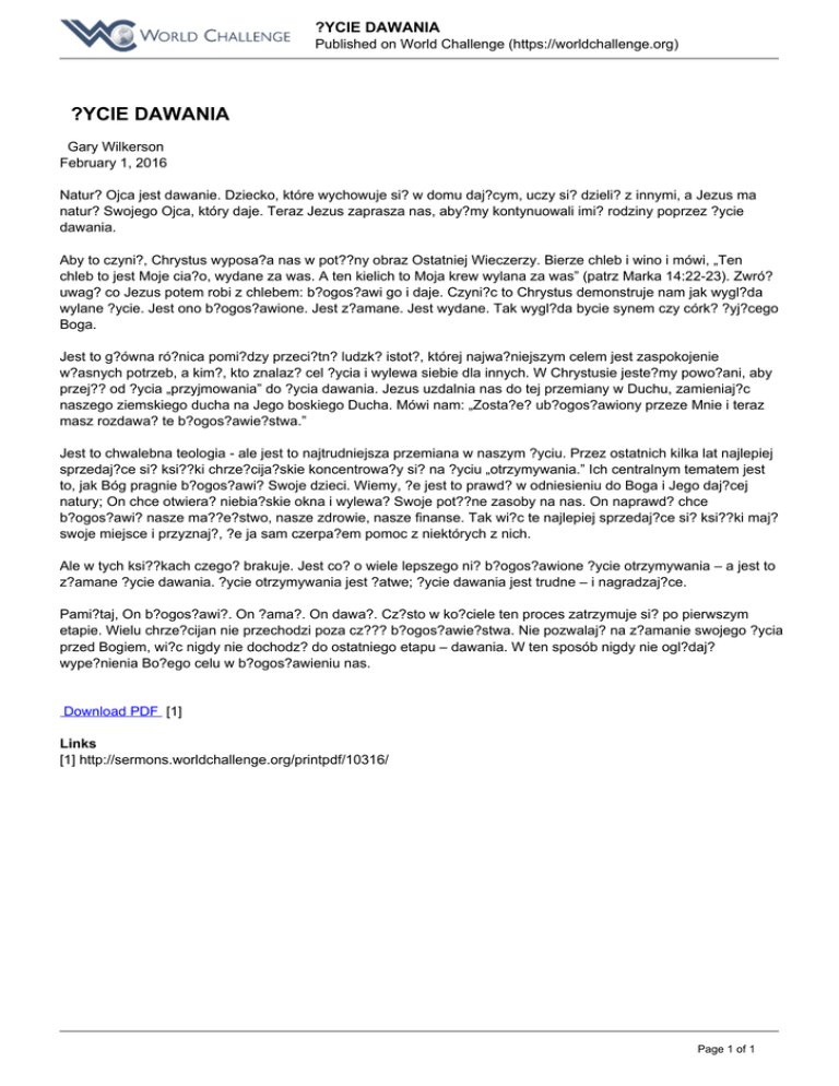 ?YCIE DAWANIA Published on World Challenge (https://worldchallenge.org) ?YCIE DAWANIA Gary Wilkerson February 1, 2016 Natur? Ojca jest dawanie. Dziecko, które wychowuje si? w domu daj?cym, uczy si? dzieli? z innymi, a Jezus ma natur? Swojego Ojca, który daje. Teraz Jezus zaprasza nas, aby?my kontynuowali imi? rodziny poprzez ?ycie dawania. Aby to czyni?, Chrystus wyposa?a nas w pot??ny obraz Ostatniej Wieczerzy. Bierze chleb i wino i mówi, „Ten chleb to jest Moje cia?o, wydane za was. A ten kielich to Moja krew wylana za was” (patrz Marka 14:22-23). Zwró? uwag? co Jezus potem robi z chlebem: b?ogos?awi go i daje. Czyni?c to Chrystus demonstruje nam jak wygl?da wylane ?ycie. Jest ono b?ogos?awione. Jest z?amane. Jest wydane. Tak wygl?da bycie synem czy córk? ?yj?cego Boga. Jest to g?ówna ró?nica pomi?dzy przeci?tn? ludzk? istot?, której najwa?niejszym celem jest zaspokojenie w?asnych potrzeb, a kim?, kto znalaz? cel ?ycia i wylewa siebie dla innych. W Chrystusie jeste?my powo?ani, aby przej?? od ?ycia „przyjmowania” do ?ycia dawania. Jezus uzdalnia nas do tej przemiany w Duchu, zamieniaj?c naszego ziemskiego ducha na Jego boskiego Ducha. Mówi nam: „Zosta?e? ub?ogos?awiony przeze Mnie i teraz masz rozdawa? te b?ogos?awie?stwa.” Jest to chwalebna teologia - ale jest to najtrudniejsza przemiana w naszym ?yciu. Przez ostatnich kilka lat najlepiej sprzedaj?ce si? ksi??ki chrze?cija?skie koncentrowa?y si? na ?yciu „otrzymywania.” Ich centralnym tematem jest to, jak Bóg pragnie b?ogos?awi? Swoje dzieci. Wiemy, ?e jest to prawd? w odniesieniu do Boga i Jego daj?cej natury; On chce otwiera? niebia?skie okna i wylewa? Swoje pot??ne zasoby na nas. On naprawd? chce b?ogos?awi? nasze ma??e?stwo, nasze zdrowie, nasze finanse. Tak wi?c te najlepiej sprzedaj?ce si? ksi??ki maj? swoje miejsce i przyznaj?, ?e ja sam czerpa?em pomoc z niektórych z nich. Ale w tych ksi??kach czego? brakuje. Jest co? o wiele lepszego ni? b?ogos?awione ?ycie otrzymywania – a jest to z?amane ?ycie dawania. ?ycie otrzymywania jest ?atwe; ?ycie dawania jest trudne – i nagradzaj?ce. Pami?taj, On b?ogos?awi?. On ?ama?. On dawa?. Cz?sto w ko?ciele ten proces zatrzymuje si? po pierwszym etapie. Wielu chrze?cijan nie przechodzi poza cz??? b?ogos?awie?stwa. Nie pozwalaj? na z?amanie swojego ?ycia przed Bogiem, wi?c nigdy nie dochodz? do ostatniego etapu – dawania. W ten sposób nigdy nie ogl?daj? wype?nienia Bo?ego celu w b?ogos?awieniu nas. Download PDF [1] Links [1] http://sermons.worldchallenge.org/printpdf/10316/ Page 1 of 1