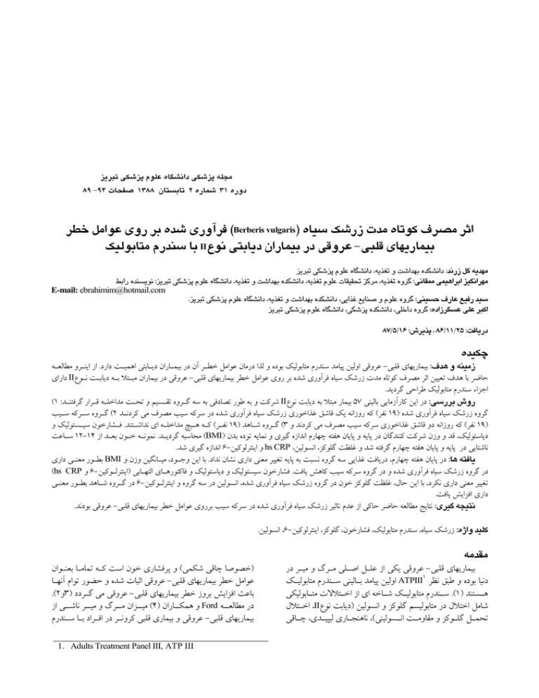 żƿźŞţƾƨƃżěƭƺƬƗƵŚĮƄƳřŵƾƨƃżěƶƬŬƯ ÕÖÖÑšŚŰƠƇÎÐÕÕƱŚŤƀŝŚţÏƵŹŚưƃÐÎƵŹƹŵ źƐųƪƯřƺƗƽƹŹźŝƵŶƃƽŹƹōźƟBerberis vulgarisƵŚǀſĨƃŹŻšŶƯƵŚţƺĩƝźƈƯźŧř ĨǀƫƺŝŚŤƯƭŹŶƴſŚŝIIƕƺƳƾŤŝŚƿŵƱřŹŚưǀŝŹŵƾƣƹźƗƾŞƬƣƽŚƸƿŹŚưǀŝ żƿźŞţƾƨƃżěƭƺƬƗƵŚĮƄƳřŵƶƿŸƜţƹŢƃřŶƸŝƵŶƨƄƳřŵŶƳŹŻƪĭƶƿŶƸƯ ƎŝřŹƵŶƴƀƿƺƳżƿźŞţƾƨƃżěƭƺƬƗƵŚĮƄƳřŵƶƿŸƜţƹŢƃřŶƸŝƵŶƨƄƳřŵƶƿŸƜţƭƺƬƗšŚƤǀƤŰţżĩźƯƶƿŸƜţƵƹźĭƾƳŚƤưƯƾưǀƷřźŝřżǀĮƳřźƸƯ E-mail: [email protected] żƿźŞţƾƨƃżěƭƺƬƗƵŚĮƄƳřŵƶƿŸƜţƹŢƃřŶƸŝƵŶƨƄƳřŵƾƿřŸƛƖƿŚƴƇƹƭƺƬƗƵƹźĭƾƴǀƀůƝŹŚƗƖǀƟŹŶǀſ żƿźŞţƾƨƃżěƭƺƬƗƵŚĮƄƳřŵƾĪƃżěƵŶƨƄƳřŵƾƬųřŵƵƹźĭƵŵřŻźĮƀƗƾƬƗźŞĩř ÕÔÒÎÓƁźƿŸěÕÓÎÎÏÒŢƟŚƿŹŵ ƵŶǀĪģ ƶºƘƫŚƐƯƹźºƴƿřŻřŵŹřŵŢºǀưƷřƾŤŝŚºƿŵƱřŹŚºưǀŝŹŵƱōźºƐųƪƯřƺƗƱŚƯŹŵřŸƫƹƵŵƺŝĨǀƫƺŝŚŤƯƭŹŶƴſŶƯŚǀěƲǀƫƹřƾƣƹźƗƾŞƬƣƽŚƸƿŹŚưǀŝƝŶƷƹƶƴǀƯŻ ƽřŹřŵIIƕƺºƳŢºŝŚƿŵƶºŝLjŤºŞƯƱřŹŚưǀŝŹŵƾƣƹźƗƾŞƬƣƽŚƸƿŹŚưǀŝźƐųƪƯřƺƗƽƹŹźŝƵŶƃƽŹƹōźƟƵŚǀſĨƃŹŻšŶƯƵŚţƺĩƝźƈƯźŧřƲǀǀƘţƝŶƷŚŝźƋŚů ŶƿŵźĭƾůřźƏĨǀƫƺŝŚŤƯƭŹŶƴſŌřżūř æŶºƴŤƟźĭŹřźºƣƶºƬųřŶƯŢºŰţƹƮǀƀºƤţƵƹźºĭƶſƶŝƾƟŵŚƈţŹƺƏƶŝƹŢĩźƃIIƕƺƳŢŝŚƿŵƶŝLjŤŞƯŹŚưǀŝêìƾƴǀƫŚŝƾƿŚƯŻōŹŚƧƲƿřŹŵƾſŹźŝƁƹŹ ŜǀºſƶĩźºſƵƹźºĭçŶºƳŵźĩƾƯƝźƈƯŜǀſƶĩźſŹŵƵŶƃƽŹƹōźƟƵŚǀſĨƃŹŻƽŹƺųřŸƛƢƃŚƣĨƿƶƳřŻƹŹƶĩźƠƳæîƵŶƃƽŹƹōźƟƵŚǀſĨƃŹŻƵƹźĭ ƹĨǀƫƺŤƀºǀſƱƺųŹŚƄºƟŶƴŤºƃřŶƳƽřƶºƬųřŶƯĢǀºƷƶºĩźºƠƳæîŶƷŚºƃƵƹźºĭèƹŶƳŵźĩƾƯƝźƈƯŜǀſƶĩźſƽŹƺųřŸƛƢƃŚƣƹŵƶƳřŻƹŹƶĩźƠƳæî ŢƗŚºſæçæéŻřŶºƘŝƱƺºųƶºƳƺưƳŶºƿŵźĭƶŞſŚŰƯBMIƱŶŝƵŵƺţƶƿŚưƳƹƽźǀĭƵŻřŶƳřƭŹŚƸģƶŤƠƷƱŚƿŚěƹƶƿŚěŹŵƱŚĭŶƴƴĩŢĩźƃƱŻƹƹŶƣĨǀƫƺŤſŚƿŵ ŶƃƽźǀĭƵŻřŶƳřëƲǀĩƺƫźŤƴƿřƹhs CRPƲǀƫƺƀƳřżĩƺƬĭŢƔƬƛƹŶƃƶŤƟźĭƭŹŚƸģƶŤƠƷƱŚƿŚěƹƶƿŚěŹŵƾƿŚŤƃŚƳ ƽŹřŵƾºƴƘƯŹƺºƐŝBMIƹƱŻƹƲǀĮƳŚºǀƯŵƺºūƹƲƿřŚŝŵřŶƳƱŚƄƳƽŹřŵƾƴƘƯźǀǀƜţƶƿŚěƶŝŢŞƀƳƵƹźĭƶſƾƿřŸƛŢƟŚƿŹŵƭŹŚƸģƶŤƠƷƱŚƿŚěŹŵŚƷƶŤƟŚƿ hs CRPƹëƲǀĩƺºƫźŤƴƿřƾŝŚºƸŤƫřƽŚºƷŹƺŤĩŚƟƹĨǀƫƺŤſŚƿŵƹĨǀƫƺŤƀǀſƱƺųŹŚƄƟŢƟŚƿƂƷŚĩŜǀſƶĩźſƵƹźĭŹŵƹƵŶƃƽŹƹōźƟƵŚǀſĨƃŹŻƵƹźĭŹŵ ƾºƴƘƯŹƺºƐŝŶƷŚºƃƵƹźºĭŹŵëƲǀĩƺºƫźŤƴƿřƹƵƹźĭƶſŹŵƲǀƫƺƀƳřƵŶƃƽŹƹōźƟƵŚǀſĨƃŹŻƵƹźĭŹŵƱƺųżĩƺƬĭŢƔƬƛƩŚůƲƿřŚŝŵźĪƳƽŹřŵƾƴƘƯźǀǀƜţ ŢƟŚƿƂƿřżƟřƽŹřŵ ŶƳŵƺŝƾƣƹźƗƾŞƬƣƽŚƸƿŹŚưǀŝźƐųƪƯřƺƗƽƹŹźŝŜǀſƶĩźſŹŵƵŶƃƽŹƹōźƟƵŚǀſĨƃŹŻźǀŧŚţƭŶƗŻřƾĩŚůźƋŚůƶƘƫŚƐƯŪƿŚŤƳƽźǀĭƶŬǀŤƳ ƲǀƫƺƀƳřëƲǀĩƺƫźŤƴƿřżĩƺƬĭƱƺųŹŚƄƟĨǀƫƺŝŚŤƯƭŹŶƴſƵŚǀſĨƃŹŻƵĥřƹŶǀƬĩ ƱřƺºƴƘŝŚºƯŚưţƶºĩŢſřƱƺųƽŹŚƄƟźěƹƾưĪƃƾƣŚģŚƇƺƈų ŚºƸƳōƭřƺţŹƺƌůƹƵŶƃšŚŞŧřƾƣƹźƗƾŞƬƣƽŚƸƿŹŚưǀŝźƐųƪƯřƺƗ çƹèŵŵźºĭƾƯƾƣƹźƗƾŞƬƣƽŚƸƿŹŚưǀŝźƐųŻƹźŝƂƿřżƟřŦƗŚŝ ŻřƾººƃŚƳźººǀƯƹīźººƯƱřżººǀƯéƱřŹŚººĪưƷƹFordƶººƘƫŚƐƯŹŵ ƭŹŶƴºſŚºŝŵřźºƟřŹŵźºƳƹźĩƾŞƬƣƽŹŚưǀŝƹƾƣƹźƗƾŞƬƣƽŚƸƿŹŚưǀŝ 1. Adults Treatment Panel III, ATP III ƶƯŶƤƯ ŹŵźºǀƯƹīźºƯƾƬºƇřƪºƬƗŻřƾĪƿƾƣƹźƗƾŞƬƣƽŚƸƿŹŚưǀŝ ĨºǀƫƺŝŚŤƯƭŹŶƴºſƾƴǀƫŚºŝŶƯŚǀěƲǀƫƹřATPIIIæźƔƳƢŞƏƹƵŵƺŝŚǀƳŵ ƾĪǀƫƺŝŚººŤƯšLJLjŤººųřŻřƽřƶųŚººƃĨºǀƫƺŝŚŤƯƭŹŶƴººſæŶƴŤƀººƷ ƩLjŤºųřIIƕƺƳŢŝŚƿŵƲǀƫƺƀƳřƹżĩƺƬĭƮƀǀƫƺŝŚŤƯŹŵƩLjŤųřƪƯŚƃ ƾƣŚººģƽŶºǀĜǀƫƽŹŚººŬƴƷŚƳƾƴǀƫƺƀººƳřŢººƯƹŚƤƯƹżĩƺººƬĭƪººưŰţ ƵŚǀſĨƃŹŻšŶƯƵŚţƺĩƝźƈƯźŧřÖÍ ŶƃƵŵřŵŹřźƣŜǀſƶĩźſììåccŹŵźƠƳźƷƽřŻřƶŝŻƹŹŹŵƭźĭê ƱōŻřžěƹƍƺƬŴƯƲĩƍƺƬŴƯƶƬǀſƺŝƍƺƬŴƯƲƿřŻƹŹçåŻřŶƘŝ ƵřźưƷƶŝŻƹŹéåƭŚưţřŻřžěƹŶƃƽŹřŶƸĮƳźĮƿŵŻƹŹçåřŵŶŬƯ řŹƱōŻřƢƃŚƣĨƿƶƳřŻƹŹŚţŶƳŶƃƵŵřŵæƶƬųřŶƯƵƹźĭƶŝƢƃŚƣĨƿ ƶŝżǀƳŜǀſƶĩźſ ììåccŶƴƴĩƝźƈƯƶŤƠƷ é ƽřźŝřŸƛƵřźưƷƶŝ ŜǀſƶĩźſƾƫŚưŤůřźǀŧŚţƝŸůƹƾſŹźŝŹƺƔƴƯƶŝ çƶƬųřŶƯƵƹźĭ Ƶƹźĭ ŶƴƳŚưƷ Śţ Ŷƃ Ƶŵřŵ ƾŝŚƸŤƫř ƽŚƸƈųŚƃ ƹ ƱƺųŹŚƄƟ ƽƹŹ źŝ ƝźƈƯƶŤƠƷéšŶƯƶŝřŸƛƵřźưƷřŹƱōŻřƢƃŚƣçƶƳřŻƹŹæƶƬųřŶƯ ƶĩŵƺŝƵŶƃƶŤſřƺųƶƘƫŚƐƯƲƿřŹŵƱŚĭŶƴƴĩŢĩźƃƶǀƬĩŻřŶƴƴĩ ŢǀƫŚƘƟŮƐſƾƿřŸƛƮƿĥŹŵƺųƾĭŶƳŻƵƺǀƃŹŵƽźǀǀƜţƶƳƺĮĤǀƷ ƾƿřŸƛƮƿĥŹźǀǀƜţƾŝŚƿŻŹřŹƺƔƴưŝŶƴƴĪƳŵŚŬƿřƹŹŚĮǀſƩŚưƘŤſř ƹƽŹŚƧŻƹŹ çŻƹŹƶſŹŵƱřŹŚưǀŝƾŤƟŚƿŹŵƽřŸƛƶƘƫŚƐƯƩƺƏŹŵ ŻřƵŵŚƠŤſřŚŝƶƬųřŶƯéƶŤƠƷƱŚƿŚěƹƶƘƫŚƐƯƽřŶŤŝřŹŵƪǀƐƘţŻƹŹƦƿ ŹřżƟřƭźƳƶƬǀſƺŝƹŶƯōŢſŶŝƾƿřŸƛŶƯōŵŚƿŢƗŚſ çéƶƯŚƴƄſźě ŢĩźƃŶƣƹƱŻƹŢƟźĭŹřźƣƪǀƬŰţƹƶƿżŬţŵŹƺƯNutritionist III SecaƹŻř