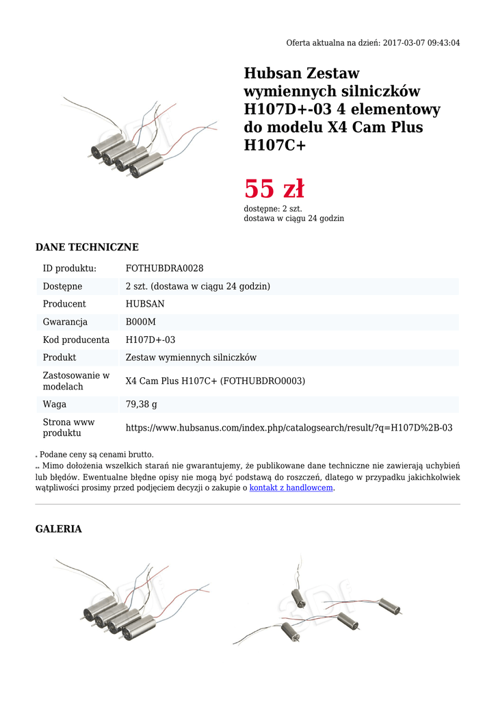 Oferta aktualna na dzień: 2017-03-07 09:43:04 Hubsan Zestaw wymiennych silniczków H107D+-03 4 elementowy do modelu X4 Cam Plus H107C+ 55 zł dostępne: 2 szt. dostawa w ciągu 24 godzin DANE TECHNICZNE ID produktu: FOTHUBDRA0028 Dostępne 2 szt. (dostawa w ciągu 24 godzin) Producent HUBSAN Gwarancja B000M Kod producenta H107D+-03 Produkt Zestaw wymiennych silniczków Zastosowanie w modelach X4 Cam Plus H107C+ (FOTHUBDRO0003) Waga 79,38 g Strona www produktu https://www.hubsanus.com/index.php/catalogsearch/result/?q=H107D%2B-03 Podane ceny są cenami brutto. ** Mimo dołożenia wszelkich starań nie gwarantujemy, że publikowane dane techniczne nie zawierają uchybień lub błędów. Ewentualne błędne opisy nie mogą być podstawą do roszczeń, dlatego w przypadku jakichkolwiek wątpliwości prosimy przed podjęciem decyzji o zakupie o kontakt z handlowcem. * GALERIA