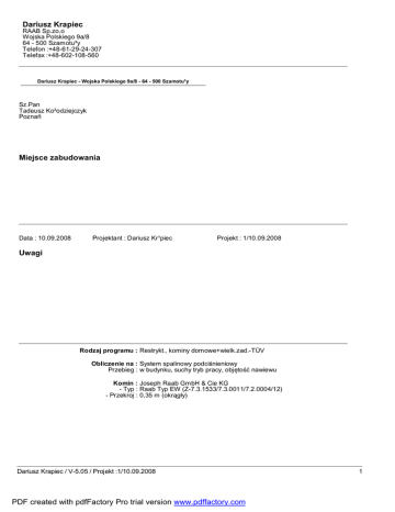 Dariusz Krapiec RAAB Sp.zo.o Wojska Polskiego 9a/8 64 - 500 Szamotu³y Telefon :+48-61-29-24-307 Telefax :+48-602-108-560 Dariusz Krapiec - Wojska Polskiego 9a/8 - 64 - 500 Szamotu³y Sz.Pan Tadeusz Ko³odziejczyk Poznañ Miejsce zabudowania Data : 10.09.2008 Projektant : Dariusz Kr¹piec Projekt : 1/10.09.2008 Uwagi Rodzaj programu : Restrykt., kominy domowe+wielk.zad.-TÜV Obliczenie na : System spalinowy podciśnieniowy Przebieg : w budynku, suchy tryb pracy, objętość nawiewu Komin : Joseph Raab GmbH & Cie KG - Typ : Raab Typ EW (Z-7.3.1533/7.3.0011/7.2.0004/12) - Przekroj : 0,35 m (okrągły) Dariusz Krapiec / V-5.05 / Projekt :1/10.09.2008 PDF created with pdfFactory Pro trial version www.pdffactory.com 1 Szkic podłączeń System spalinowy podciśnieniowy , w budynku, suchy tryb pracy, objętość nawiewu Szacht -Rodzaj budowy : Mur d=24cm -Przekrój : kwadratowy: 0,45 m wkład -rodz.konstr. : Raab Typ EW (Z-7.3.1533/7.3.0011/7.2.0004/12) -przekrój : okrągły: 0,35 m wys. całk. : dług. całk. : 12 m 12 m L=1,5m H=0m Dh=0,35m 1.2 L=1m H=0m Dh=0,35m 1.4 1.1 1.3 L=12m H=12*m Dh=0,35m 1 L=1m H=1m L=1m H=1m Dh=0,25m Dh=0,25m 1.1 1.2 Viessmann Viessmann Vitogas 100-132 Vitogas 100-132 Grzejnik pomieszczeniowy Grzejnik pomieszczeniowy Gaz Gaz Qn=132.0 kW Qn=132.0 kW Dhw=0.250 m Dhw=0.250 m techniczno-funkcjonalna ocena War. ciśnienia : warunek temp. : min. prędk. spalin : max. Schlankheit : spełnia spełnia spełnia spełnia Warunki według DIN V 4505 część 3 są wszystkie spełnione! Dariusz Krapiec / V-5.05 / Projekt :1/10.09.2008 PDF created with pdfFactory Pro trial version www.pdffactory.com 2 Dowód sprawności Warunek ciśnienia Źródło ciepła 1.1 Źródło ciepła 1.2 g/s g/s Źródło ciepła 1.1 Źródło ciepła 1.2 g/s g/s Źródło ciepła 1.1 Źródło ciepła 1.2 g/s g/s Źródło ciepła 1.1 g/s Źródło ciepła 1.2 g/s Podciśninie w relacji do rozmieszczenia Źródło ciepła 1.1 Źródło ciepła 1.2 Pa Pa Źródło ciepła 1.1 Źródło ciepła 1.2 Pa Pa Źródło ciepła 1.1 Źródło ciepła 1.2 Pa Pa Źródło ciepła 1.1 Źródło ciepła 1.2 Warunek temperatury Odcinek 1 minimalna prędkość spalin Odcinek 1 wystarcz. niska Pa Pa Warunek ciśnienia Warunek temperatury min. prędkość spalin maks. °C m/s spełnia spełnia spełnia spełnia mtat m mtat-m Wszystkie źródła ciepła z maks. mocą 93,0593 85 8,0593 104,2324 85 19,2324 Wszystkie źródła ciepła z min. mocą 79,388 74,44 4,948 87,331 74,44 12,891 Praca pojed. z maks. mocą 116,8429 85 31,8429 120,2451 85 35,2451 Praca pojed. z min. mocą 96,7702 74,44 22,3302 99,6713 74,44 25,2313 Pz PB Pz - PB Wszystkie źródła ciepła z maks. mocą 11,3098 5,001 6,3088 17,5969 5,001 12,596 Wszystkie źródła ciepła z min. mocą 8,9453 3,8848 5,0606 13,1377 3,8848 9,2529 Praca pojed. z maks. mocą 14,2221 2,5461 11,676 17,2684 2,6083 14,6601 Praca pojed. z min. mocą 10,6165 1,9265 8,69 12,7222 1,9769 10,7454 Tiob Tg Tiob-Tg 39,9669 38,7019 1,265 Wm Wmin Wmin-Wm 2,2615 0,8806 1,3809 (Dh/H) (Dh/H)m 34,2858 200 165,7143 spełnia tak tak tak tak tak tak tak tak tak tak tak tak tak tak tak tak tak tak tak techniczno-funkcjonalna ocena tak tak tak tak Warunki według DIN V 4505 część 3 są wszystkie spełnione! Źródło ciepła (podłaczenie 1, pozycja 1) Produc. Typ Rok prod. Paliwo Rodzaj Moc cie. nominalna Sprawność Moc cieplna paleniska zawartość CO2 Przepł.mas. spalin Temp. spalin kW % kW % kg/s °C Viessmann Vitogas 100-132 2002 Gaz ziemny L-bez nadmuchu Grzejnik pomieszczeniowy Obc.p. Obc.cz. 132 85,8 92 92 143,48 93,26 6,9 5 0,085 0,0745 105 75 Dariusz Krapiec / V-5.05 / Projekt :1/10.09.2008 PDF created with pdfFactory Pro trial version www.pdffactory.com 3 Zapotrzebowanie ciągu króciec - forma - średnica Krzywa temp. spalin - nie pracuje -pracuje, obc. całkow. -pracuje, obc. częśc. Krzywa ciśnienia podn. - nie pracuje -pracuje, obc. całkow. -pracuje, obc. częśc. Pa m y0/°C 20 20 20 Pa Pa Pa 3 3 okrągły 0,25 Z beswładnością-BEZ bezwładności y1/°C y2 y0/°C 0 0 15 85 -1 15 55 -1 15 b0 b1 b2 0 0 3,6 0 0 3 0 0 3 y1/°C 0 90 60 b3 0 0 0 y2 0 -1 -1 b4 0 0 0 Czopuch (podł. 1, poz. 1) Produc. Typ dług. całkowita m wysokoćć skuteczna m Forma przekroju - średnica m opór cieplny przewodzenia m˛K/W Grub. ścianki m Średnia chropow. m długość całkowita na zewn. m długość całkowita w obsz. zimn. m KONSTRUKCJA Raab Typ EW (Z-7.3.1533/7.3.0011/7.2.0004/12) Klapa spalinowa -wartość Zeta otw., zamkn. suma oporów jednostkowych Joseph Raab GmbH & Cie KG Raab Typ EW (Z-7.3.1533/7.3.0011/7.2.0004/12) 1 1 okrągły 0,25 0 0,0006 0,001 0 0 WPC OCP d [m] 0 0,0006 Przejście, Zeta ręcznie 1,19 600 1,19 Czopuch (podł. 1, poz. 2) Produc. Typ dług. całkowita m wysokoćć skuteczna m Forma przekroju - średnica m opór cieplny przewodzenia m˛K/W Grub. ścianki m Średnia chropow. m długość całkowita na zewn. m długość całkowita w obsz. zimn. m KONSTRUKCJA Raab Typ EW (Z-7.3.1533/7.3.0011/7.2.0004/12) Opory pojedyńczych elementów Odgałęzienia 2-segmentowe kolano (wąskie) Klapa spalinowa -wartość Zeta otw., zamkn. suma oporów jednostkowych Joseph Raab GmbH & Cie KG Raab Typ EW (Z-7.3.1533/7.3.0011/7.2.0004/12) 1,5 0 okrągły 0,35 0 0,0006 0,001 0 0 WPC OCP d [m] 0 0,0006 Ilość Kąt Zeta 1 90 1,2 1 0,4 Przejście, Zeta ręcznie 1,19 600 1,59 Źródło ciepła (podłaczenie 1, pozycja 2) Produc. Typ Rok prod. Viessmann Vitogas 100-132 2002 Dariusz Krapiec / V-5.05 / Projekt :1/10.09.2008 PDF created with pdfFactory Pro trial version www.pdffactory.com 4 Paliwo Rodzaj Moc cie. nominalna Sprawność Moc cieplna paleniska zawartość CO2 Przepł.mas. spalin Temp. spalin Zapotrzebowanie ciągu króciec - forma - średnica Krzywa temp. spalin - nie pracuje -pracuje, obc. całkow. -pracuje, obc. częśc. Krzywa ciśnienia podn. - nie pracuje -pracuje, obc. całkow. -pracuje, obc. częśc. kW % kW % kg/s °C Pa m y0/°C 20 20 20 Pa Pa Pa Gaz ziemny L-bez nad