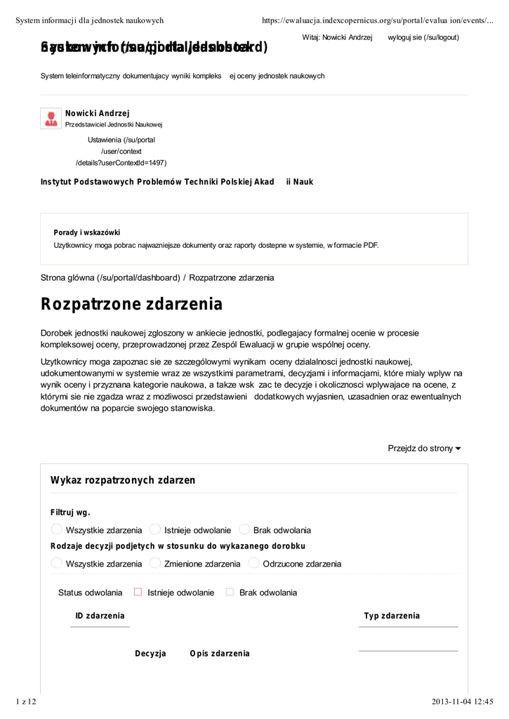 System informacji dla jednostek naukowych https://ewaluacja.indexcopernicus.org/su/portal/evalua ion/events/... Witaj: Nowicki Andrzej System informacji naukowych (/su/portal/dashboard) dla jednostek System teleinformatyczny dokumentujacy wyniki kompleks wyloguj sie (/su/logout) ej oceny jednostek naukowych Nowick i Andrzej Przedstawiciel Jednostki Naukowej Ustawienia (/su/portal /user/context /details?userContextId=1497) Ins ty tut Podstawowych Problemów Tec hniki Polskiej Akad ii Nauk Porady i wskazówki Uzytkownicy moga pobrac najwazniejsze dokumenty oraz raporty dostepne w systemie, w formacie PDF. Strona glówna (/su/portal/dashboard) / Rozpatrzone zdarzenia Rozpatrzone zdarzenia Dorobek jednostki naukowej zgloszony w ankiecie jednostki, podlegajacy formalnej ocenie w procesie kompleksowej oceny, przeprowadzonej przez Zespól Ewaluacji w grupie wspólnej oceny. Uzytkownicy moga zapoznac sie ze szczególowymi wynikam oceny dzialalnosci jednostki naukowej, udokumentowanymi w systemie wraz ze wszystkimi parametrami, decyzjami i informacjami, które mialy wplyw na wynik oceny i przyznana kategorie naukowa, a takze wsk zac te decyzje i okolicznosci wplywajace na ocene, z którymi sie nie zgadza wraz z mozliwosci przedstawieni dodatkowych wyjasnien, uzasadnien oraz ewentualnych dokumentów na poparcie swojego stanowiska. Przejdz do strony Wykaz rozpatrzonych zdarzen Filtr uj wg. Wszystkie zdarzenia Istnieje odwolanie Brak odwolania Rodzaje decy zji podjety ch w stosunku do wy kazanego dorobk u Wszystkie zdarzenia Status odwolania Zmienione zdarzenia Istnieje odwolanie Brak odwolania ID zdarzenia Typ zdarzenia Decyzja 1 z 12 Odrzucone zdarzenia Opis zdarzenia 2013-11-04 12:45 System informacji dla jednostek naukowych https://ewaluacja.indexcopernicus.org/su/portal/evalua ion/events/... ID zdarzenia 490423 490545 490954 Typ zdarzenia Decyzja Opis zdarzenia ODRZUCENIE Publikacja:Preface to Probabilistic Engineering Mechanics Czasopismo:PROBABILISTIC ENGINEERING MECHANICS [ISSN:0266-8920] PUBLIKACJE NA LISCIE A Publikacja:Symmetry-based approach to parametrization of embedded-atom-method interatomic potentials Czasopismo:COMPUTATIONAL MATERIALS SCIENCE [ISSN:0927-0256] PUBLIKACJE NA LISCIE A Monografia:Electrostatic methods in analysis of acoustic beam-forming structures Wydawca:IPPT reports on Fundamental Technological Research MONOGRAFIE W ODRZUCENIE ODRZUCENIE WYKAZU MNISW SZCZEGÓLY WYKAZU MNISW SZCZEGÓLY JEZYKACH KONGRESOWYCH SZCZEGÓLY 490655 ODRZUCENIE Publikacja:Efficient approach to metal/metal oxide interfaces within variable charge model Czasopismo:EUROPEAN PHYSICAL JOURNAL B [ISSN:1434-6028] PUBLIKACJE NA LISCIE A WYKAZU MNISW SZCZEGÓLY 490558 490966 ODRZUCENIE ODRZUCENIE Publikacja:Prediction of functionally important residues in globular proteins from unusual central distances of amino acids Czasopismo:BMC STRUCTURAL BIOLOGY [ISSN:1471-2237] PUBLIKACJE NA LISCIE A Monografia:Analiza niezawodnosci i optymalizacja odpornosciowa zlozonych konstrukcji i procesów technologicznych Wydawca:Prace IPPT – IFTR Reports MONOGRAFIE W JEZYKU WYKAZU MNISW SZCZEGÓLY POLSKIM SZCZEGÓLY 490964 ODRZUCENIE Monografia:Podstawy Wytrzymalosci Materialów Wydawca:Oficyna Wydawnicza Politechniki Warszawskiej MONOGRAFIE W JEZYKU POLSKIM SZCZEGÓLY 2 z 12 2013-11-04 12:45 System informacji dla jednostek naukowych https://ewaluacja.indexcopernicus.org/su/portal/evalua ion/events/... ID zdarzenia 490959 Typ zdarzenia Decyzja Opis zdarzenia ODRZUCENIE Monografia:Wprowadzenie do nieliniowej termomechaniki cial odksztalcalnych Wydawca:Instytut Podstawowych Problemów Techniki PAN MONOGRAFIE W JEZYKU POLSKIM SZCZEGÓLY 490353 490569 490432 ODRZUCENIE ODRZUCENIE ODRZUCENIE Publikacja:A mixture model with evolving mass densities for describing synthesis and resorption phenomena in bones reconstructed with bio-resorbable materials Czasopismo:ZAMM-Zeitschrift fur Angewandte Mathematik und Mechanik [ISSN:0044-2267] PUBLIKACJE NA LISCIE A Publikacja:Analysis of Plastic Strain Localization on The Basis of Strain and Temperature Fields Czasopismo:ARCHIVES OF METALLURGY AND MATERIALS [ISSN:1733-3490] PUBLIKACJE NA LISCIE A Publikacja:Nonlinear regimes of Farley– Buneman instability Czasopismo:PLASMA PHYSICS REPORTS PUBLIKACJE NA LISCIE A WYKAZU MNISW SZCZEGÓLY WYKAZU MNISW SZCZEGÓLY WYKAZU MNISW SZCZEGÓLY 490536 ODRZUCENIE Publikacja:Smart suspension system for linear guideways Czasopismo:JOURNAL OF INTELLIGENT & ROBOTIC SYSTEMS [ISSN:0921-0296] PUBLIKACJE NA LISCIE A WYKAZU MNISW SZCZEGÓLY 491066 ODRZUCENIE Patent:Silnik plazmowy typu Hall’a PATENTY NA WYNALAZEK UDZIELONE ZA GRANICA LUB PRZEZ UPRP NA RZECZ PODMIOTU INNEGO NIZ OCENIANA JEDNOSTKA SZCZEGÓLY 3 z 12 2013-11-04 12:45 System informacji dla jednostek naukowych https://ewaluacja.indexcopernicus.org/su/portal/evalua ion/events/... ID zdarzenia 490924 Typ zdarzenia Decyzja Opis zdarzenia ODRZUCENIE Publikacja:Analysis of wall effect on the process of diffusion of nanoparticles in a microchannel Czasopismo:JOURNAL OF PHYSICS: CONFERENCE SERIES PUBLIKACJE W RECENZOWANYCH MATERIALACH KONFERENCYJNYCH (WEB OF SCIENCE) SZCZEGÓLY 490917 ODRZUCENIE Publikacja:Basal Cell Carcinoma Lesions Characterization With Ultrasound Czasopismo:IEEE INTERNATIONAL ULTRASONICS SYMPOSIUM PUBLIKACJE W RECENZOWANYCH MATERIALACH KONFERENCYJNYCH (WEB OF SCIENCE) SZCZEGÓLY 490946 ODRZUCENIE Publikacja:Compressive behavior of 6082-T6 and 7075-T6 aluminium alloys at very high strain rates Czasopismo:Workshop on Dynamic Behavior of Materials and Stafety Structures, 2-4.05.2012, Poznan PUBLIKACJE W RECENZOWANYCH MATERIALACH KONFERENCYJNYCH (WEB OF SCIENCE) SZCZEGÓLY 490918 ODRZUCENIE Publikacja:Contribution of multiple scattering to the trabecular bone backscatter - dependence on porosity and frequency Czasopismo:IEEE INTERNATIONAL ULTRASONICS SYMPOSIUM PUBLIKACJE W RECENZOWANYCH MATERIALACH KONFERENCYJNYCH (WEB OF SCIENCE) SZCZEGÓLY 490919 ODRZUCENIE Publikacja:Correcting for