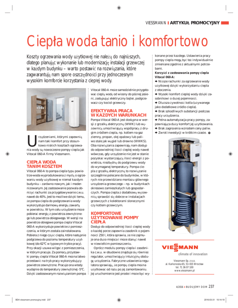 VIESSMANN ARTYKU PROMOCYJNY Ciepïa woda tanio ibkomfortowo Koszty ogrzewania wody uĝytkowej nie naleĝÈ do najniĝszych, dlatego planujÈc wykonanie lub modernizacjÚ instalacji grzewczej wbkaĝdym budynku – warto postawiÊ na rozwiÈzania, które zagwarantujÈ nam spore oszczÚdnoĂci przy jednoczesnym wysokim komforcie korzystania zbciepïej wody. Vitocal 060-Abmoĝe samodzielnie przygotowaÊ ciepïÈ wodÚ od wiosny do póěnej jesieni, zastÚpujÈc elektryczny bojler, podgrzewacz czy kocioï grzewczy. EFEKTYWNA PRACA WbKA¿DYCH WARUNKACH U rzÈdzeniami, którymi zapewniÈ nam taki komfort przy stosunkowo niskich kosztach ogrzewania wody sÈ nowoczesne pompy ciepïa jak Vitocal 060-Abfirmy Viessmann. CIEPA WODA TANIM KOSZTEM Vitocal 060-Abto pompa ciepïa typu powietrze-woda wyprodukowana zbmyĂlÈ obogrzewaniu wody uĝytkowej wbniemal kaĝdym budynku – zarówno nowym, jak ibmodernizowanym. Jej zastosowanie pozwala obniĝyÊ rachunki za przygotowywanie c.w.u. nawet do 40%. Jest to moĝliwe dziÚki temu, ĝe pompa ciepïa do podgrzewania wody wykorzystuje darmowÈ energiÚ zawartÈ wbpowietrzu. Wbtym celu urzÈdzenie moĝe pobieraÊ energiÚ zbpowietrza zewnÚtrznego lub powietrza obiegowego. Wbwersji na powietrze obiegowe pompa ciepïa Vitocal 060-Abwykorzystuje powietrze zbpomieszczenia, wbktórym zostaïa zainstalowana. Pobiera zbniego czÚĂÊ ciepïa, które nastÚpnie podgrzewa do poziomu temperatury uĝytkowej (do 62°C wbtypowym trybie pracy). Przy okazji usuwa wilgoÊ zbpomieszczenia, wbktórym pracuje. Za pomocÈ przystawki pompÚ ciepïa Vitocal 060-Abmoĝna ïatwo przestawiÊ na tryb pracy wykorzystujÈcy powietrze zewnÚtrzne. Pracuje ona wtedy wydajnie do temperatury zewnÚtrznej -5°C. DziÚki zastosowanym rozwiÈzaniom pompa Pompa Vitocal 060-Abjest dostÚpna wbwersji zbgrzaïkÈ elektrycznÈ (WWK) lub wÚĝownicÈ umoĝliwiajÈcÈ wspóïpracÚ zbdrugim ěródïem ciepïa, np. kotïem na gaz ziemny, propan, olej opaïowy lub paliwo staïe jak wÚgiel lub drewno (WWKS). Oba rozwiÈzania zapewniajÈ nam dostÚp do odpowiedniej iloĂci ciepïej wody nawet wówczas, gdy urzÈdzenie nie jest wbstanie pozyskaÊ wystarczajÈcÈ iloĂci energii zbpowietrza, niezbÚdnÈ do podgrzewu wody do wymaganej temperatury. Pompa ciepïa zbgrzaïkÈ elektrycznÈ to rozwiÈzanie szczególnie polecane do budynków, wbktórych nie przewidziano montaĝu gïównego urzÈdzenia grzewczego – np. wbbudynkach okresowo zamieszkaïych lub gospodarczych. Pompa ciepïa zbdodatkowÈ wÚĝownicÈ sprawdzi siÚ dobrze wbinstalacjach grzewczych zbkolektorami sïonecznymi czy kotïem grzewczym. konane przez kaĝdego. Ustawienia pracy pompy ciepïa mogÈ byÊ teĝ indywidualnie zmieniane zgodnie zbaktualnymi potrzebami. KorzyĂci zbzastosowania pompy ciepïa Vitocal 060-A: ¨ Niĝsze rachunki za ogrzewanie wody uĝytkowej dziÚki wykorzystaniu ciepïa zbotoczenia. ¨ Wysoki komfort ciepïej wody dziÚki zasobnikowi obduĝej pojemnoĂci. ¨ Dïuĝsza ĝywotnoĂÊ kotïa (uĝywanego jako dodatkowe ěródïo ciepïa). ¨ Brak szkodliwych substancji podczas pracy urzÈdzenia. ¨ Peïna automatyzacja pracy pompy, zapewniajÈca duĝy komfort jej uĝytkowania. ¨ Brak zagroĝenia wzrostem ceny paliw. ¨ Zwrot inwestycji wbkrótkim czasie. } KOMFORTOWE U¿YTKOWANIE POMPY CIEPA DostÚp do odpowiedniej iloĂci ciepïej wody obkaĝdej porze zapewnia zasobnik obpojemnoĂci 250 l, którabsprawia, ĝe nie zajmuje ona duĝo miejsca ibmoĝe stanÈÊ nawet wbniewielkim pomieszczeniu. Oprócz moduïu pompy ciepïa ibzasobnika c.w.u. wbobudowie znajduje siÚ równieĝ regulator, umoĝliwiajÈcy intuicyjnÈ obsïugÚ urzÈdzenia. Fabryczne ustawienia regulatora sprawiajÈ, ĝe pompÚ ciepïa moĝna uĝytkowaÊ od razu po jej zamontowaniu. Jej uruchomienie jest proste ibmoĝe byÊ wy- Viessmann Sp. zbo.o. al. Karkonoska 65, 53-015 Wrocïaw tel. 71 36 07 100 www.viessmann.pl 4/2016 BD4 viessmann promocyjny.indd 237 BUDUJEMY DOM 237 2016-03-31 10:14:19
