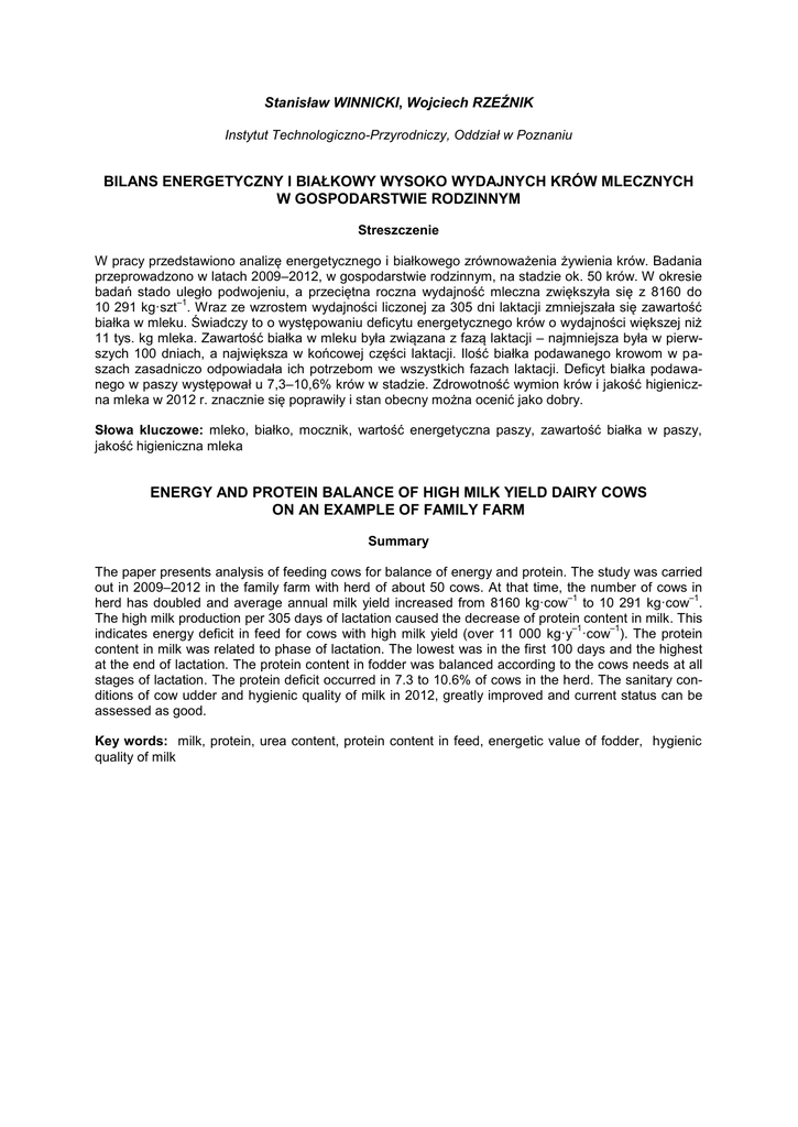Stanisław WINNICKI, Wojciech RZEŹNIK Instytut Technologiczno-Przyrodniczy, Oddział w Poznaniu BILANS ENERGETYCZNY I BIAŁKOWY WYSOKO WYDAJNYCH KRÓW MLECZNYCH W GOSPODARSTWIE RODZINNYM Streszczenie W pracy przedstawiono analizę energetycznego i białkowego zrównoważenia żywienia krów. Badania przeprowadzono w latach 2009–2012, w gospodarstwie rodzinnym, na stadzie ok. 50 krów. W okresie badań stado uległo podwojeniu, a przeciętna roczna wydajność mleczna zwiększyła się z 8160 do –1 10 291 kg·szt . Wraz ze wzrostem wydajności liczonej za 305 dni laktacji zmniejszała się zawartość białka w mleku. Świadczy to o występowaniu deficytu energetycznego krów o wydajności większej niż 11 tys. kg mleka. Zawartość białka w mleku była związana z fazą laktacji – najmniejsza była w pierwszych 100 dniach, a największa w końcowej części laktacji. Ilość białka podawanego krowom w paszach zasadniczo odpowiadała ich potrzebom we wszystkich fazach laktacji. Deficyt białka podawanego w paszy występował u 7,3–10,6% krów w stadzie. Zdrowotność wymion krów i jakość higieniczna mleka w 2012 r. znacznie się poprawiły i stan obecny można ocenić jako dobry. Słowa kluczowe: mleko, białko, mocznik, wartość energetyczna paszy, zawartość białka w paszy, jakość higieniczna mleka ENERGY AND PROTEIN BALANCE OF HIGH MILK YIELD DAIRY COWS ON AN EXAMPLE OF FAMILY FARM Summary The paper presents analysis of feeding cows for balance of energy and protein. The study was carried out in 2009–2012 in the family farm with herd of about 50 cows. At that time, the number of cows in –1 –1 herd has doubled and average annual milk yield increased from 8160 kg·cow to 10 291 kg·cow . The high milk production per 305 days of lactation caused the decrease of protein content in milk. This –1 –1 indicates energy deficit in feed for cows with high milk yield (over 11 000 kg·y ·cow ). The protein content in milk was related to phase of lactation. The lowest was in the first 100 days and the highest at the end of lactation. The protein content in fodder was balanced according to the cows needs at all stages of lactation. The protein deficit occurred in 7.3 to 10.6% of cows in the herd. The sanitary conditions of cow udder and hygienic quality of milk in 2012, greatly improved and current status can be assessed as good. Key words: milk, protein, urea content, protein content in feed, energetic value of fodder, hygienic quality of milk