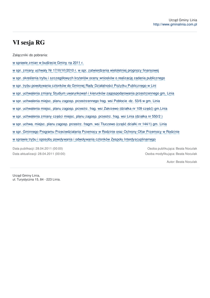 Urząd Gminy Linia http://www.gminalinia.com.pl VI sesja RG Załączniki do pobrania: w sprawie zmian w budżecie Gminy na 2011 r. w spr. zmiany uchwały Nr 17/III/VI/2010 r. w spr. zatwierdzenia wieloletniej prognozy finansowej w spr. określenia trybu i szczegółowych kryteriów oceny wniosków o realizację zadania publicznego w spr. trybu powoływania członków do Gminnej Rady Działalności Pożytku Publicznego w Lini w spr. uchwalenia zmiany Studium uwarunkowań i kierunków zagospodarowania przestrzennego gm. Linia w spr. uchwalenia miejsc. planu zagosp. przestrzennego frag. wsi Pobłocie -dz. 53/6 w gm. Linia w spr. uchwalenia miejsc. planu zagosp. przestrz. frag. wsi Zakrzewo (działka nr 109 część) gm.Linia w spr. uchwalenia zmiany części miejsc. planu zagosp. przestrz. frag. wsi Linia (działka nr 550/2 ) w spr. uchwa. miejsc. planu zagosp. przestrz. fragm. wsi Tłuczewo (część działki nr 144/1) gm. Linia w spr. Gminnego Programu Przeciwdziałania Przemocy w Rodzinie oraz Ochrony Ofiar Przemocy w Rodzinie w sprawie trybu i sposobu powoływania i odwoływania członków Zespołu Interdyscyplinarnego Data publikacji: 28.04.2011 (00:00) Data aktualizacji: 28.04.2011 (00:00) Osoba publikująca: Beata Noculak Osoba modyfikująca: Beata Noculak Autor: Beata Noculak Urząd Gminy Linia, ul. Turystyczna 15, 84 - 223 Linia.