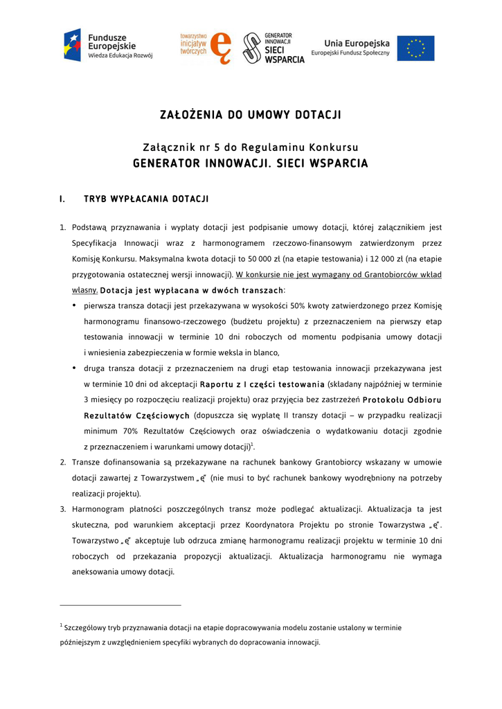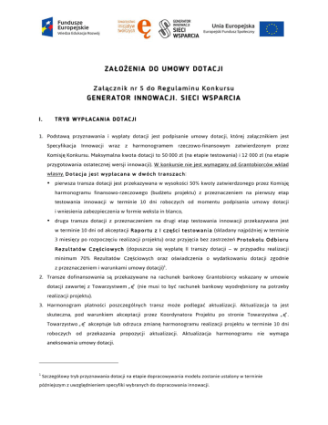 ZAŁOŻENIA DO UMOWY DOTACJI Załącznik nr 5 do Regulaminu Konkursu GENERATOR INNOWACJI. SIECI WSPARCIA I. TRYB WYPŁACANIA DOTACJI 1. Podstawą przyznawania i wypłaty dotacji jest podpisanie umowy dotacji, której załącznikiem jest Specyfikacja Innowacji wraz z harmonogramem rzeczowo-finansowym zatwierdzonym przez Komisję Konkursu. Maksymalna kwota dotacji to 50 000 zł (na etapie testowania) i 12 000 zł (na etapie przygotowania ostatecznej wersji innowacji). W konkursie nie jest wymagany od Grantobiorców wkład własny. Dotacja jest wypłacana w dwóch transzach: • pierwsza transza dotacji jest przekazywana w wysokości 50% kwoty zatwierdzonego przez Komisję harmonogramu finansowo-rzeczowego (budżetu projektu) z przeznaczeniem na pierwszy etap testowania innowacji w terminie 10 dni roboczych od momentu podpisania umowy dotacji i wniesienia zabezpieczenia w formie weksla in blanco, • druga transza dotacji z przeznaczeniem na drugi etap testowania innowacji przekazywana jest w terminie 10 dni od akceptacji Raportu z I części testowania (składany najpóźniej w terminie 3 miesięcy po rozpoczęciu realizacji projektu) oraz przyjęcia bez zastrzeżeń Protokołu Odbioru Rezultatów Częściowych (dopuszcza się wypłatę II transzy dotacji – w przypadku realizacji minimum 70% Rezultatów Częściowych oraz oświadczenia o wydatkowaniu dotacji zgodnie z przeznaczeniem i warunkami umowy dotacji)1. 2. Transze dofinansowania są przekazywane na rachunek bankowy Grantobiorcy wskazany w umowie dotacji zawartej z Towarzystwem „ę” (nie musi to być rachunek bankowy wyodrębniony na potrzeby realizacji projektu). 3. Harmonogram płatności poszczególnych transz może podlegać aktualizacji. Aktualizacja ta jest skuteczna, pod warunkiem akceptacji przez Koordynatora Projektu po stronie Towarzystwa „ę”. Towarzystwo „ę” akceptuje lub odrzuca zmianę harmonogramu realizacji projektu w terminie 10 dni roboczych od przekazania propozycji aktualizacji. Aktualizacja harmonogramu nie wymaga aneksowania umowy dotacji. 1 Szczegółowy tryb przyznawania dotacji na etapie dopracowywania modelu zostanie ustalony w terminie późniejszym z uwzględnieniem specyfiki wybranych do dopracowania innowacji. 4. Stopień realizacji Rezultatów Częściowych/Końcowych będzie określany w odniesieniu do rezultatów przedstawionych w Specyfikacji Innowacji. Jeśli nie zostanie dostarczony rezultat bądź nie spełni on określonych w umowie dotacji standardów minimalnych – wówczas ryczałt przypisany do tego rezultatu nie będzie traktowany jako rozliczony. 5. Towarzystwo może zawiesić wypłatę środków dotacji w ramach projektu dotacyjnego, w przypadku gdy: • Grantobiorca nie złożył Raportu z cz. I testowania Innowacji oraz Rezultatów Częściowych (co najmniej 70%) lub Rezultaty Częściowe nie zostały przez Towarzystwo „ę” zatwierdzone (protokół stwierdzający brak odbioru Rezultatów Częściowych); • prowadzony przez Towarzystwo „ę” monitoring, analiza Rezultatów Częściowych lub kontrola wskazują na nieprawidłowości w realizacji projektu; • Towarzystwo „ę” otrzymało informacje o nieprawidłowościach lub oszustwach przy realizacji projektu; • w sytuacji okresowego braku środków po stronie Towarzystwa „ę” spowodowanego brakiem wypłaty środków przez Instytucję Zarządzającą. Grantobiorca ma wówczas prawo renegocjować harmonogram realizacji projektu. II. WYMOGI W ZAKRESIE ZABEZPIECZENIA DOTACJI 1. Zabezpieczeniem prawidłowej realizacji umowy dotacji jest weksel in blanco wraz z wypełnioną deklaracją składany przez Grantobiorcę nie później niż 5 dni roboczych od daty podpisania umowy dotacji. 2. Zwrot weksla stanowiącego zabezpieczenie umowy następuje po ostatecznym rozliczeniu umowy dotacji, tj. po zatwierdzeniu przez kierownika projektu raportu końcowego z realizacji testowania oraz po przekazaniu Towarzystwu „ę” wymaganych danych uczestników testowanych rozwiązań oraz – jeśli dotyczy – zwrocie środków dotacji nierozliczonych przez Towarzystwo „ę” w sytuacji niepełnego osiągnięcia rezultatów. 3. Istotnym zabezpieczeniem dotacji jest wypłata środków w dwóch transzach: 50% i 50%. Taki mechanizm umożliwia zawieszenie wypłacania kolejnej transzy dotacji w sytuacji stwierdzenia nieprawidłowości w realizacji projektu. III. ZMIANA PRZEZNACZENIA DOTACJI ORAZ UMOWY O POWIERZENIE DOTACJI 1. Wszelkie zmiany Specyfikacji Innowacji związane ze zmianą określonych celów testowania, osiągniętych rezultatów (bądź ich wskaźników), wysokości kwot przypisanych do rezultatów oraz inne zmiany wpływające zasadniczo na opis innowacji zawarty w Specyfikacji wraz z uzasadnieniem i propozycją oczekiwanych aktualizacji – muszą być zgłaszane nie później niż na 3 tygodnie przed planowanym zakończeniem projektu dotacyjnego. Do ich wdrożenia konieczne jest uzyskanie akceptacji Kierownika Projektu po stronie Towarzystwa „ę”. Jeśli odstępstwa będą miały istotny wpływ na kształt Specyfikacji i spodziewanych Rezultatów, decyzja będzie podejmowana w porozumieniu i po akceptacji Komisji Konkursu. 2. Grantobiorca może w czasie realizacji projektu na bieżąco dokonywać zmian w wydatkowaniu środków dotacji (bez konieczności uzyskania zgody i powiadamiania Towarzystwa „ę”) – jeśli są to koszty kwalifikowalne i nie przekraczają kwot przypisanych do poszczególnych rezultatów określonych w harmonogramie rzeczowo-finansowym (z zachowaniem określonego poziomu wskaźników oraz z zachowaniem stawek określonych w opracowanym przez Towarzystwo „ę” Katalogu Kosztów). Grantobiorca może także samodzielnie dokonywać przesunięć pomiędzy kwotami przypisanymi do poszczególnych rezultatów testowania do wysokości 15% ich wartości. 3. Po ostatecznym zatwierdzeniu Specyfikacji Innowacji wraz harmonogramem rzeczowo-finansowym Grantobiorca nie ma możliwości wnioskowan