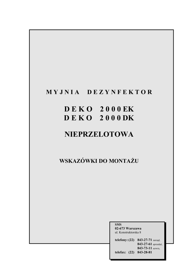 MYJNIA DEZYNFEKTOR D E K O 2 0 0 0 EK D E K O 2 0 0 0 DK NIEPRZELOTOWA WSKAZÓWKI DO MONTAŻU SMS 02-673 Warszawa ul. Konstruktorska 8 telefony: (22) 843-27-71 zarząd, 843-27-61 sprzedaż, 843-73-11 serwis, telefax: (22) 843-28-81 Myjnia DEKO-2000 S P I S T R E Ś C I 1. Przeznaczenie myjni ____________________________________________________ 3 2. Dane techniczne ________________________________________________________ 3 3. Wskazówki projektowo – instalacyjne. ______________________________________ 4 3. Instalacja _____________________________________________________________ 6 str. 2 Dostawca myjni: S M S Myjnia DEKO-2000 1. PRZEZNACZENIE MYJNI MYJNIA DEZYNFEKTOR DEKO-2000...K przeznaczona jest do mycia, dezynfekcji termicznej lub chemicznej i suszenia szerokiej gamy sprzętu medycznego oraz innych przedmiotów wielokrotnego użytku. Znajduje zastosowanie w szpitalach, domach dla przewlekle chorych, ośrodkach zdrowia, przychodniach. Istnieje model laboratoryjny różniący się od modelu standardowego wyposażeniem i usytuowaniem półek w komorze myjącej. Proces mycia i dezynfekcji parą wodną w DEKO-2000...K usuwa i hamuje rozwój bakterii. Zarówno ″ wsad ″jak i komora oraz kanały spustowe myjni są myte i poddawane dezynfekcji w każdym cyklu. Deko-2000...K wytrzymuje warunki pracy ciągłej, spełniając żądane wymagania procesu mycia i dezynfekcji. Uniwersalność urządzenia czyni jego zastosowanie ekonomicznym i efektywnym. 2. DANE TECHNICZNE • Wymiary zewnętrzne (szer. x głęb. x wys.) : 800 x 710 x 2000mm, • Zasilanie elektryczne: 220V / 380V , 3 fazy, 50Hz, • Moc zainstalowana: model z wytwornicą elektryczną 12,8 kW, model zasilany parą z instalacji 2,8 kW, • Zasilanie wodą: woda zimna R 1/2 ″, 0.1 ÷ 0.8 MPa, 47 l/cykl, woda ciepła R 1/2 ″, 0.1 ÷ 0.8 MPa, 37 l/cykl, • Para wodna (tylko w modelu DK) R 1/2 ″, 0.1 ÷ 0.3 MPa, 0,5kg/cykl, • Kondensat (tylko w modelu DK) R 1/2 ″ • Spust: φ 50 mm • Masa netto: 170 kg. str. 3 Dostawca myjni: S M S Myjnia DEKO-2000 3. WSKAZÓWKI PROJEKTOWO – INSTALACYJNE. POMIESZCZENIE Myjnia dezynfektor Deko-2000...K jest urządzeniem wolnostojącym nie wymagającym zabudowy w ścianę. Konserwacja może być dokonywana bez przesuwania urządzenia, ponieważ podzespoły elektryczne są umieszczone pod górną płytą. Z uwagi na ilości ciepła wydzielającego się w procesie mycia, zaleca się aby w pomieszczeniu była zainstalowana mechaniczna instalacja nawiewno – wywiewna. Wielkość pomieszczenia powinna zapewnić łatwy załadunek i rozładunek komory myjni. FUNDAMENTY Myjnia montowana jest na płaszczyźnie podłogi. Podłoga w pomieszczeniu powinna być wodoszczelna, a przepusty instalacyjne powinny gwarantować szczelność. Strop powinien wytrzymać ciężar myjni około 170 kg. INSTALACJA WODNA Do zasilania myjni należy stosowaćciepłą i zimną wodę o maks. twardości 5 ° niemieckich i o ciśnieniu 0,1do 0,6MPa. Zużycie wody około 47 dm3/cykl. Doprowadzenie wody należy wykonać w ścianie nad lub z boku myjni, rurami o średnicy 1/2”, zakończonymi zaworami odcinającymi z odpływem gwintowanym 1/2” (gwint zewnętrzny). Urządzenie zostało przystosowane do zasilania z ciśnieniowej sieci wody demineralizowanej, bądź za pomocą dodatkowej pompy może pobierać wodę demineralizowaną ze zbiornika lub z instalacji bezciśnieniowej.Zasilanie takie zostało zrealizowane dzięki zaworowi elektromagnetycznemu. Myjnie standardowo wyposażone są w elastyczne przyłącza dostosowane do wyżej opisanej instalacji. INSTALACJA ELEKTRYCZNA Każda myjnia powinna mieć oddzielny wyłącznik główny w kroploszczelnej obudowie wbudowany w ścianę w łatwo dostępnym miejscu. Myjnię ogrzewaną parowo (Deko 2000 DK, rys nr 1) należy zasilać z instalacji trójfazowej 220/380V, 50 Hz, 2.8 kW z zabezpieczeniem 3 x 10 A, przewodem miedzianym 5x1,5mm2, a dla myjni z elektryczną wytwornicą pary (Deko 2000EK, rys nr 2) - 220/380V; 50Hz; 12,8 kW;z zabezpieczeniem 3 x 25 A. INSTALACJA PAROWA (tylko w modelu 2000 DK) Para wodna, zasilająca myjnię powinna mieć ciśnienie 0,1-0,3 MPa, być nasycona, sucha, bez gazów, oleju i zanieczyszczeń takich jak: kamień kotłowy, rdza, piasek itp.. Przy użytkowaniu pary z instalacji wysokoprężnej należy stosować kilka stopni regulacji np. 1MPa >0,45MPa>0,25MPa. Na każdym stopniu winien być umieszczony zawór bezpieczeństwa. Doprowadzenie pary należy wykonać na ścianie z prawego boku myjni około 200 mm nad podłogą, rurą o średnicy ½”, zakończoną zaworem odcinającym wyposażonym w przyłącze gwintowane wewnętrzne ½”. Rurociągi poziome powinny mieć spadek 1:50 w kierunku myjni. INSTALACJA ODPŁYWU KONDENSATU (tylko w modelu 2000DK) str. 4 Dostawca myjni: S M S Myjnia DEKO-2000 Odprowadzenie kondensatu należy wykonać podobnie jak dla pary, na ścianie z prawego boku myjni około 120 mm nad podłogą, rurą o średnicy 1/2”, wyposażoną w przyłącze gwintowane wewnętrzne ½”. Rurociągi poziome powinny mieć spadek 1:50 w kierunku kolektora. W przypadku braku instalacji centralnej kondensat można skierować do kanalizacji. Przed instalacją należy: 1. Wyjąć urządzenie z opakowania i sprawdzić czy nie zostało uszkodzone w czasie transportu. 2. Zabezpieczyć dokumentację techniczną dołączoną do urządzenia i opróżnić komorę myjni ze znajdujących się tam przedmiotów. 3. Sprawdzić rozmieszczenie podłączenia elektrycznego, króćców ciepłej i zimnej wody oraz odpływu do kanalizacji. Porównać je z rys.nr 1,2. Jeżeli to będzie konieczne dokonać odpowiednich zmian. 4. Oczyścić instalację ciepłej i zimnej wody z pozostałych w niej zanieczyszczeń wypuszczając wodę silnym strumieniem do ścieku przez około 2 minuty. 5. Sprawdzić czy odłączono zasilanie od instalacji elektrycznej. 6. Dla ułatwienia instalacji zdjąć blachy osłonowe urządzenia poza osłoną pokrywy komory. 7. W modelu pr