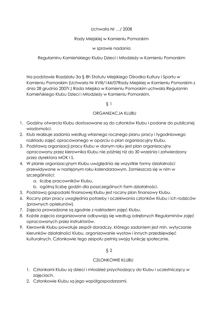 Uchwała Nr …/ 2008 Rady Miejskiej w Kamieniu Pomorskim w sprawie nadania Regulaminu Kamieńskiego Klubu Dzieci i MłodzieŜy w Kamieniu Pomorskim Na podstawie Rozdziału 3a § 8h Statutu Miejskiego Ośrodka Kultury i Sportu w Kamieniu Pomorskim (Uchwała Nr XVIII/144/07Rady Miejskiej w Kamieniu Pomorskim z dnia 28 grudnia 2007r.) Rada Miejska w Kamieniu Pomorskim uchwala Regulamin Kamieńskiego Klubu Dzieci i MłodzieŜy w Kamieniu Pomorskim. §1 ORGANIZACJA KLUBU 1. Godziny otwarcia Klubu dostosowane są do członków Klubu i podane do publicznej wiadomości. 2. Klub realizuje zadania według własnego rocznego planu pracy i tygodniowego rozkładu zajęć opracowanego w oparciu o plan organizacyjny Klubu. 3. Podstawą organizacji pracy Klubu w danym roku jest plan organizacyjny opracowany przez kierownika Klubu nie później niŜ do 30 września i zatwierdzony przez dyrektora MOK i S. 4. W planie organizacyjnym Klubu uwzględnia się wszystkie formy działalności przewidywane w następnym roku kalendarzowym. Zamieszcza się w nim w szczególności: a. liczbę pracowników Klubu, b. ogólną liczbę godzin dla poszczególnych form działalności. 5. Podstawą gospodarki finansowej Klubu jest roczny plan finansowy Klubu. 6. Roczny plan pracy uwzględnia potrzeby i oczekiwania członków Klubu i ich rodziców (prawnych opiekunów). 7. Zajęcia prowadzone są zgodnie z rozkładem zajęć Klubu. 8. KaŜde zajęcia zorganizowane odbywają się według odrębnych Regulaminów zajęć opracowanych przez instruktorów. 9. Kierownik Klubu powołuje zespół doradczy, którego zadaniem jest min. wytyczanie kierunków działalności Klubu, organizowanie wystaw i innych przedsięwzięć kulturalnych. Członkowie tego zespołu pełnią swoją funkcję społecznie. §2 CZŁONKOWIE KLUBU 1. Członkami Klubu są dzieci i młodzieŜ przychodzący do Klubu i uczestniczący w zajęciach. 2. Członkowie Klubu są jego współgospodarzami. 3. Uczestnictwo w zajęciach Klubu jest dobrowolne. 4. Obowiązkiem kaŜdego członka Klubu jest: a. przestrzeganie Regulaminu Klubu, b. dbanie o porządek, ład, estetykę i wystrój Klubu, c. poszanowanie sprzętu i wyposaŜenia Klubu, d. dbanie o dobre imię i wizerunek Klubu, e. być odpowiedzialnym za własne postępowanie, f. współpraca z pracownikami Klubu. 5. KaŜdy członek Klubu ma prawo do: a. Ŝyczliwego traktowania, b. wyboru zajęć zgodnie z zainteresowaniami, c. planowania pracy w Klubie, d. bezpiecznego przebywania w Klubie, e. swobodnego wyraŜania myśli, próśb, przekonań. §3 PRACOWNICY KLUBU 1. Pracownikami Klubu są: a. kierownik Klubu b. instruktorzy, c. inni pracownicy związani z działalnością Klubu. 2. Pracowników Klubu zatrudnia dyrektor MOK i S. 3. Liczbę pracowników ustala i zatwierdza w planie organizacyjnym Klubu dyrektor MOK i S. 4. Zakres obowiązków pracowników Klubu, z wyjątkiem kierownika, ustala kierownik Klubu. 5. Zakres obowiązków kierownika Klubu: a. kierownik Klubu jest odpowiedzialny za całokształt pracy Klubu, b. jest przełoŜonym wszystkich pracowników Klubu, c. jest odpowiedzialny za bezpieczne zorganizowanie zajęć w Klubie, d. opracowuje roczny i perspektywiczny plan pracy Klubu, e. opracowuje plan organizacyjny Klubu, f. dba właściwą realizację planów pracy i programów realizowanych przez Klub, g. tworzy plan zatrudnienia, h. przedstawia miesięczne sprawozdania z działalności merytorycznej i finansowej Klubu, i. przedstawia do zatwierdzenia dyrektorowi MOK i S godziny otwarcia Klubu, j. wykonuje inne zadania na rzecz Klubu ( pozyskuje środki finansowe z zewnątrz, pozyskuje sponsorów), k. wykonuje działania promujące funkcjonowanie Klubu ( konkursy, plenery, projekty). §4 DOKUMENTACJA KLUBU W Klubie prowadzona jest dokumentacja: a. roczny i perspektywiczny plan pracy, b. plan organizacyjny Klubu na kaŜdy rok kalendarzowy, c. tygodniowy rozkład zajęć, d. dzienniki zajęć, e. Regulaminy poszczególnych pracowni, f. księga obecności członków Klubu, g. kronika Klubu na stronie http://mokis.home.pl/ h. sprawozdania z działalności Klubu. §5 PROPOZYCJE PROGRAMOWE Alternatywnymi formami spędzania czasu wolnego dzieci i młodzieŜy są poniŜsze propozycje: 1. Spotkania z ludźmi ze środowiska lokalnego 2. Projekcje filmów i dyskusje – Dyskusyjny Klub Filmowy 3. Słuchanie muzyki i dyskusje o muzyce 4. Konkursy- poetycki, plastyczny, literacki, fotograficzny, filmowy, itp. 5. Pomoc w odrabianiu lekcji „Pogotowie naukowe” 6. Koło teatralne 7. Koło fotograficzne 8. Koło origami 9. Koło modelarskie 10. Warsztaty muzyczne- chór, zespół muzyczny, nauka gry na instrumentach 11. Redagowanie miesięcznika Klubu i jego dystrybucja- konkurs na nazwę Klubu i miesięcznika 12. Dyskusje o sporcie, muzyce, wydarzeniach w szkole, w mieście, w gminie, w Polsce i za granicą 13. Ferie zimowe w mieście 14. Wakacje w mieście 15. Sekcja skate´ów ( prace nad pozyskiwaniem środków na budowę skateparku w Kamieniu Pomorskim) Wnioskodawca: „Forum Kamieńskie” Przewodniczący Rady mgr Henryk Masłowski UZASADNIENIE: Uchwała jest uzasadniona w związku z podjętą Uchwałą Nr XVIII/144/07 Rady Miejskiej w Kamieniu Pomorskim z dnia 28 grudnia 2008r.