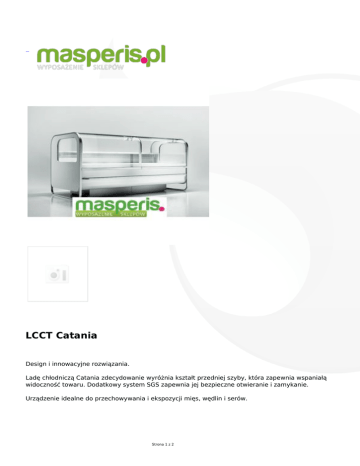 LCCT Catania Design i innowacyjne rozwiązania. Ladę chłodniczą Catania zdecydowanie wyróżnia kształt przedniej szyby, która zapewnia wspaniałą widoczność towaru. Dodatkowy system SGS zapewnia jej bezpieczne otwieranie i zamykanie. Urządzenie idealne do przechowywania i ekspozycji mięs, wędlin i serów. Strona 1 z 2 WYPOSAŻENIE STANDARDOWE chłodzenie dynamiczne system szyb sferycznych SPH 200 szyby frontowe podnoszone na siłownikach – system SGS wnętrze lady z blachy nierdzewnej blat roboczy z konglomeratu termometr elektroniczny odmrażanie naturalne odbojnik aluminiowy zawór rozprężny automatyczne odparowanie skroplin Strona 2 z 2