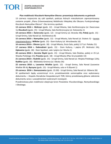 Plan mobilności Kluczbork-Namysłów-Olesno: prezentacja dokumentu w gminach 13 czerwca rozpocznie się cykl spotkań, podczas których mieszkańcom zaprezentowany zostanie projekt „Planu Zrównoważonej Mobilności Miejskiej dla Obszaru Funkcjonalnego Kluczbork-Namysłów-Olesno”. Oto terminy spotkań: 13 czerwca 2016 r. Wołczyn (godz. 12) - Urząd Miasta, Sala Konferencyjna (ul. Dworcowa 1); Kluczbork (godz. 15) - Urząd Miasta, Sala Konferencyjna (ul. Katowicka 1) 14 czerwca 2016 r. Świerczów (godz. 12) - Urząd Gminy (ul. Brzeska 48); Pokój (godz. 15) Urząd Gminy, Sala Narad (ul. Sienkiewicza 8) 15 czerwca 2016 r. Namysłów (godz. 12) - Urząd Miasta, Sala Narad (ul. Dubois 3) – termin niepotwierdzony ; Wilków (godz. 15) - Dom Kultury (ul. Wrocławska 16) 16 czerwca 2016 r. Olesno (godz. 18) - Urząd Miasta, Duża Sala, pokój 117 (ul. Pieloka 21) 17 czerwca 2016 r. Dobrodzień (godz. 15) - Dom Kultury, I piętro (Pl. Wolności 24); Zębowice (godz. 18) - Dom Spotkań, sala I piętro (ul. Murka 1) 20 czerwca 2016 r. Gorzów Śląski (godz. 15) - Urząd Miasta, Sala Ślubów, pokój nr 25 (ul. Wojska Polskiego 15); Praszka (godz. 18) - Urząd Miasta (Plac Grunwaldzki 13) 21 czerwca 2016 r. Rudniki (godz. 15) - Urząd Gminy, Sala Narad (ul. Wojska Polskiego 12A); Radłów (godz. 18) - Biblioteka Gminna (ul. Oleska 3A) 22 czerwca 2016 r.; Lasowice Wielkie (godz. 12) - Urząd Gminy, Sala Narad (Lasowice Wielkie 99 A); Byczyna (godz. 15) - Urząd Miasta, sala nr 9 (Rynek 1) 23 czerwca 2016 r. Domaszowice (godz. 15:30) - Urząd Gminy, Sala Narad (ul. Główna 26) W spotkaniach będą uczestniczyć m.in. przedstawiciele samorządów oraz wykonawcy dokumentu – Zespołu Doradców Gospodarczych TOR, którzy przedstawią główne założenia dokumentu wraz z uzasadnieniem wybranych rozwiązań. Przedmiotowy plan mobilności obejmuje teren Powiatów: Kluczborskiego, Namysłowskiego i Oleskiego. Zespół Doradców Gospodarczych TOR Sp. z o.o. Plac Bankowy 2, 00-095 Warszawa, tel. +48 22 323 77 44; fax. +48 22 468 17 73, e-mail: [email protected] KRS 0000133090, REGON 013175962, NIP 113-20-41-930