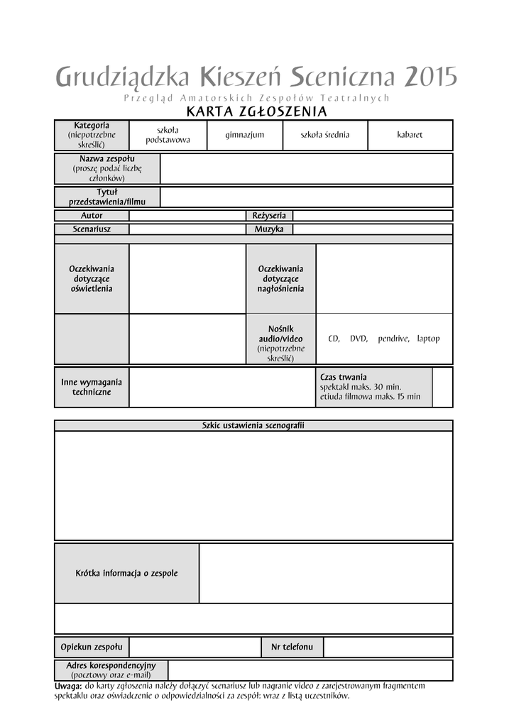 Grudziądzka Kieszeń Sceniczna 2015 Przegląd Amatorskich Zespołów Teatralnych KARTA ZGŁOSZENIA Kategoria (niepotrzebne skreślić) szkoła podstawowa gimnazjum szkoła średnia kabaret Nazwa zespołu (proszę podać liczbę członków) Tytuł przedstawienia/filmu Autor Reżyseria Scenariusz Muzyka Oczekiwania dotyczące oświetlenia Oczekiwania dotyczące nagłośnienia Nośnik audio/video (niepotrzebne skreślić) CD, DVD, pendrive, laptop Czas trwania spektakl maks. 30 min. etiuda filmowa maks. 15 min Inne wymagania techniczne Szkic ustawienia scenografii Krótka informacja o zespole Opiekun zespołu Nr telefonu Adres korespondencyjny (pocztowy oraz e-mail) Uwaga: do karty zgłoszenia należy dołączyć scenariusz lub nagranie video z zarejestrowanym fragmentem spektaklu oraz oświadczenie o odpowiedzialności za zespół: wraz z listą uczestników.