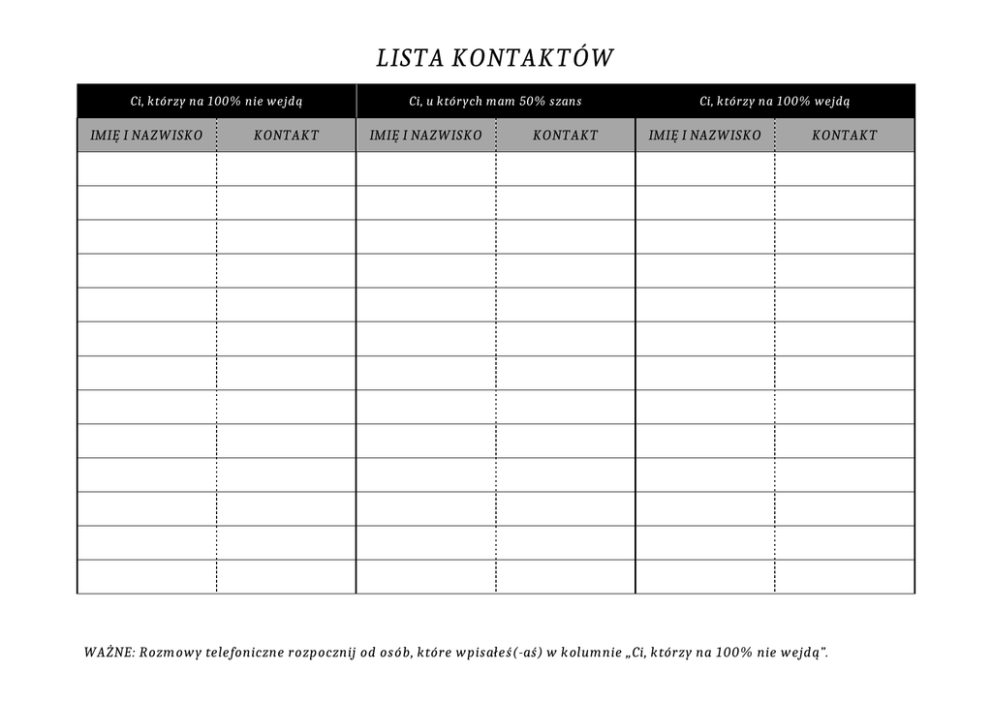 LISTA KONTAKTÓW Ci, którzy na 100% nie wejdą IMIĘ I NAZWISKO KONTAKT Ci, u których mam 50% szans IMIĘ I NAZWISKO KONTAKT Ci, którzy na 100% wejdą IMIĘ I NAZWISKO KONTAKT WAŻNE: Rozmowy telefoniczne rozpocznij od osób, które wpisałeś(-aś) w kolumnie „Ci, którzy na 100% nie wejdą”. LISTA KONTAKTÓW WAŻNE: Rozmowy telefoniczne rozpocznij od osób, które wpisałeś(-aś) w kolumnie „Ci, którzy na 100% nie wejdą”.