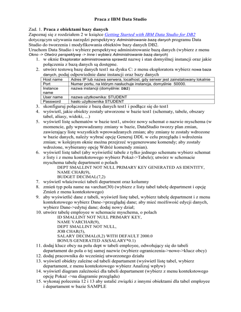 Praca z IBM Data Studio Zad. 1. Praca z obiektami bazy danych Zapoznaj się z rozdziałem 2 w książce Getting Started with IBM Data Studio for DB2 dotyczącym używania narzędzi perspektywy Administrowanie bazą danych programu Data Studio do tworzenia i modyfikowania obiektów bazy danych DB2. Uruchom Data Studio i wybierz perspektywę administrowanie bazą danych (wybierz z menu Okno -> Otwórz perspektywę -> Inne i wybierz Administrowanie bazą danych) 1. w oknie Eksplorator administrowania sprawdź nazwę i stan domyślnej instancji oraz jakie połączenia z bazą danych są dostępne. 2. utwórz testową bazę danych test1 na dysku C: z menu eksploratora wybierz nowa baza danych, podaj odpowiednie dane instancji oraz bazy danych Host name Port Instance name User name Password Adres IP lub nazwa serwera, localhost, gdy serwer jest zainstalowany lokalnie Numer portu, na którym nasłuchuje instancja, domyślnie 50000. nazwa instancji (domyślnie: DB2) nazwa użytkownika: STUDENT hasło użytkownika STUDENT 3. skonfiguruj połączenie z bazą danych test1 i podłącz się do test1 4. wyświetl, jakie obiekty zostały utworzone w bazie test1 (schematy, tabele, obszary tabel, aliasy, widoki, ...) 5. wyświetl listę schematów w bazie test1, utwórz nowy schemat o nazwie myschema (w momencie, gdy wprowadzamy zmiany w bazie, DataStudio tworzy plan zmian, zawierający listę wszystkich wprowadzanych zmian; aby zmiany te zostały wdrozone w bazie danych, należy wybrać opcję Generuj DDL w celu przeglądu i wdrożenia zmian; w kolejnym oknie można przejrzeć wygenerowane komendy; aby zostały wdrożone, wybieramy opcję Wdróż komendy zmian). 6. wyświetl listę tabel (aby wyświetlić tabele z tylko jednego schematu wybierz schemat z listy i z menu kontekstowego wybierz Pokaż->Tabele); utwórz w schemacie myschema tabelę department o polach DEPT SMALLINT NOT NULL PRIMARY KEY GENERATED AS IDENTITY, NAME CHAR(9), BUDGET DECIMAL(7,2) 7. wyświetl właściwości tabeli department oraz kolumny 8. zmień typ pola name na varchar(30) (wybierz z listy tabel tabelę department i opcję Zmień z menu kontekstowego) 9. aby wyświetlić dane z tabeli, wyświetl listę tabel, wybierz tabelę department i z menu kontekstowego wybierz Dane->przeglądaj dane; aby mieć możliwość edycji danych, wybierz Dane->edytuj dane; dodaj nowy dział; 10. utwórz tabelę employee w schemacie myschema, o polach ID SMALLINT NOT NULL PRIMARY KEY, NAME VARCHAR(9), DEPT SMALLINT NOT NULL, JOB CHAR(5), SALARY DECIMAL(8,2) WITH DEFAULT 2000.0 BONUS GENERATED AS(SALARY*0.1) 11. dodaj klucz obcy na polu dept w tabeli employee, odwołujący się do tabeli departament do pola o tej samej nazwie (wybierz ograniczenia->nowe->klucz obcy) 12. dodaj pracownika do wcześniej utworzonego działu 13. wyświetl obiekty zależne od tabeli departament (wyświetl listę tabel, wybierz departament, z menu kontekstowego wybierz Analizuj wpływ) 14. wyświetl diagram zależności dla tabeli departament (wybierz z menu kontekstowego opcję Pokaż ->na diagramie przeglądu) 15. wykonaj polecenia 12 i 13 aby ustalić związki z innymi obiektami dla tabel employee i departament w bazie SAMPLE