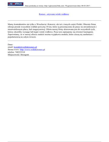 Dane pochodzą ze strony: http://ogloszenia24uk.com/. Wygenerowano dnia: 08-03-2017. Romex - używane wózki widłowe Mamy kontrahentów nie tylko z Wrocławia i Katowic, ale też z innych części Polski. Obecnie firma oferuje przede wszystkim widlaki powyżej 10 ton, które są przeznaczone do pracy na utwardzonym i nieutwardzonym placu, hali magazynowej. Oferta naszej firmy skierowana jest do wszystkich tych, którzy chcieliby wynająć lub kupić wózki widłowe. Poza tym zajmujemy się również leasingiem. Zapewniamy, że w naszej ofercie znaleźć można wyjątkowe modele, które cieszą się zaufaniem i popularnością na całym świecie. Dane: email: [email protected] Strona www: http://www.widlakiromex.pl telefon: 748555510 Miejscowość: Strzegom