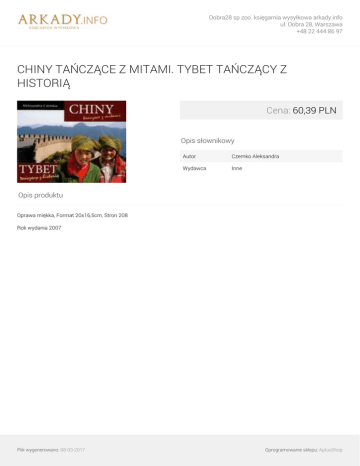 Dobra28 sp zoo. księgarnia wysyłkowa arkady.info ul. Dobra 28, Warszawa +48 22 444 86 97 CHINY TAŃCZĄCE Z MITAMI. TYBET TAŃCZĄCY Z HISTORIĄ Cena: 60,39 PLN Opis słownikowy Autor Czemko Aleksandra Wydawca Inne Opis produktu Oprawa miękka, Format 20x16,5cm, Stron 208 Rok wydania 2007 Plik wygenerowano: 08-03-2017 Powered by TCPDF (www.tcpdf.org) Oprogramowanie sklepu: AptusShop