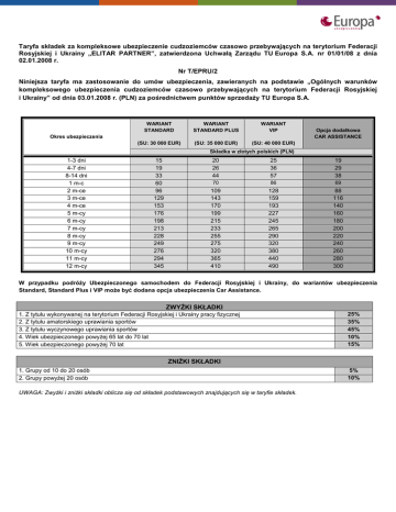 Taryfa składek za kompleksowe ubezpieczenie cudzoziemców czasowo przebywających na terytorium Federacji Rosyjskiej i Ukrainy „ELITAR PARTNER”, zatwierdzona Uchwałą Zarządu TU Europa S.A. nr 01/01/08 z dnia 02.01.2008 r. Nr T/EPRU/2 Niniejsza taryfa ma zastosowanie do umów ubezpieczenia, zawieranych na podstawie „Ogólnych warunków kompleksowego ubezpieczenia cudzoziemców czasowo przebywających na terytorium Federacji Rosyjskiej i Ukrainy” od dnia 03.01.2008 r. (PLN) za pośrednictwem punktów sprzedaży TU Europa S.A. WARIANT STANDARD WARIANT STANDARD PLUS WARIANT VIP (SU: 30 000 EUR) (SU: 35 000 EUR) (SU: 40 000 EUR) Okres ubezpieczenia Opcja dodatkowa CAR ASSISTANCE Składka w złotych polskich (PLN) 1-3 dni 4-7 dni 8-14 dni 1 m-c 2 m-ce 3 m-ce 4 m-ce 5 m-cy 6 m-cy 7 m-cy 8 m-cy 9 m-cy 10 m-cy 11 m-cy 12 m-cy 15 19 33 60 96 129 153 176 198 213 228 249 276 294 345 20 26 44 25 36 57 19 29 38 70 86 69 109 143 170 199 215 233 255 275 320 365 410 128 159 193 227 245 265 290 320 380 440 490 88 116 140 160 180 200 220 240 260 280 300 W przypadku podróży Ubezpieczonego samochodem do Federacji Rosyjskiej i Ukrainy, do wariantów ubezpieczenia Standard, Standard Plus i VIP może być dodana opcja ubezpieczenia Car Assistance. ZWYŻKI SKŁADKI 1. Z tytułu wykonywanej na terytorium Federacji Rosyjskiej i Ukrainy pracy fizycznej 2. Z tytułu amatorskiego uprawiania sportów 3. Z tytułu wyczynowego uprawiania sportów 4. Wiek ubezpieczonego powyżej 65 lat do 70 lat 5. Wiek ubezpieczonego powyżej 70 lat 25% 35% 45% 10% 15% ZNIŻKI SKŁADKI 1. Grupy od 10 do 20 osób 2. Grupy powyżej 20 osób UWAGA: Zwyżki i zniżki składki oblicza się od składek podstawowych znajdujących się w taryfie składek. 5% 10%
